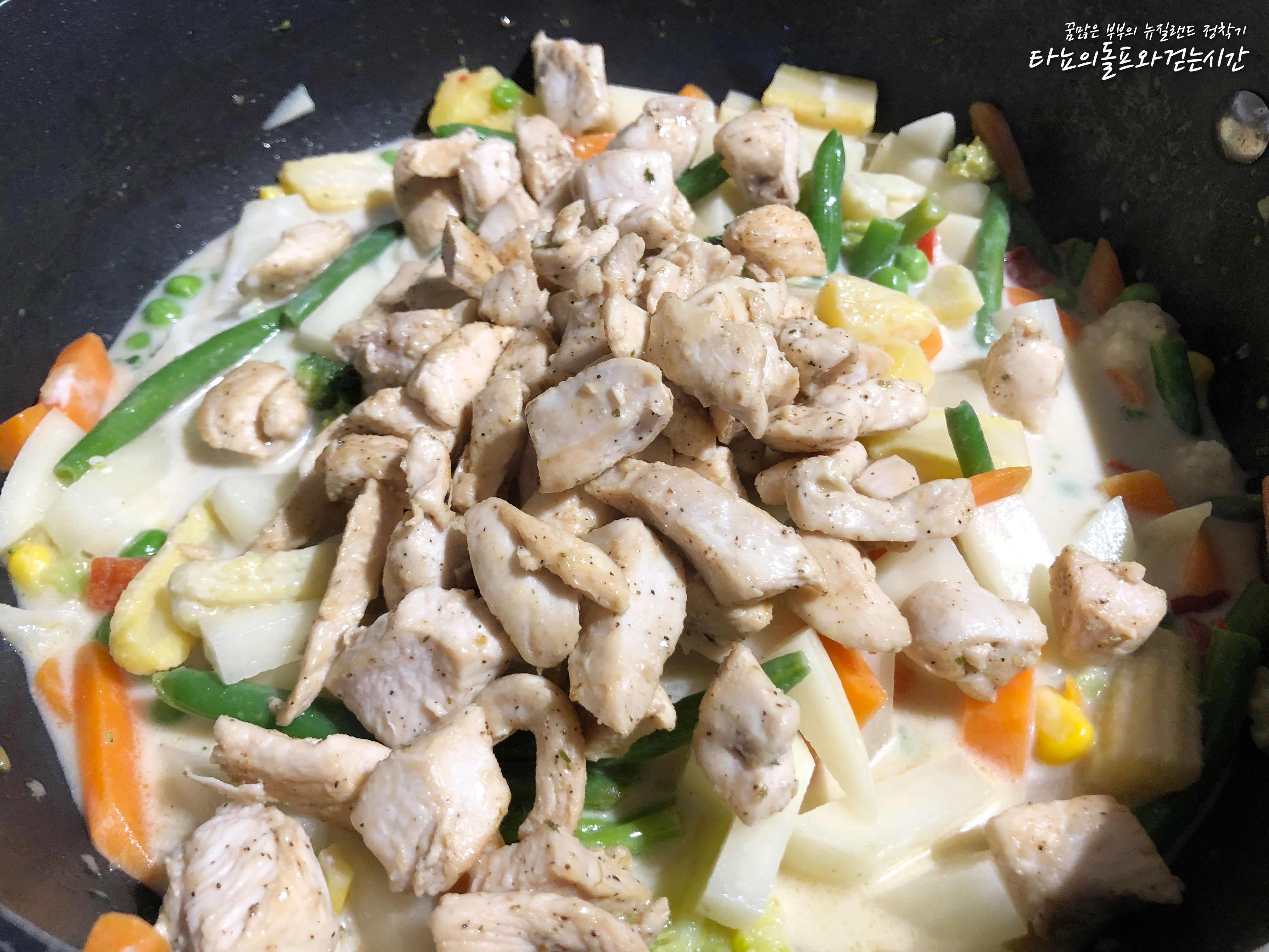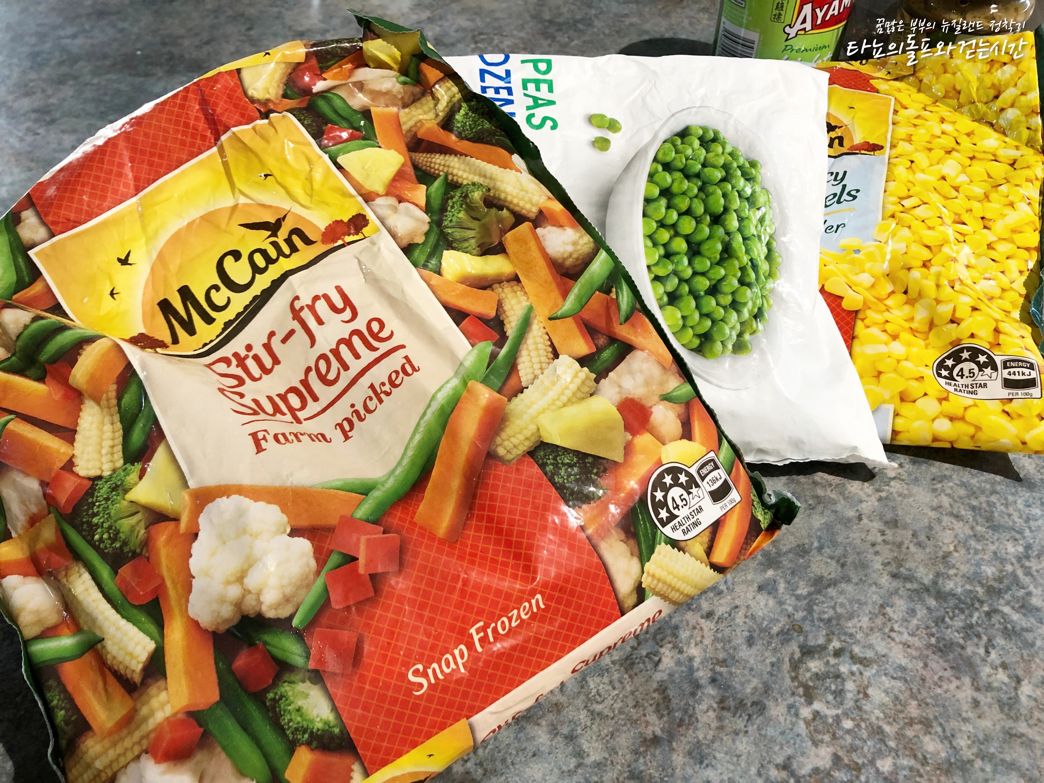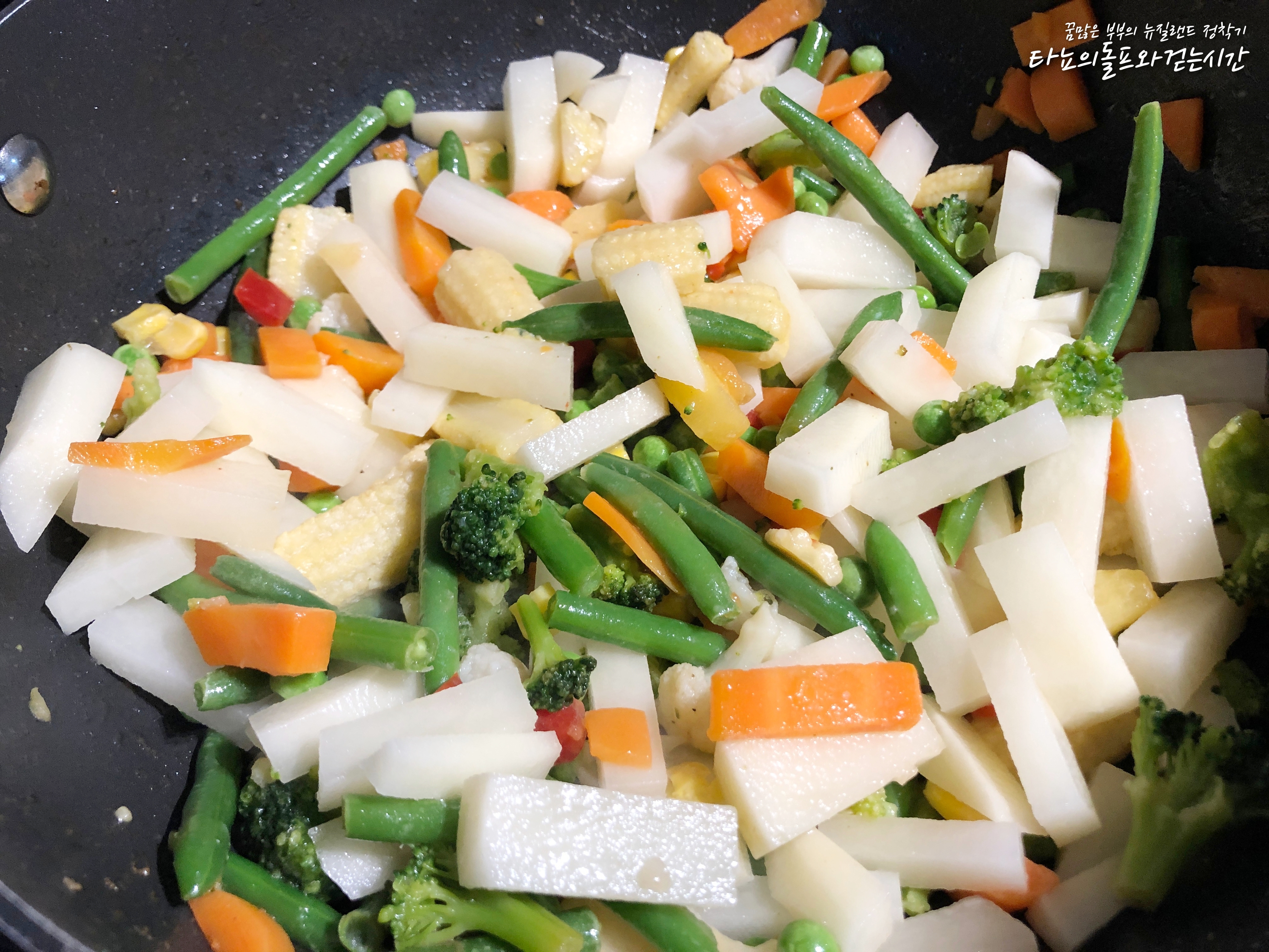 집에 있는 것이 냉동야채믹스 뿐이라서 감자 외에는 모두 냉동야채를 사용했어요. 제가 사용한 냉동야채 믹스에는 브로콜리, 콜리플라워, 당근, 어린 옥수수, 완두콩, 옥수수, 파프리카, 빈, 파인애플 등이 들어가 있었어요. 뉴질랜드는 워낙 냉동야채 종류가 다양하게 잘 나오는 편이라 볶음밥을 하거나 카레를 끓일 때도 종종 사용하고 있답니다. 스테이크를 먹을 때 볶아서 곁들여도 아주 멋진 반찬이 되지요. 특히 요즘처럼 야채값이 금값인 겨울에는 더욱 애정하는 제품입니다.