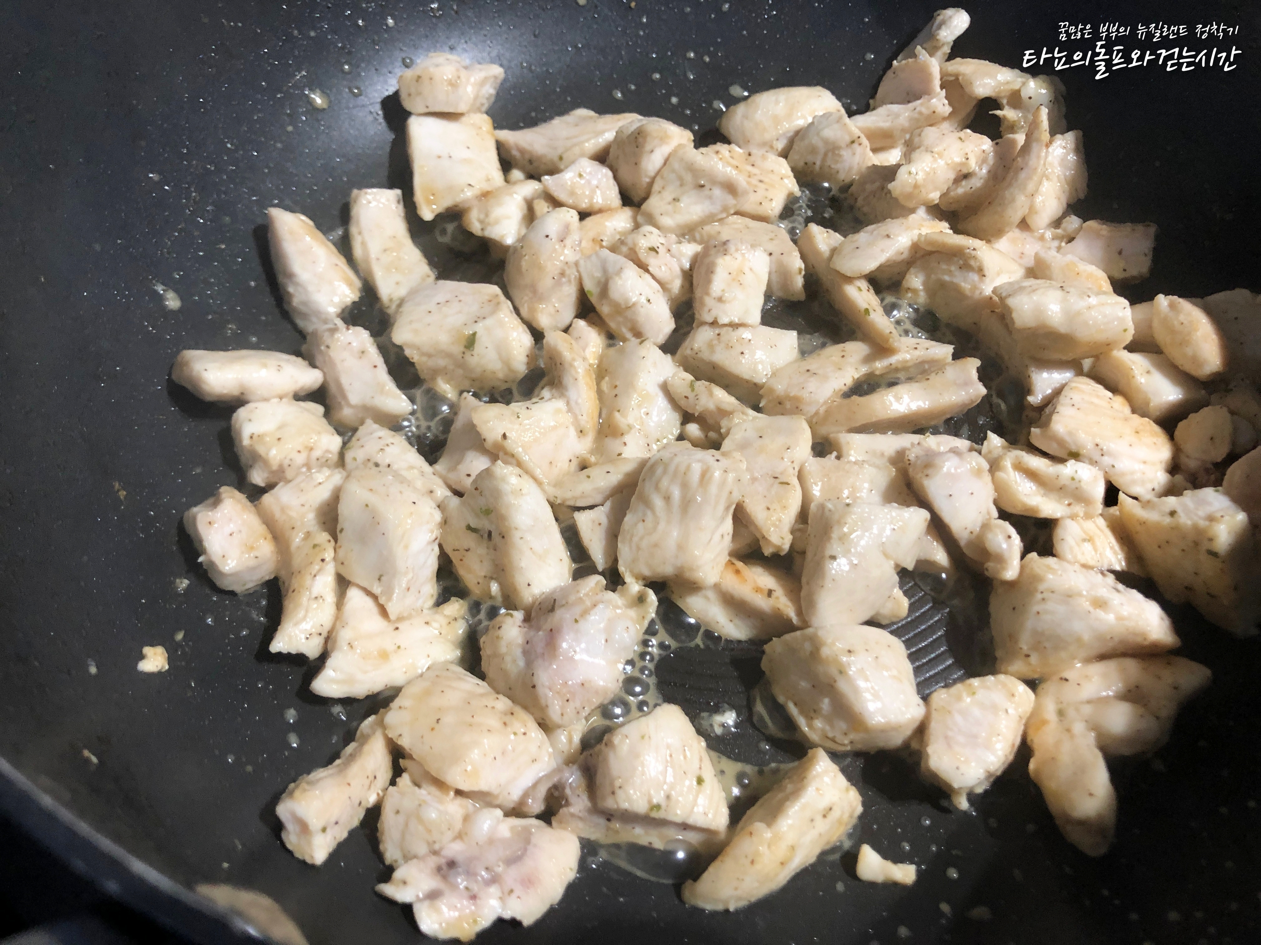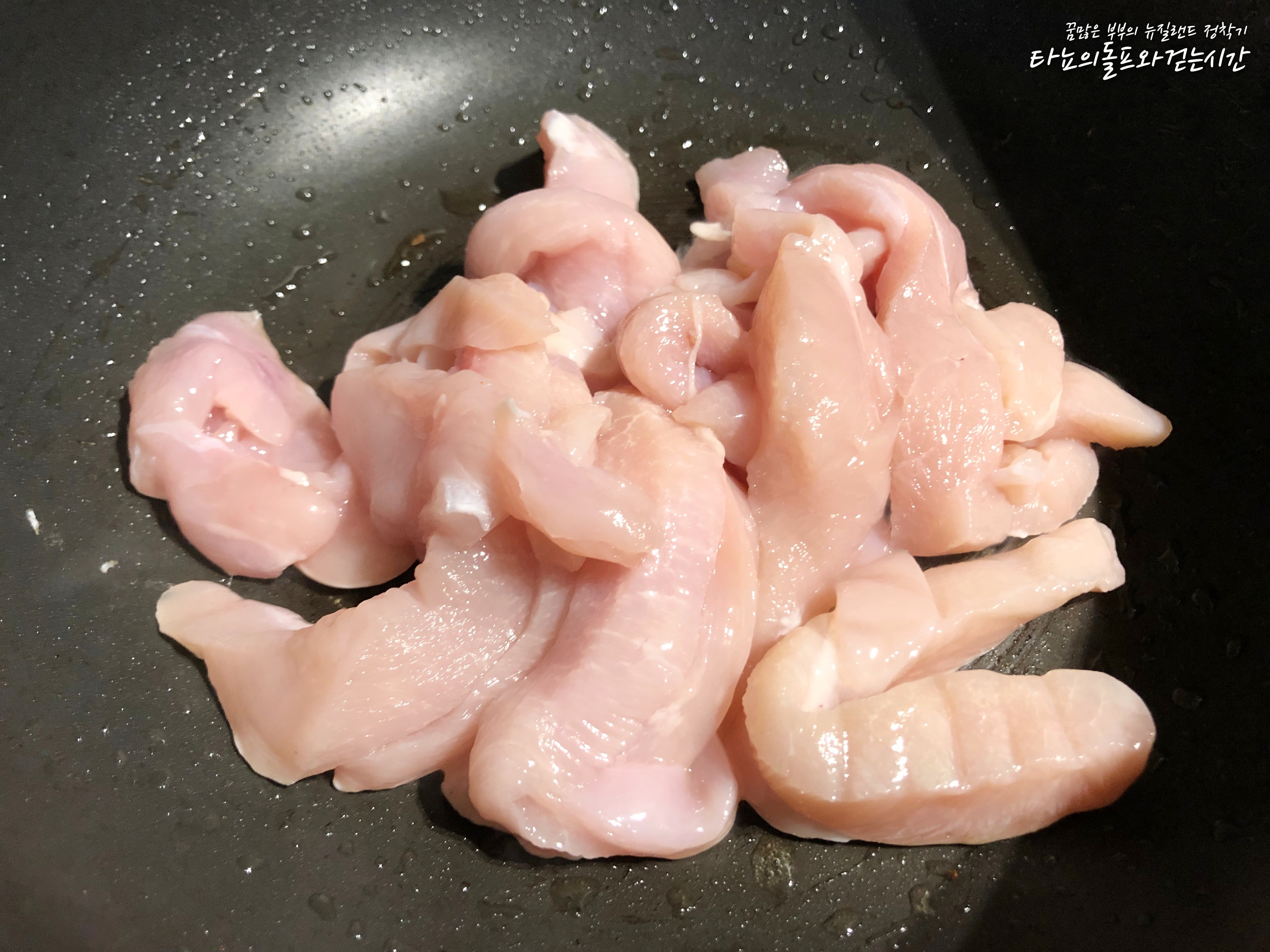 코코넛 크림을 넣어서 녹여준 다음 미리 준비했던 닭가슴살을 넣어줬어요. 순식간에 코코넛 크림이 녹아서 우유처럼 변했어요.