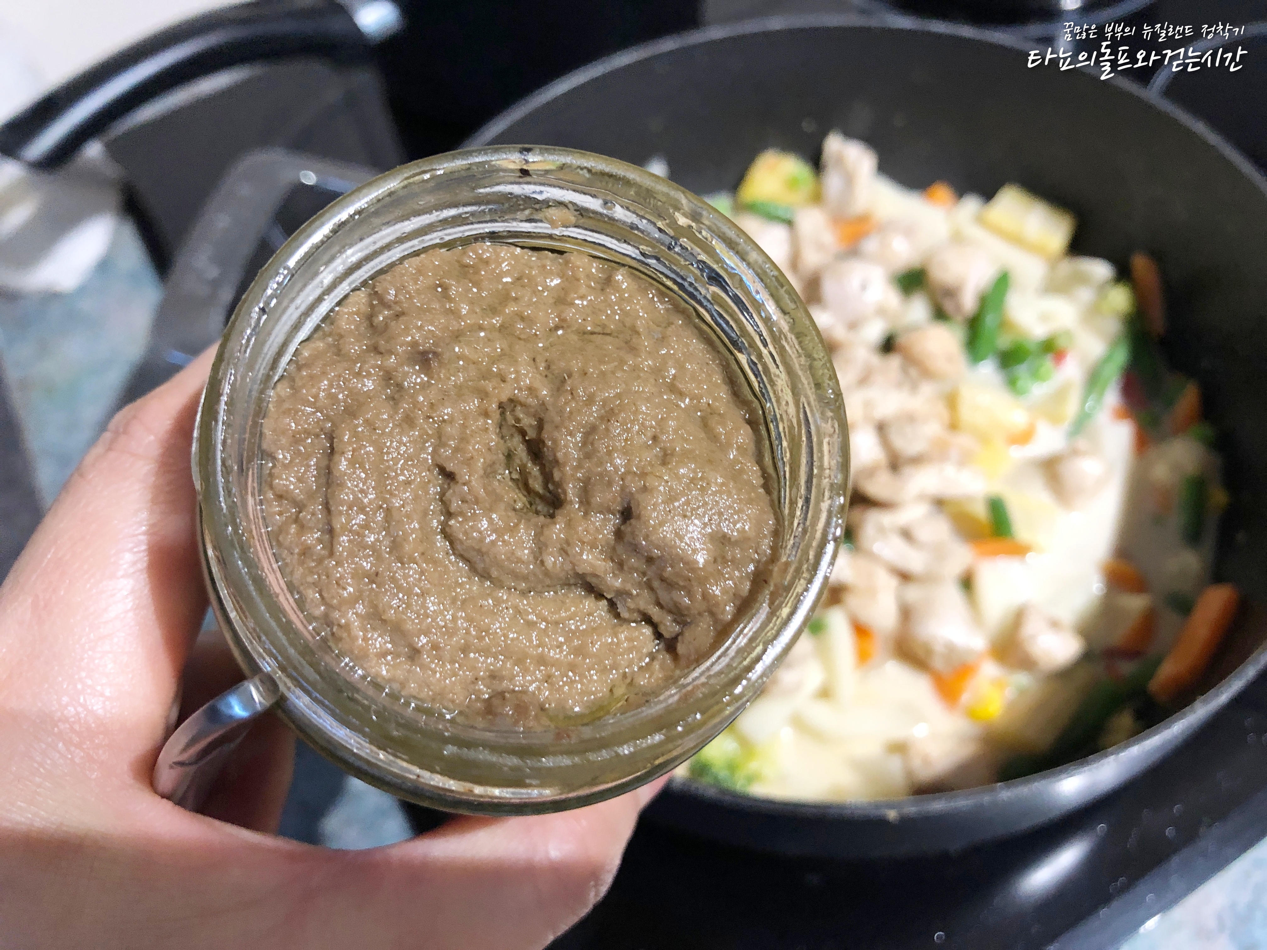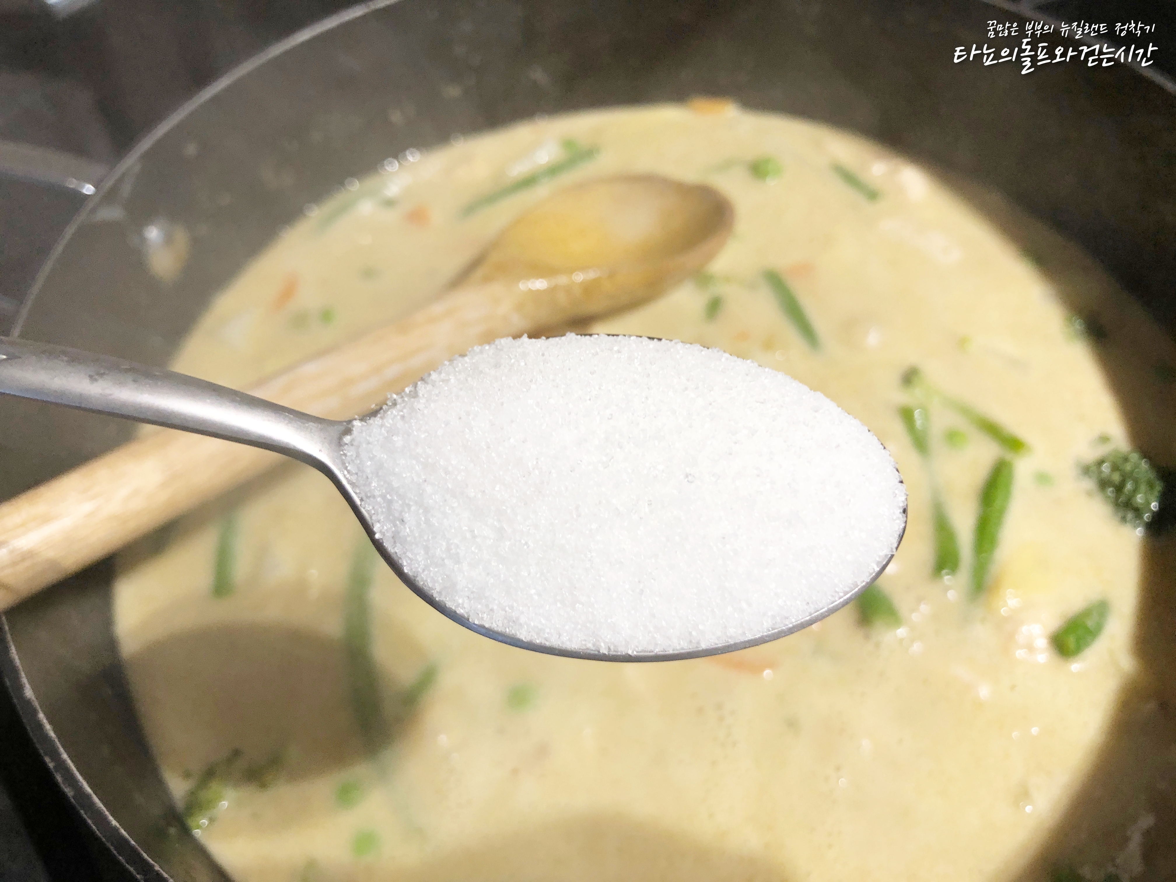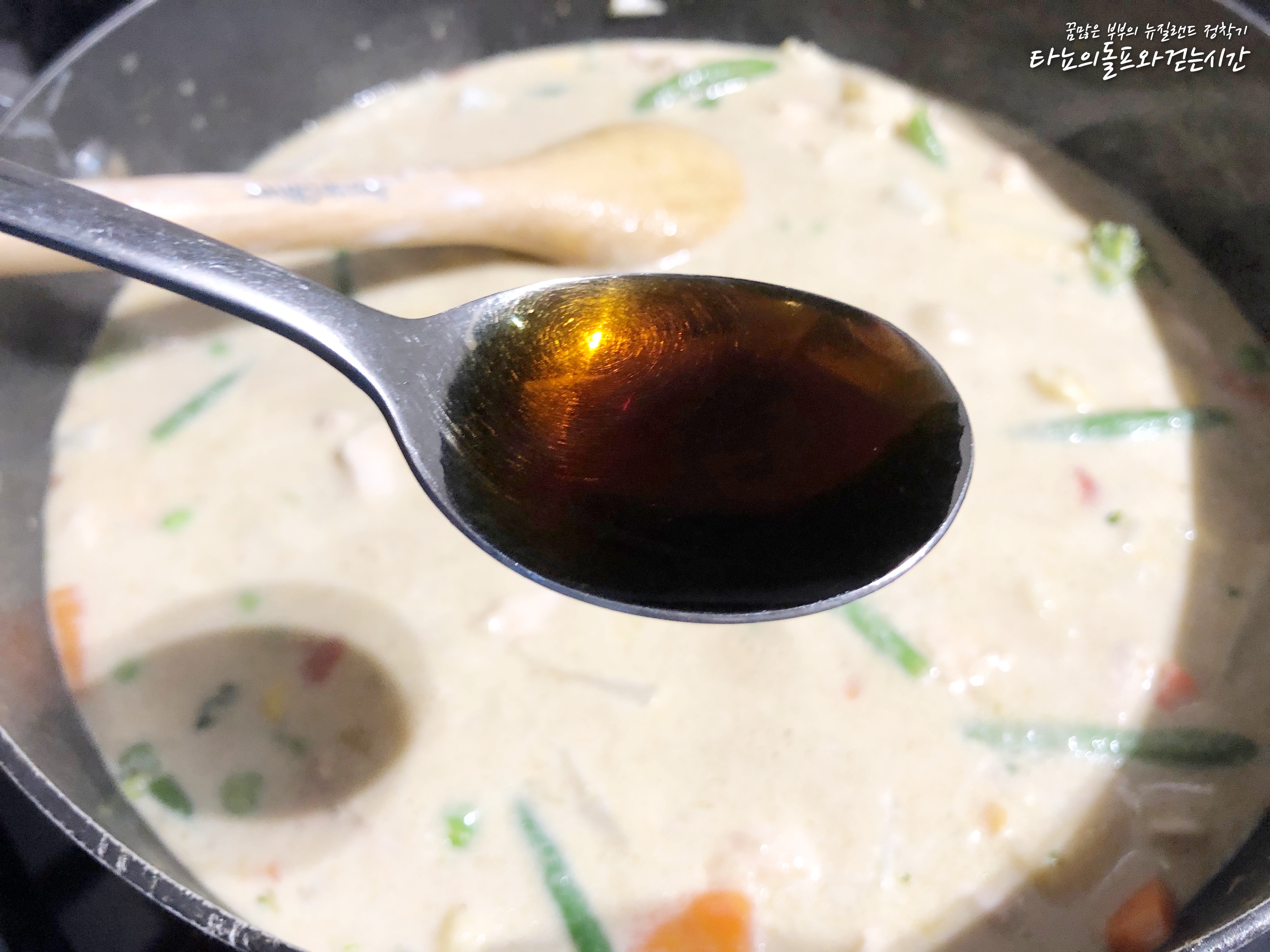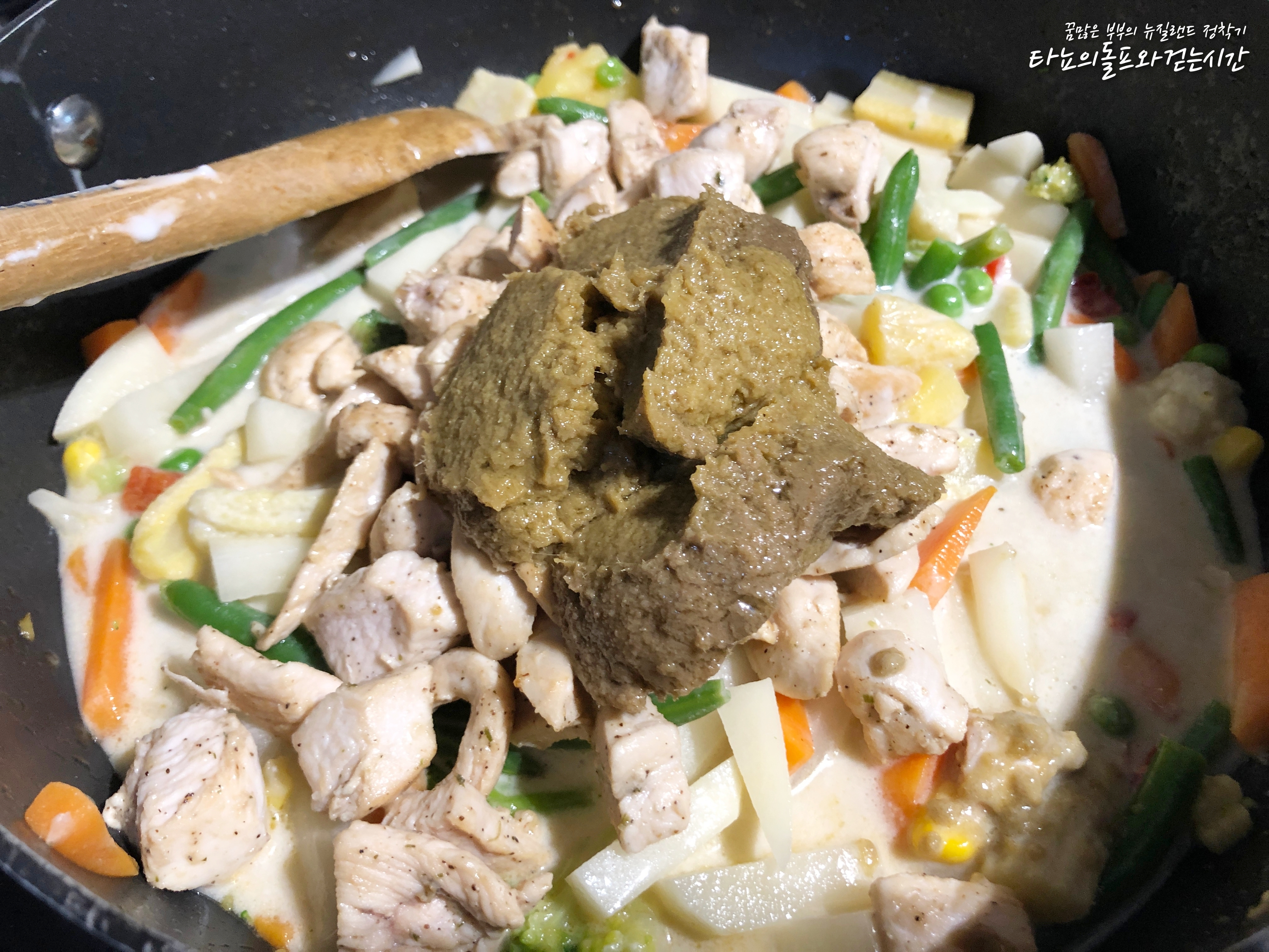 그다음 그린커리 페이스트를 넣어줬어요. 그린커리 페이스트의 맛을 많이 좋아한다면 제가 넣은 것보다 더 많이 넣어도 됩니다. 그린커리 페이스트 자체에 간이 되어 있기 때문에 짜지 않을 선에서 자유롭게 더 추가하셔도 될 것 같아요.