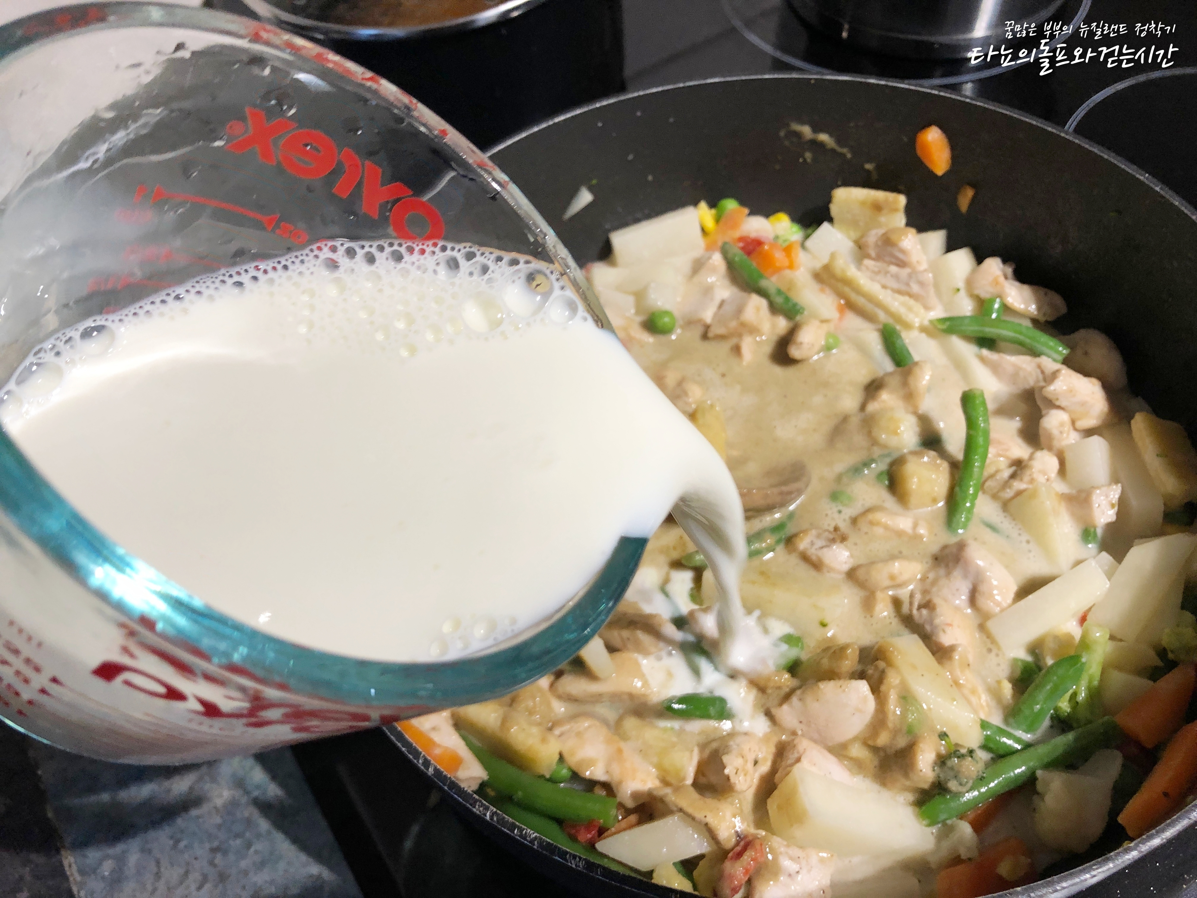 준비한 우유를 넣어주세요. 그린커리에는 물이 따로 들어가지 않아요. 우유와 코코넛 크림으로 대신하죠. 우유와 코코넛 크림이 들어가서 고소한 맛이 굉장히 강한 것 같아요.