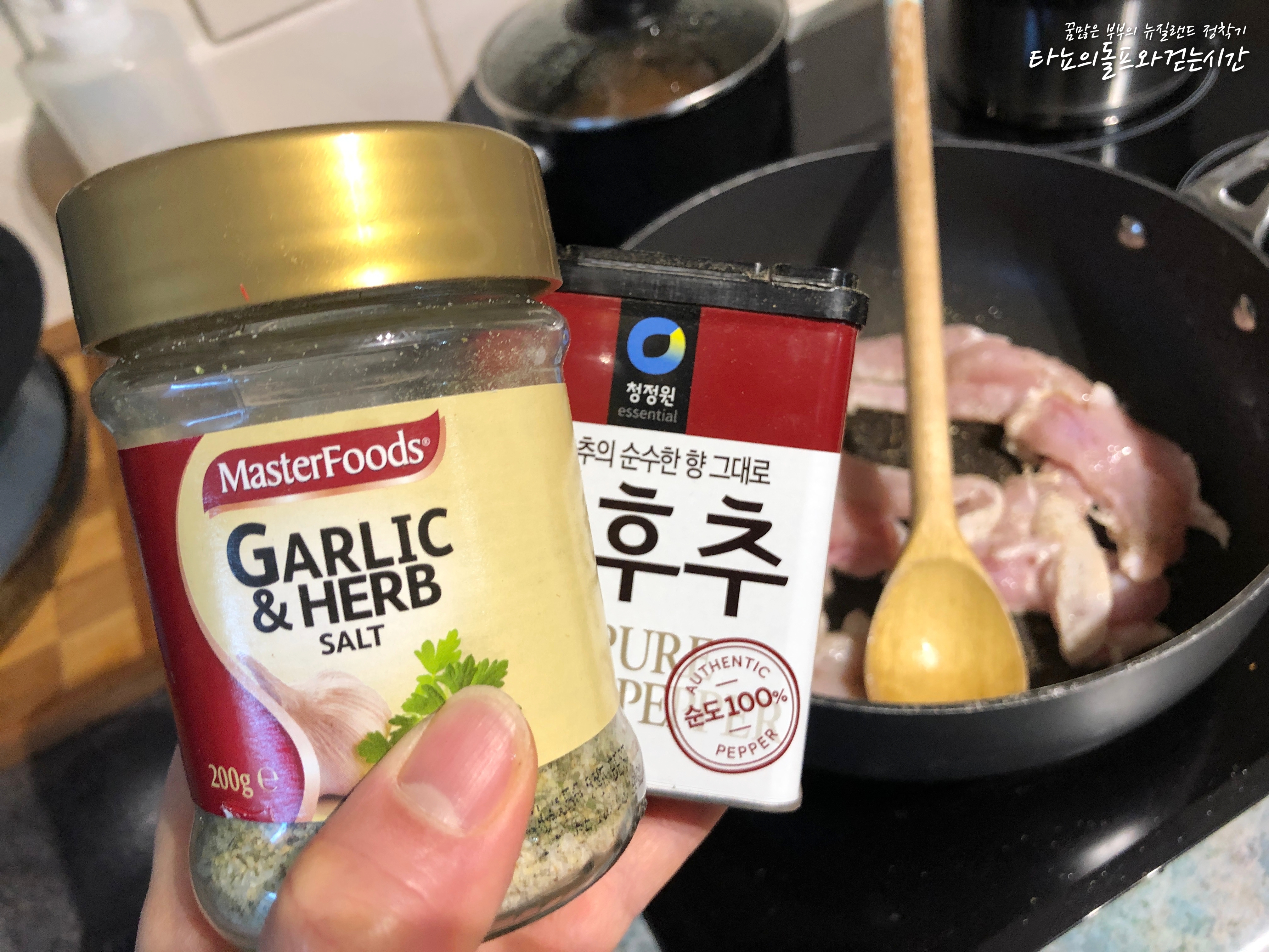 뜨겁게 달궈진 팬에 기름을 아주 살짝 두르고 후추와 갈릭허브솔트로 아주 가볍게 간을 해줬어요. 볶을 때 수분이 꽤 나오는 편인데요. 달달 볶아서 수분을 몽땅 날려 보내주세요.