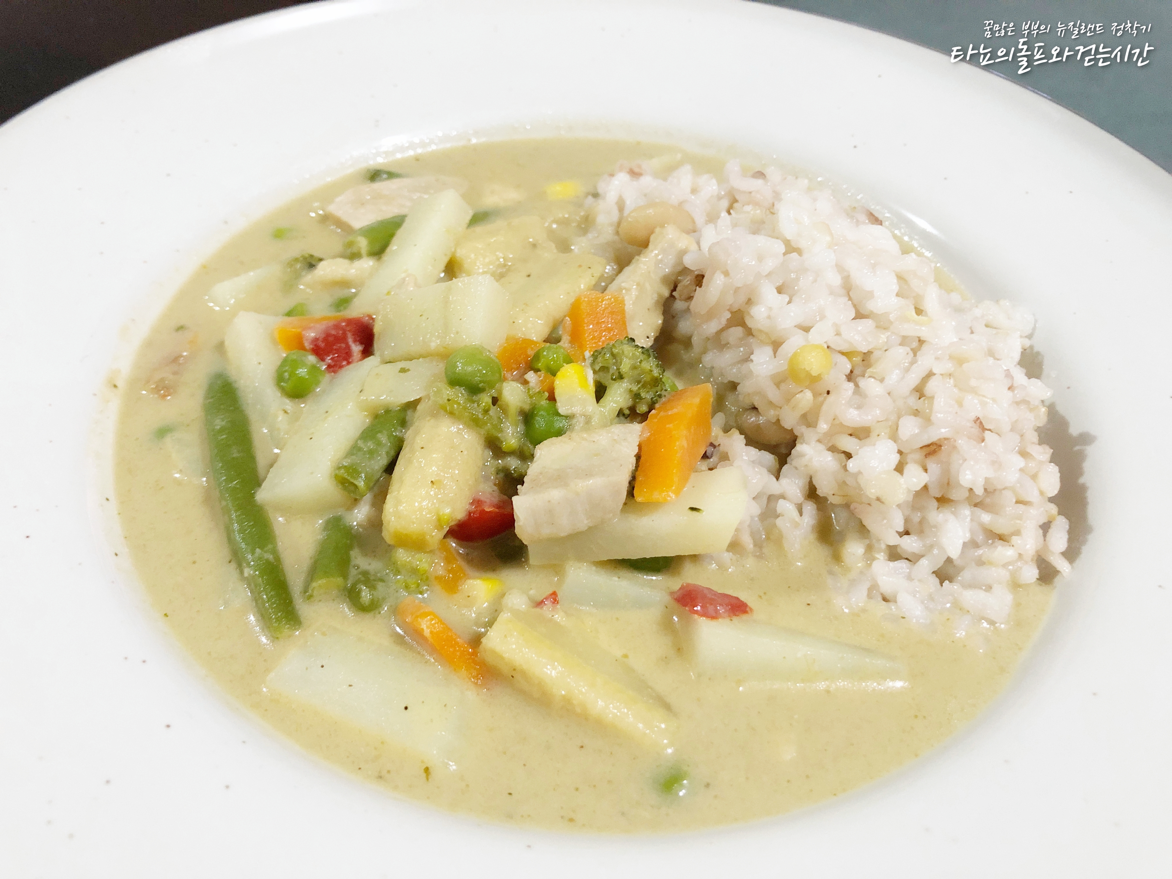 짜잔, 맛있는 그린커리가 완성이 되었어요. 닭고기와 야채 달달 볶은 다음 코코넛 크림, 그린커리 페이스트, 우유, 피시소스, 설탕, 식초 넣고 아주 간단하고 맛있는 그린커리가 만들어졌어요. 재료도 깔끔하고 맛은 더 좋고! 생각보다 거부감이 드는 특유의 향이 나지 않아서 더 맛있게 잘 먹는 것 같습니다.