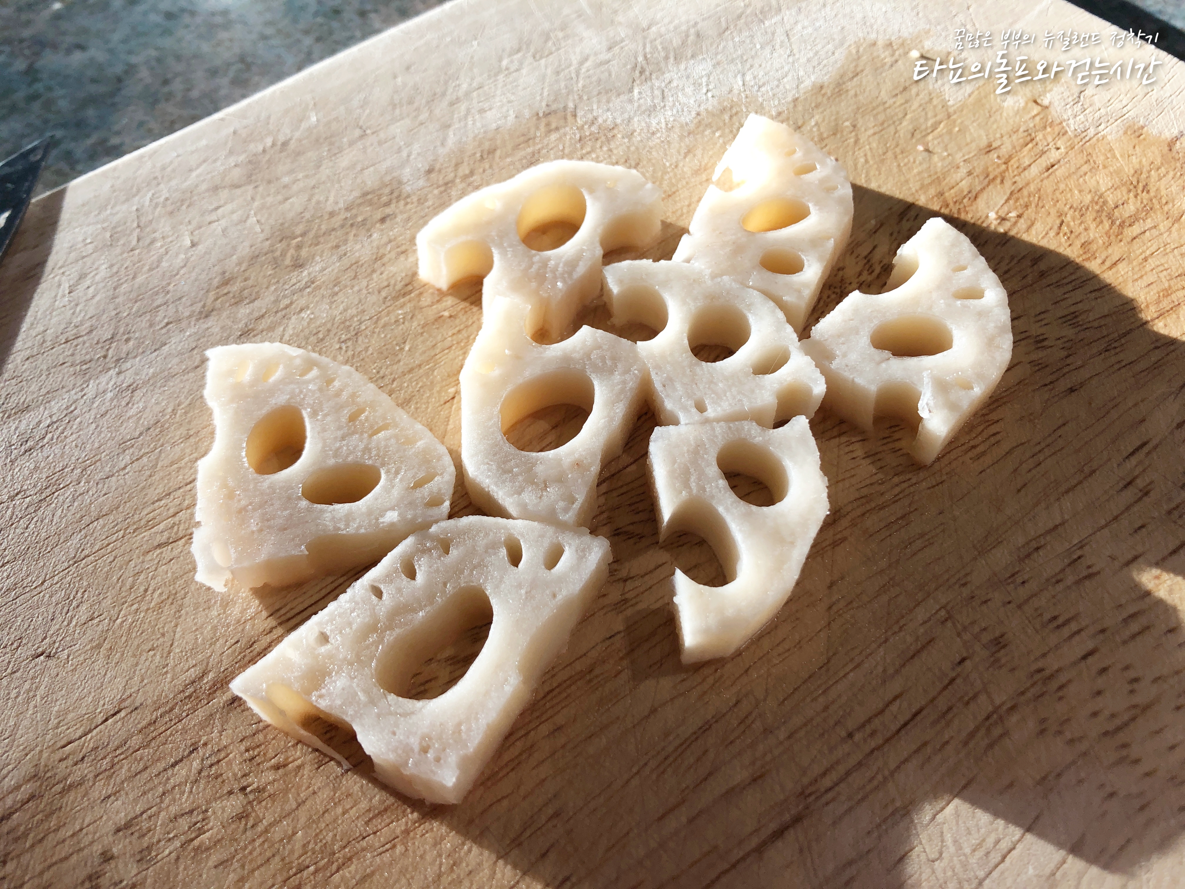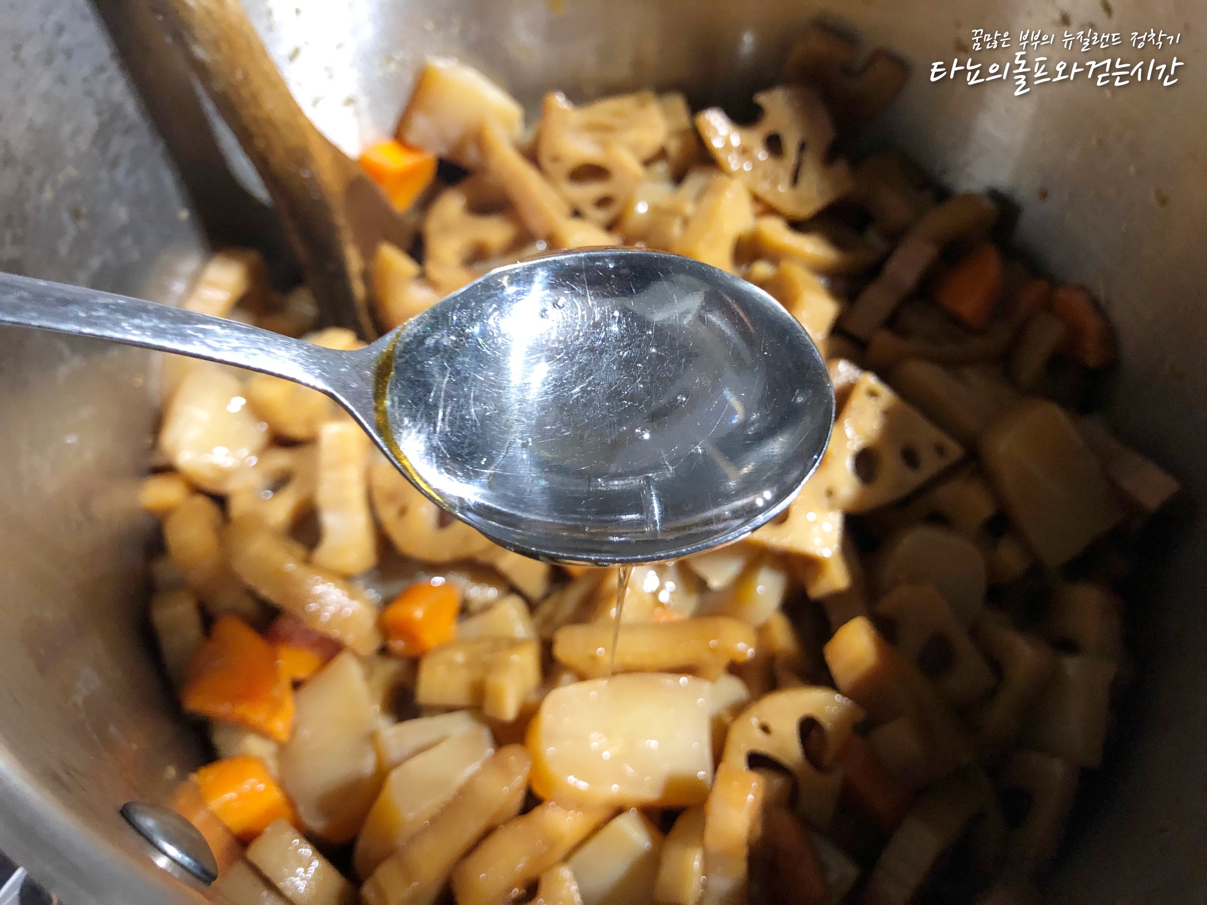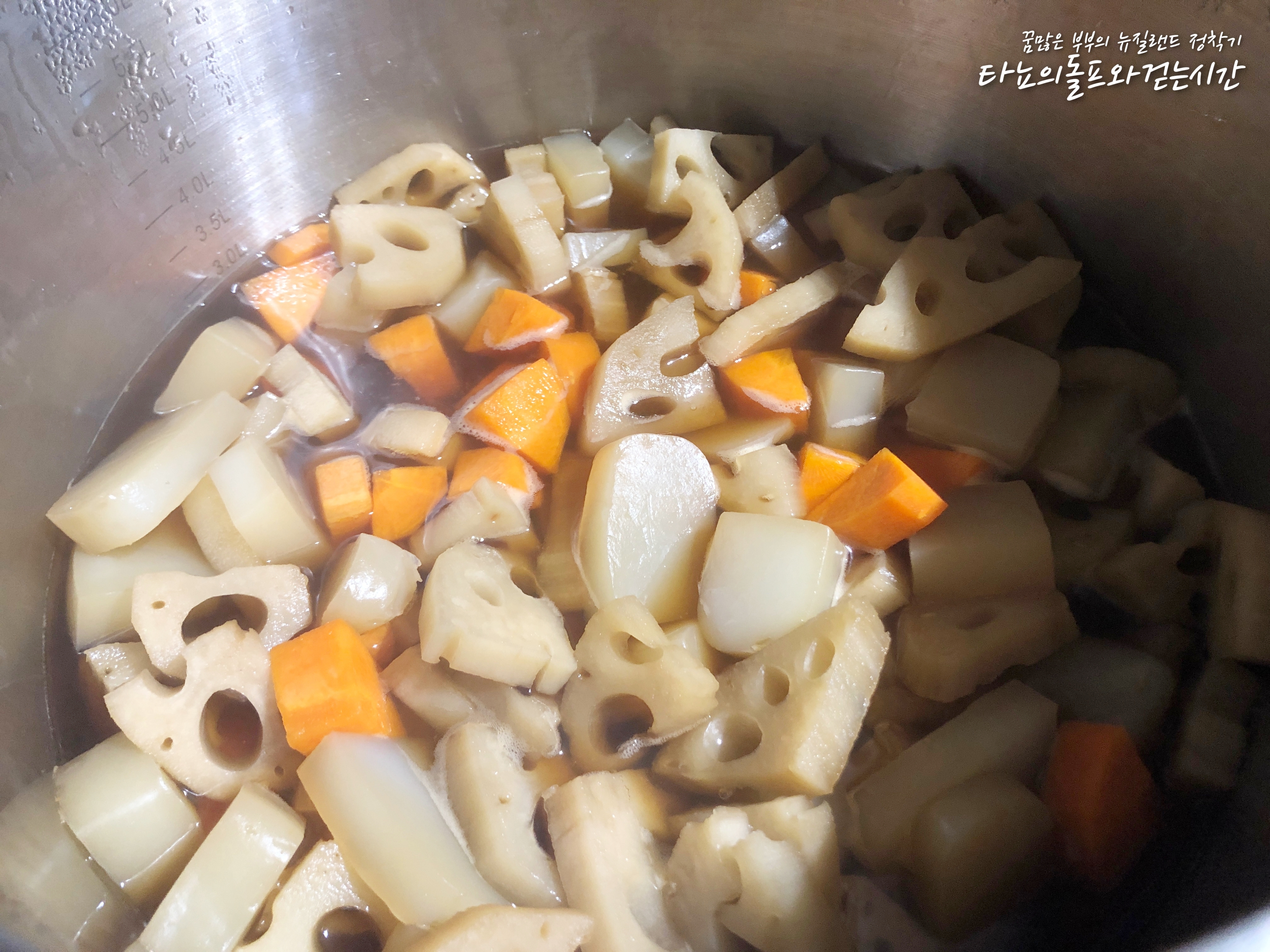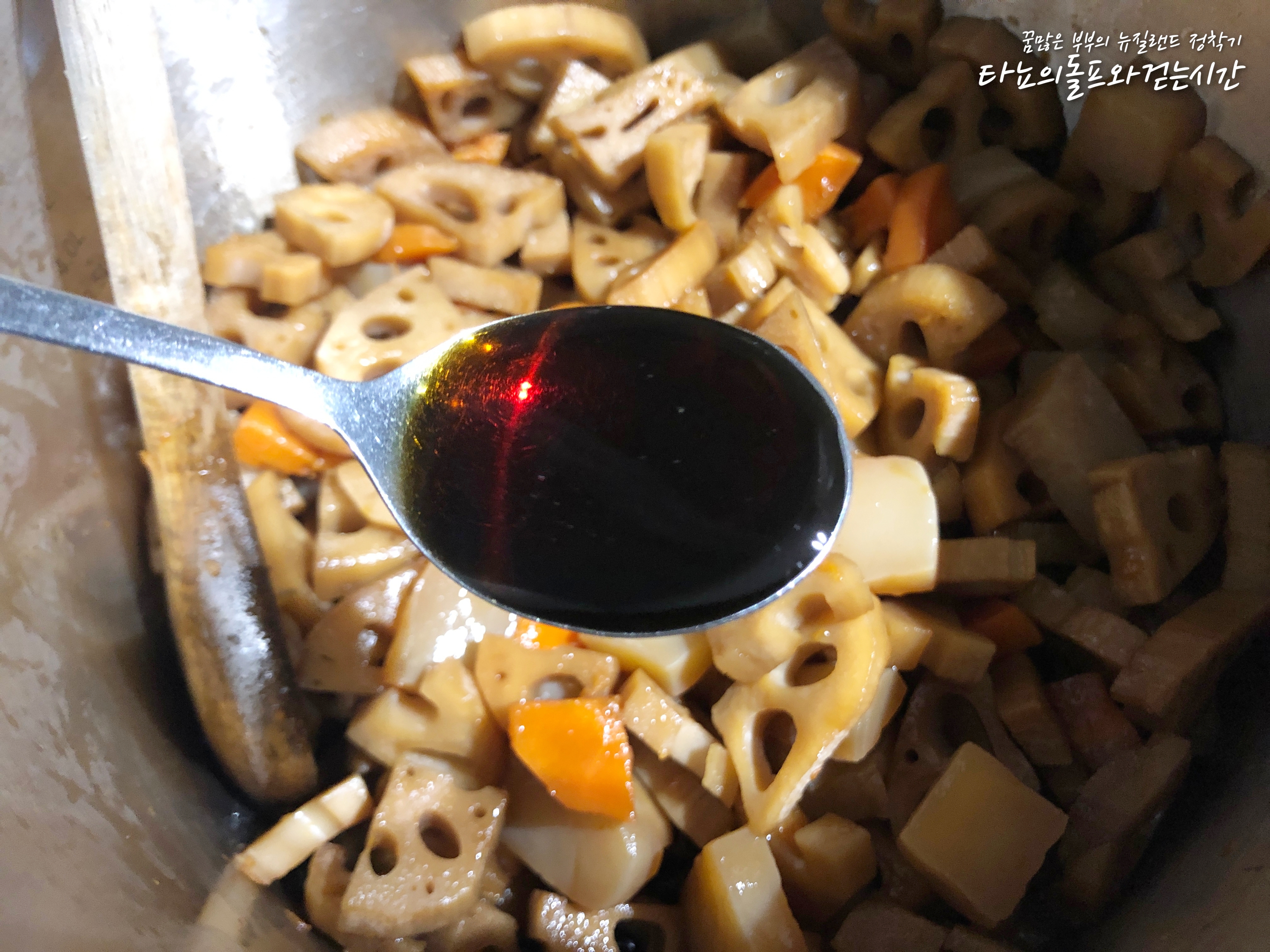한동안 냉장고에 없었던 연근조림을 좀 만들어야겠다는 생각을 했어요. 마침 코스코(한인마트)에 갔더니 국산 연근이 들어왔더라고요. 물론 냉동이긴 하지만, 그래도 좋아요. 뉴질랜드에서는 연근이 나지 않기 때문에 보통 수입을 하는데 대부분 일본산 연근이에요. 요즘 같은 시국에는 아무래도 일본산에 눈길이 더 가지 않는 것 같아요.