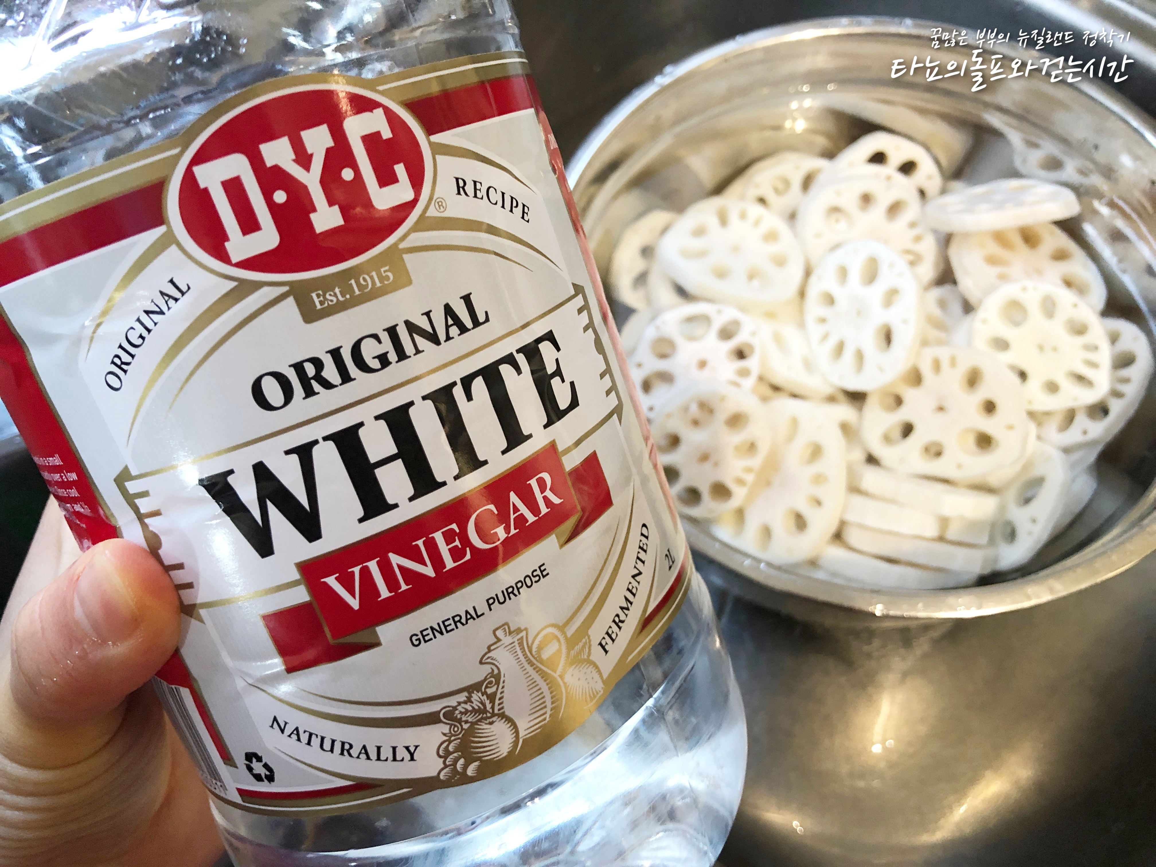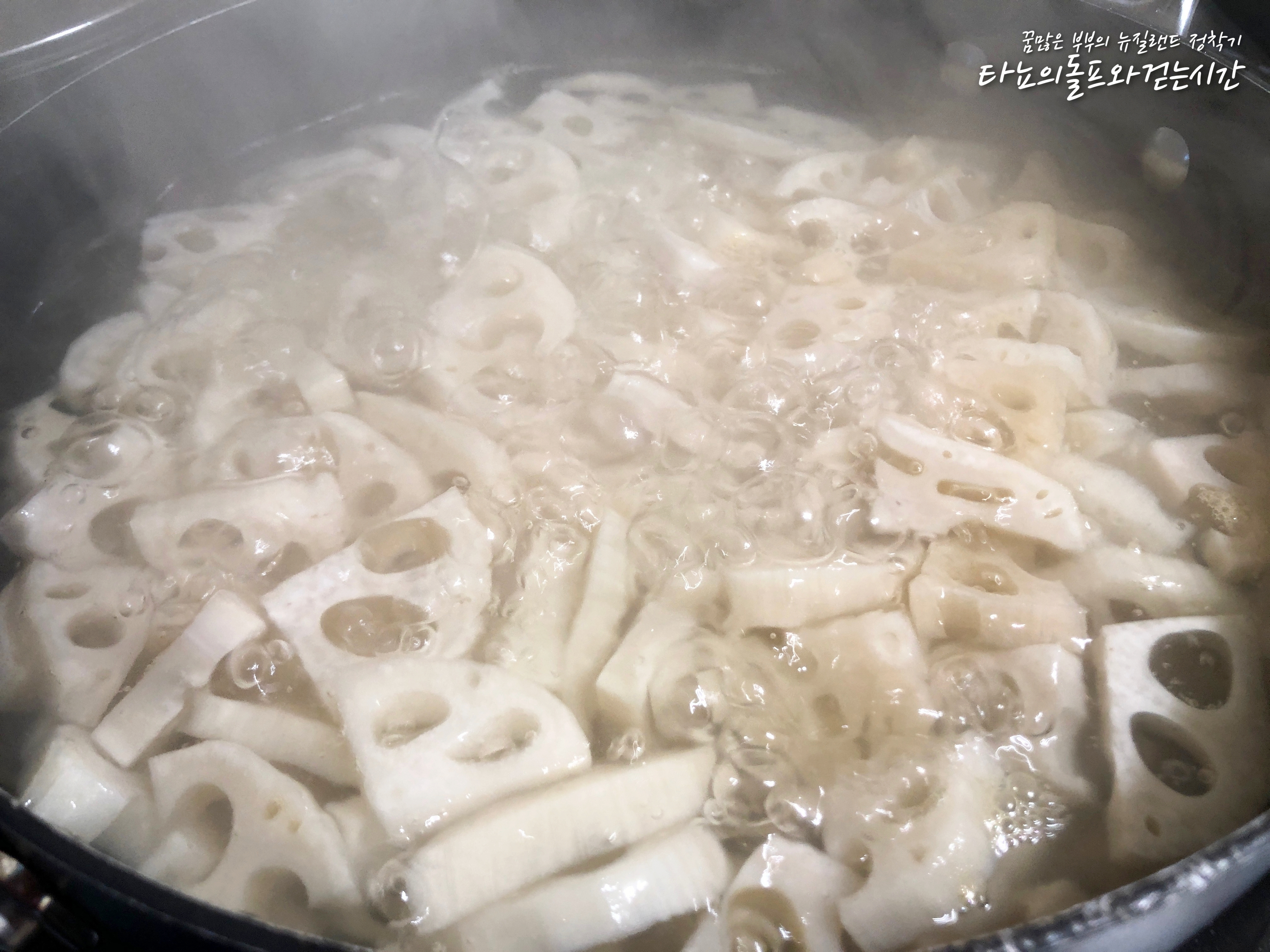연근은 식초물(1/2컵)에 10분 이상 담가서 쓴 맛과 떫은맛을 제거해주세요. 그래도 약간 불안하다면 식초물에 끓이는 게 가장 확실합니다.