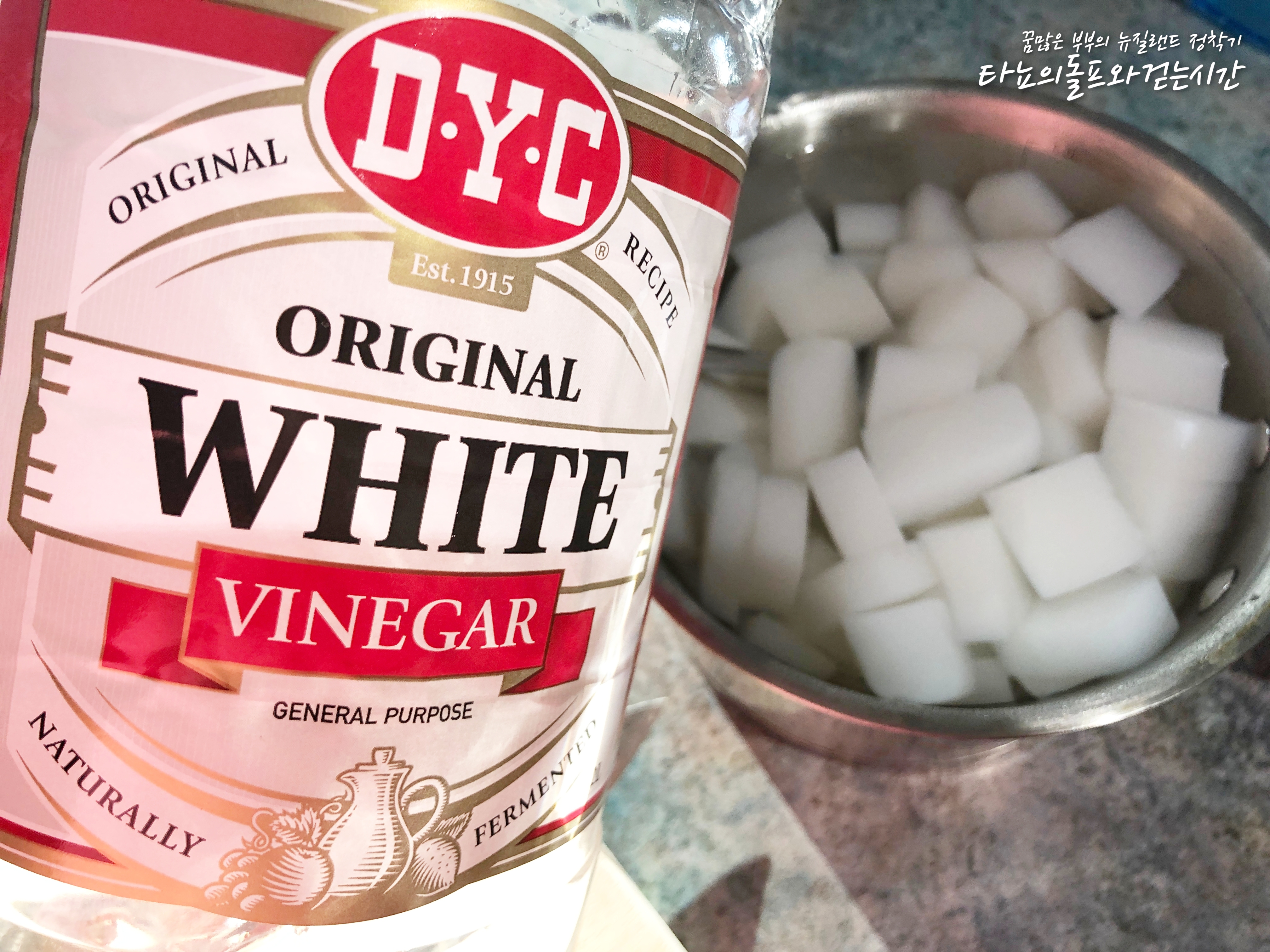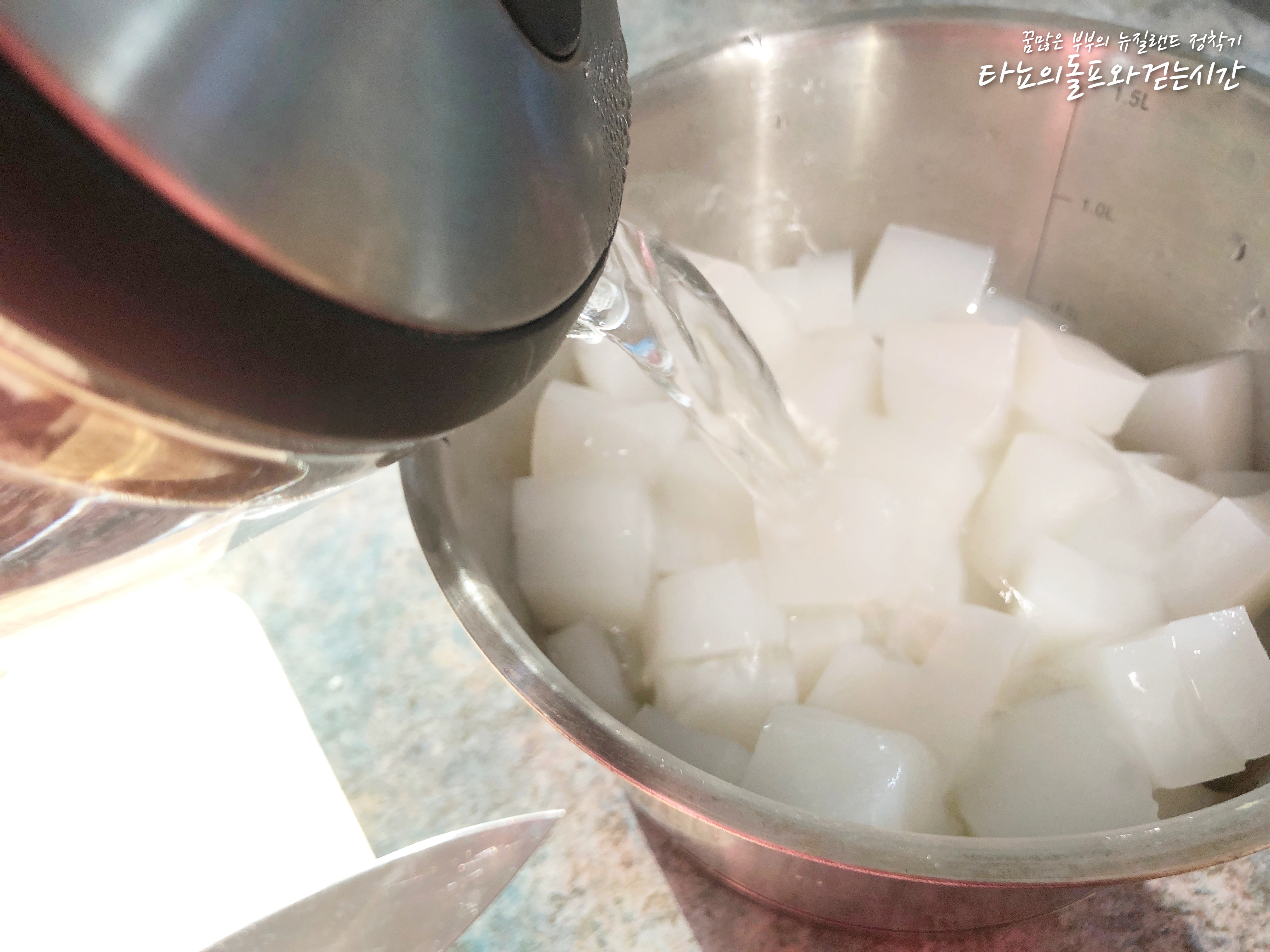 곤약을 한 입 크기로 잘라서 뜨거운 물에 담가준 다음 식초 1/2컵을 넣었습니다. 이렇게 10분 정도 담가두면 곤약 특유의 역한 냄새를 잡을 수 있어요. 끓여주는 것이 가장 좋지만, 저는 조금 더 간편하게 끓는 물을 부었습니다. 이렇게 해도 충분히 냄새는 잡을 수 있어요.