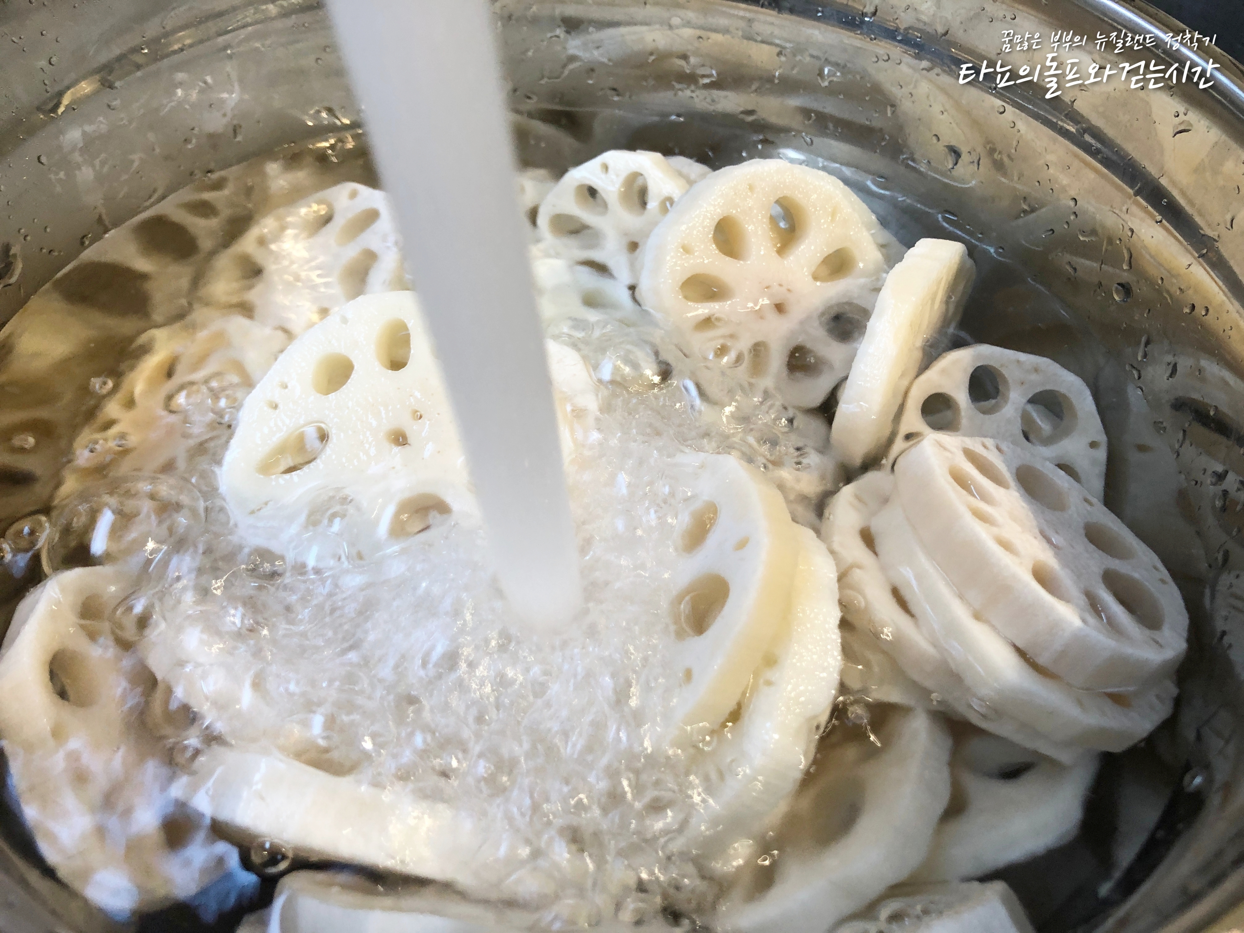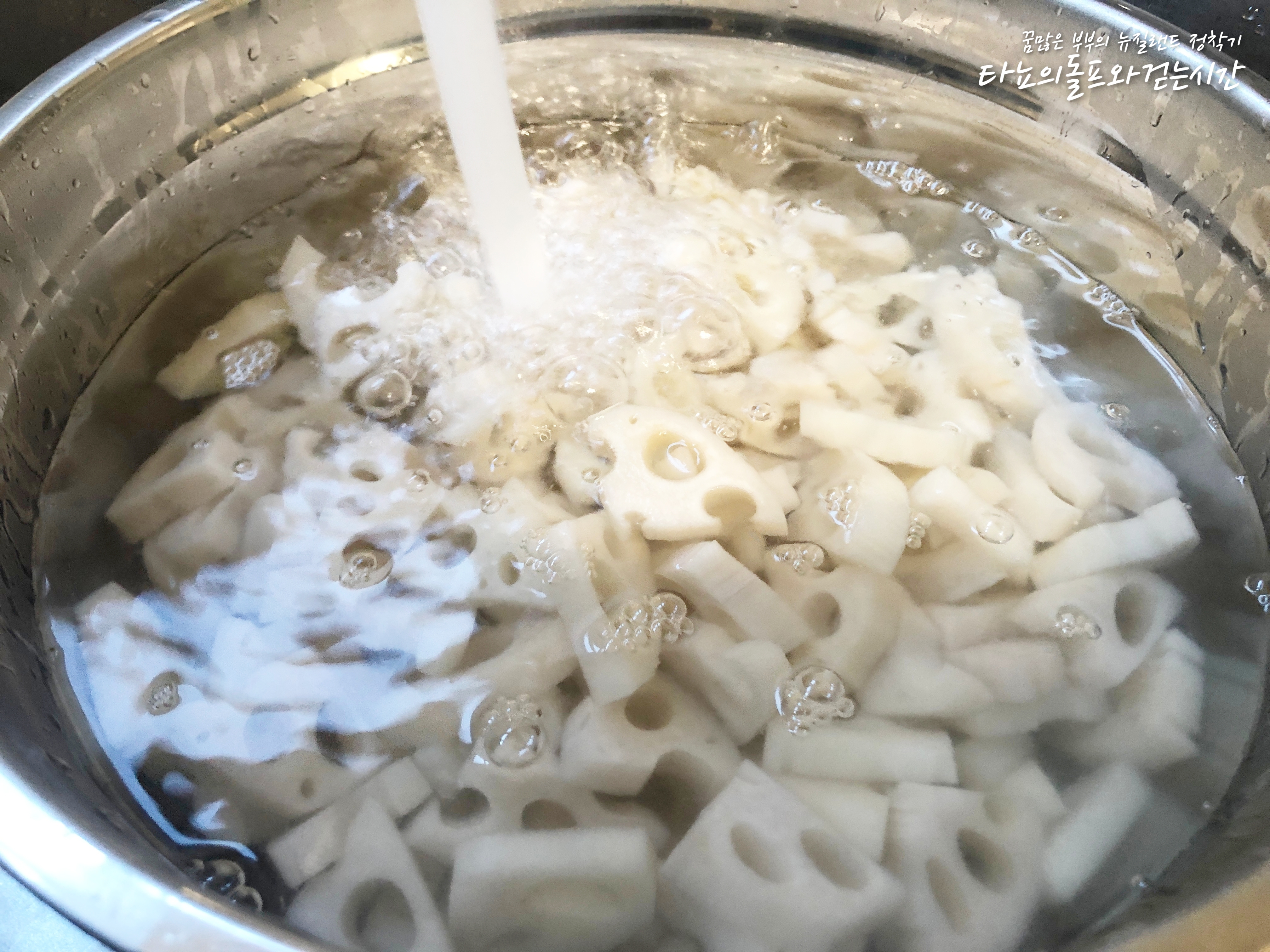 끓는 물에 데친 연근은 차가운 물에 바로 담가서 빠르게 식혀주세요. 이렇게 해주면 연근의 식감에도 큰 영향을 주게 됩니다. 더 맛있어요. 연근 1kg은 생각보다 양이 많아서 4-5번은 차가운 물에 헹궜던 것 같네요.