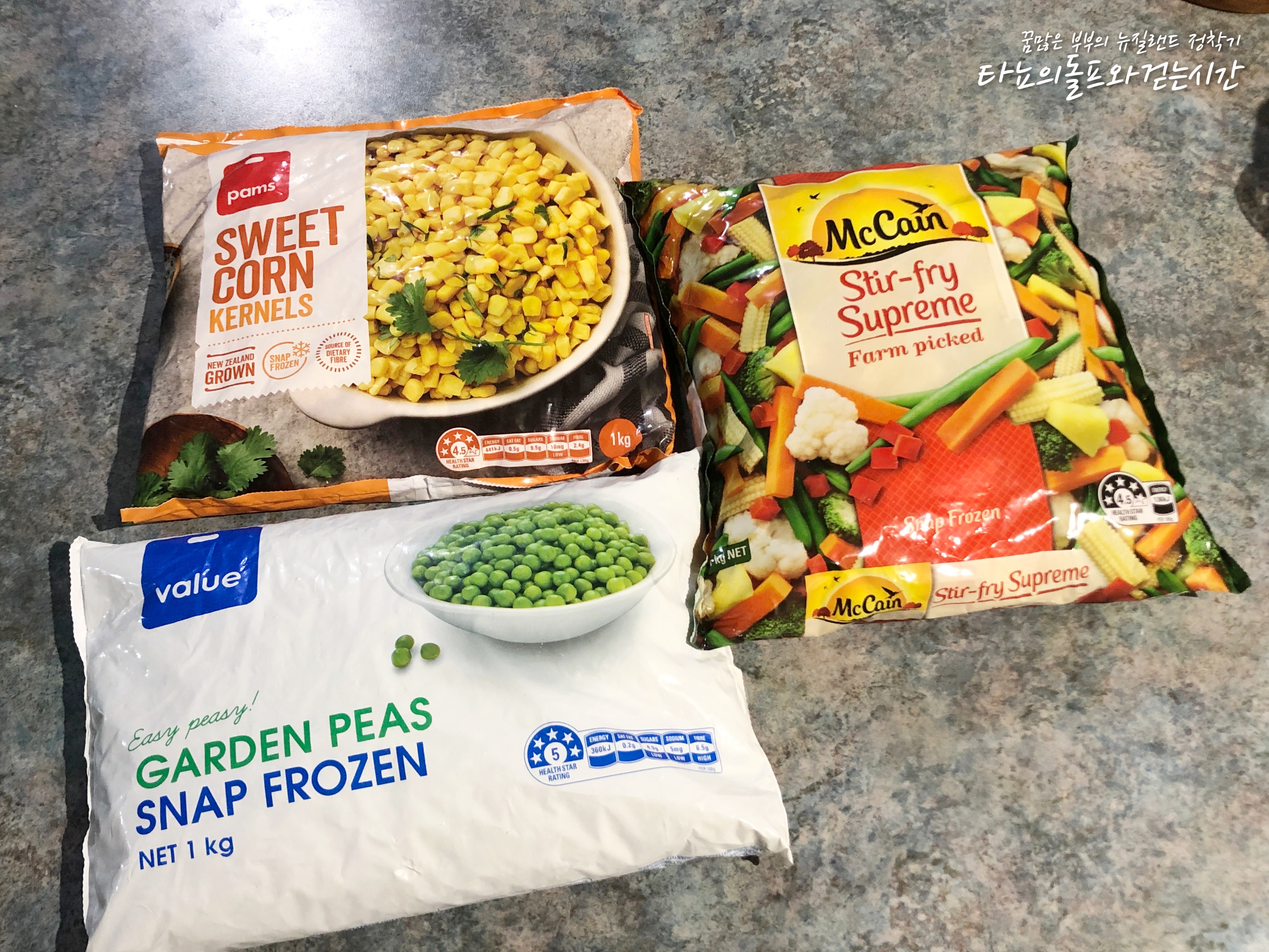 냉동실에 넣어두면 요긴하게 쓰이는 식재료입니다. 저는 볶음밥을 할 때 주로 이 3가지를 섞어서 사용하는 편이에요. 냉동식품이 워낙 잘 나오다 보니 골라 사용하는 맛이 있더라고요. 가격도 상당히 저렴한 편이죠? 완두콩은 제가 개인적으로 매우 좋아하는 편이라 삶아서도 종종 먹는 편이고요. 신랑은 스위트콘을 워낙 좋아하다 보니 치즈 넣어서 간식으로 만들어 주기도 합니다.