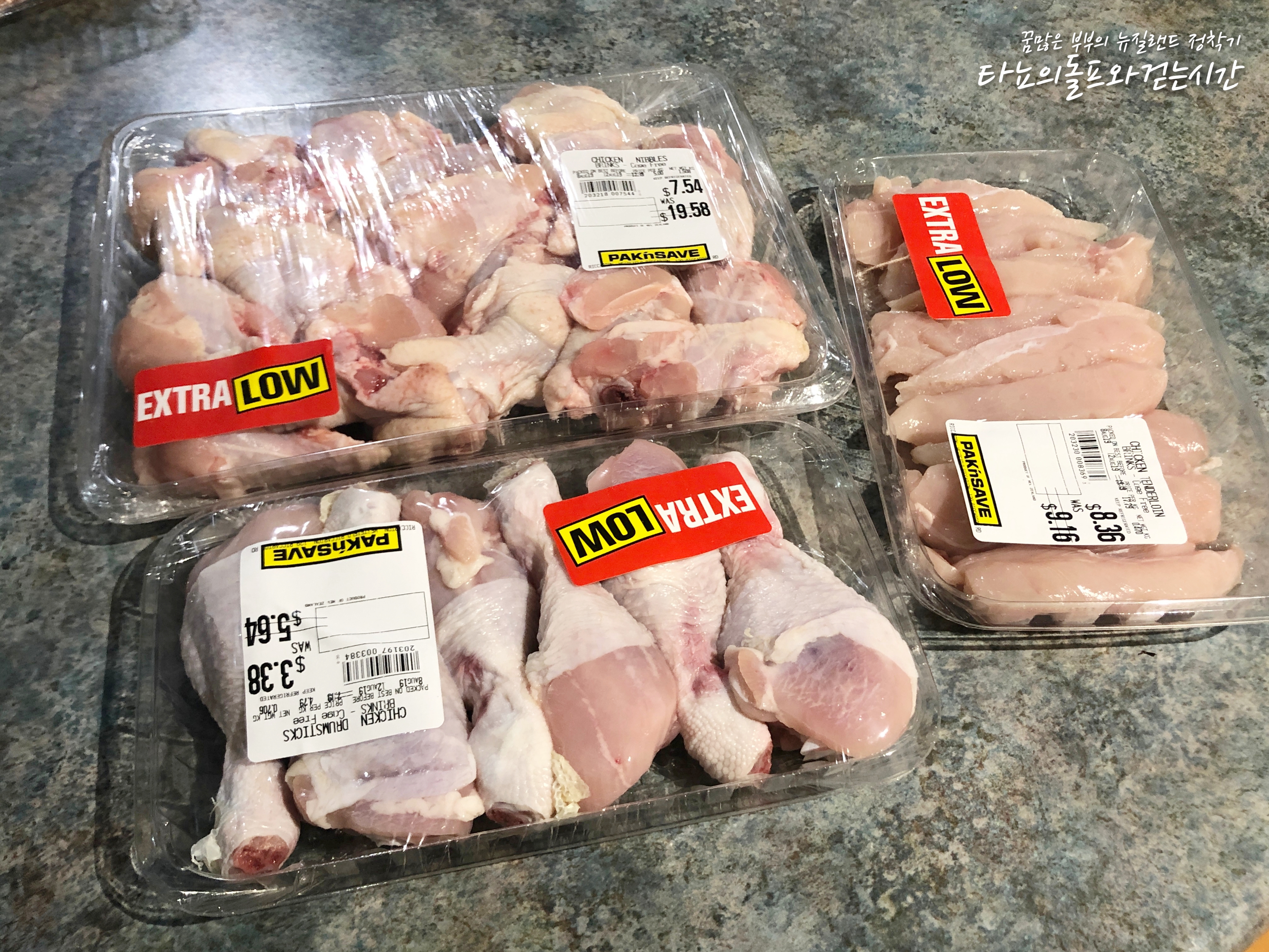 손님 대접으로 찜닭 만들 일이 있어서 닭고기를 좀 푸짐하게 구입했어요. 텐더는 아마 제 점심이자 신랑 도시락에 종종 들어갈 것이고 닭다리와 날개, 봉은 찜닭에 들어갈 재료예요. 저 정도 양이면 아마 5인분은 만들 수 있을 것 같네요. 가격을 잘 살펴보면 닭다리가 정말 저렴한 것을 알 수 있어요. 여기 닭다리 꽤 큰 편이거든요. 한국보다 절대 작지 않지만, 가격은 다리 6개에 무려 2,650원이죠. 다른 부위에 비해 닭다리가 유독 많이 저렴한 것 같아요.