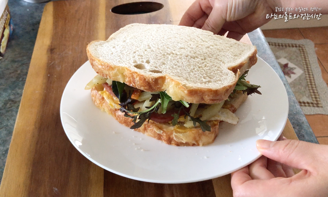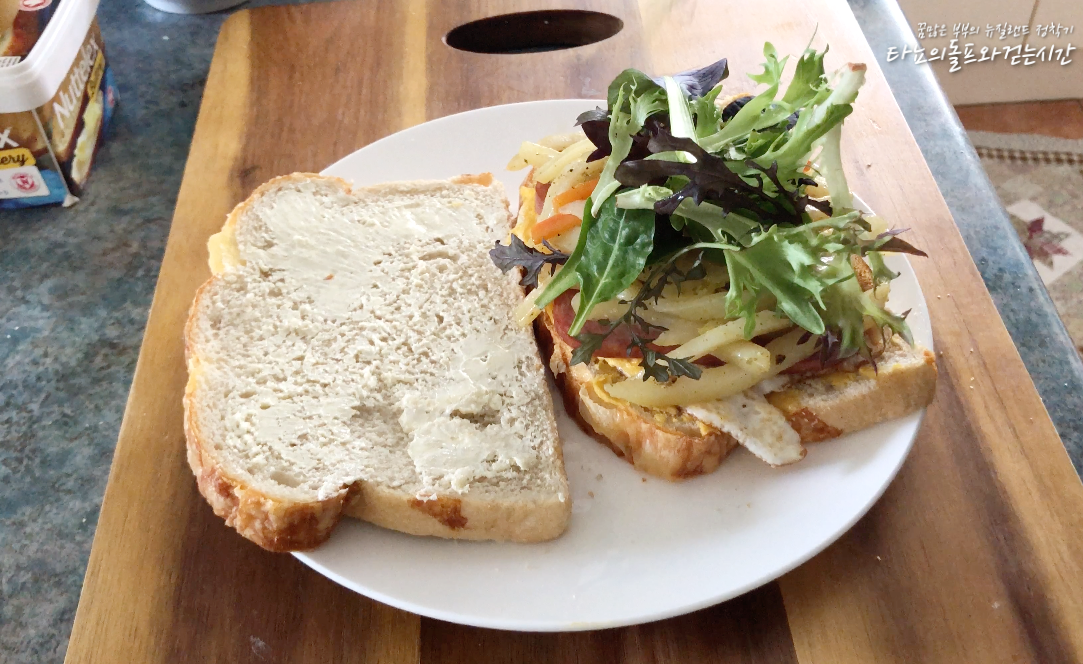 오늘 아침 신랑 아침식사로 준비했던 이름모를 샌드위치예요. 음, 들어간 재료가 스팸, 달걀, 감자볶음, 야채이니 이름을 붙이자면 감자볶음 샌드위치?라고 부르면 될 것 같네요.