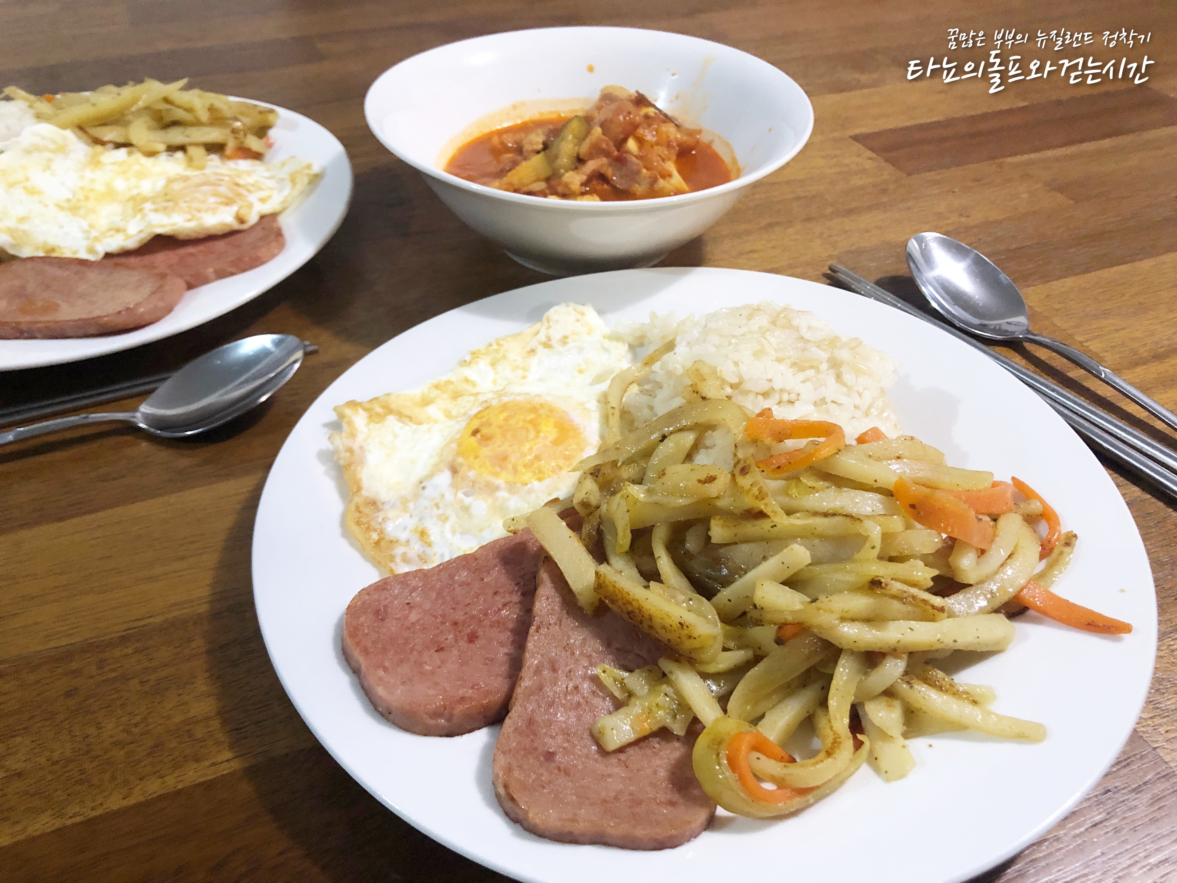 집으로 돌아와서 마당도 치우고 촬영도 하고 영상도 만들다가 신랑과 함께 저녁식사를 했습니다. 어제 먹다가 남은 김치찌개도 있고 미리 만들어둔 감자볶음도 넉넉해서 먹던 스팸 몇 장 굽고 달걀 구워서 함께 먹었습니다. 한 접시 깔끔하게 담아내니 치우기도 굉장히 편했어요.