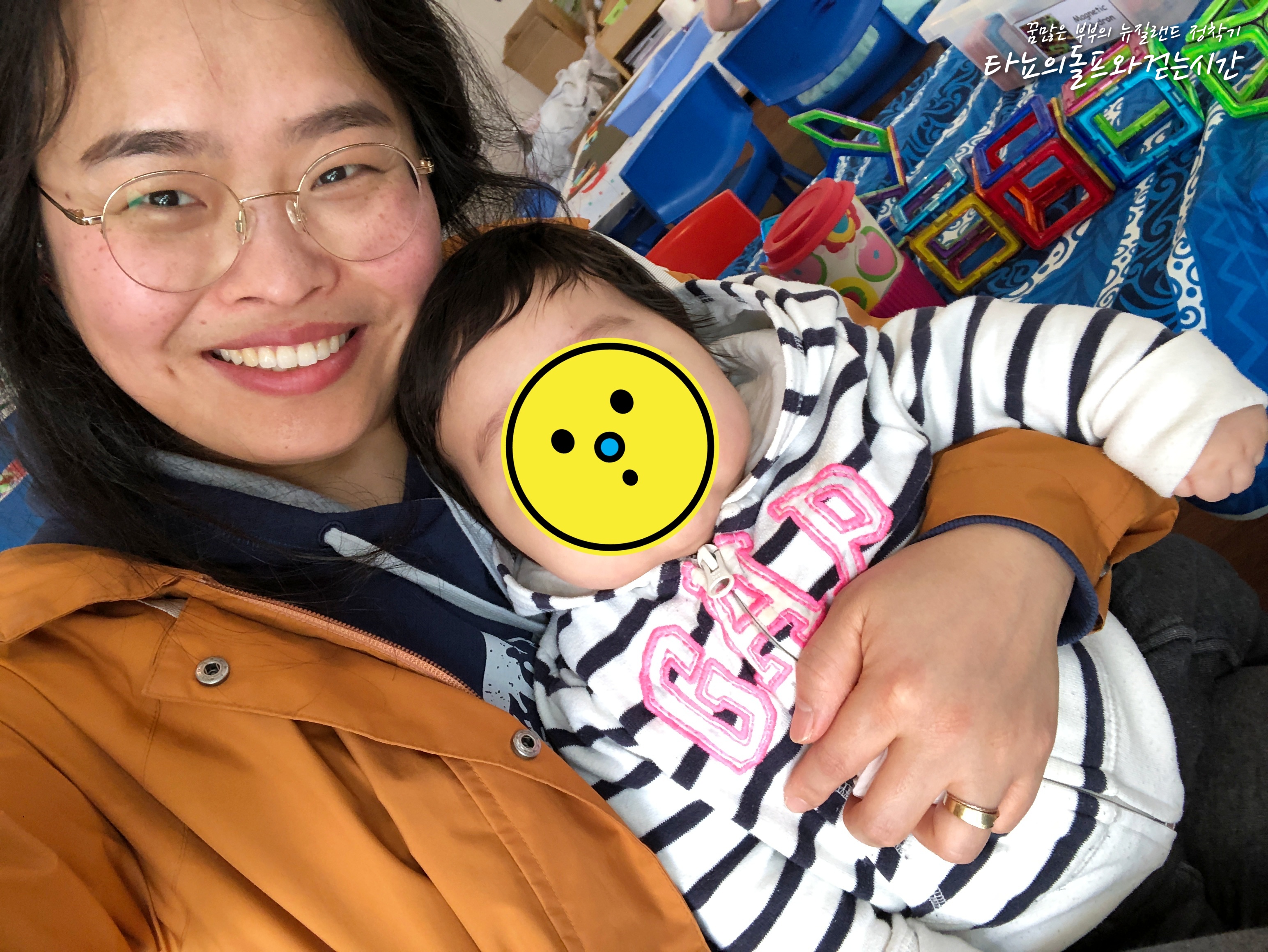 첫 방문이었지만 생각보다 아이들이 너무 잘 놀아서 1시간 정도 프리스쿨에서 시간을 보냈습니다. 막내 땡땡이를 제가 안고 사진을 찍었어요. 생후 3개월의 아기는 참 오랜만에 안아봤는데 역시나 기분이 너무 좋았어요. 부들부들하고 따끈따끈한 땡땡이는 파닥파닥 거리면서 제 품에 쏙 안겨들었죠. 아, 나도 어서 아이를 가져야겠다는 생각이 다시 한번 들었죠.