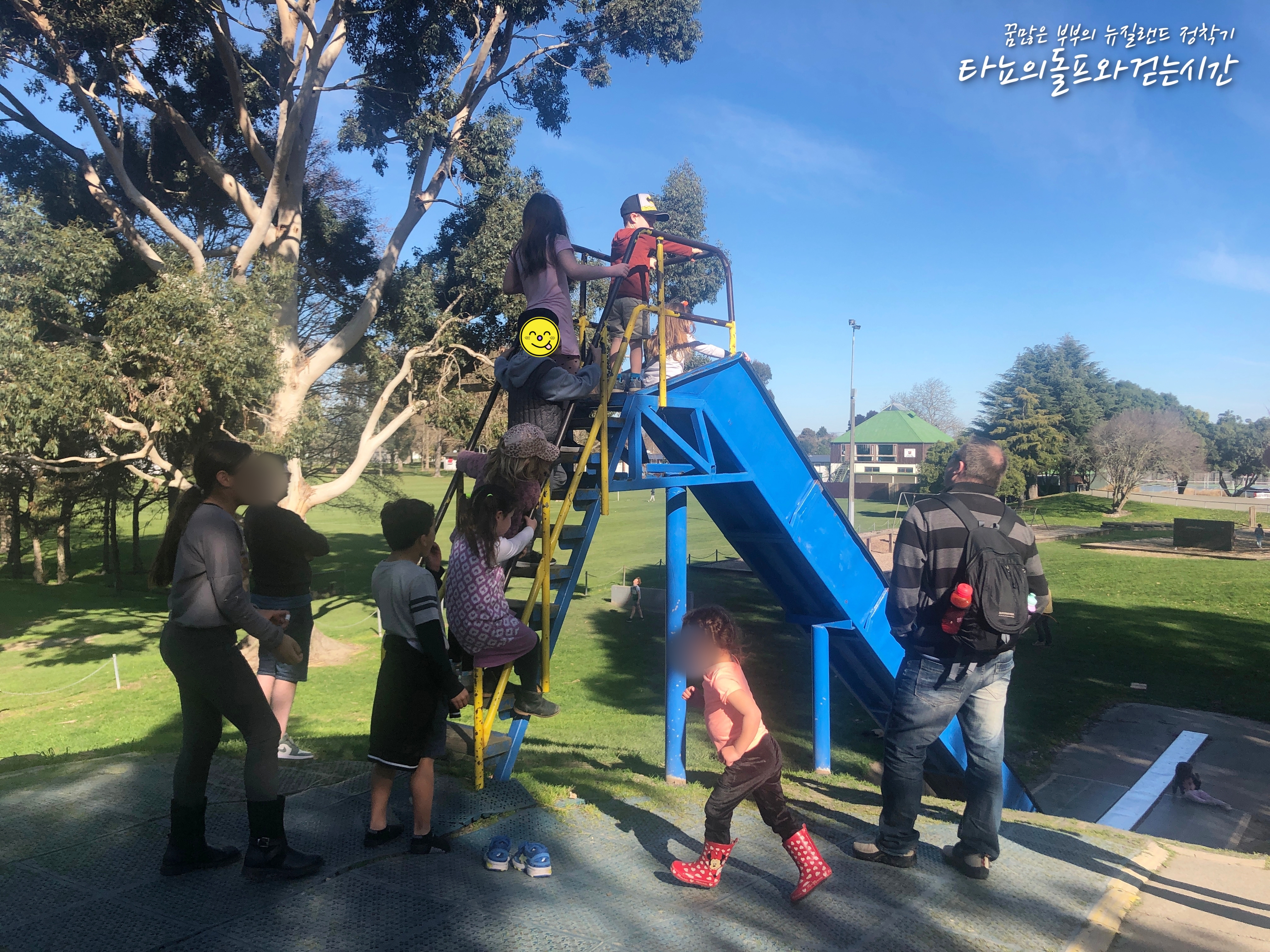 이 미끄럼틀의 길이는 15미터는 족히 되는 길이에 꽤 높은 경사를 자랑하고 있는데요. 이 동네 아이들에게 인기 만점인 미끄럼틀입니다. 원래는 이 곳에 있는 짚라인을 타러 갔었지만, 수리중이라 미끄럼틀과 다른 놀이기구들로 만족을 해야 했어요. 첫째와 둘째가 얼마나 좋아하던지요. 20번은 탄 것 같네요.