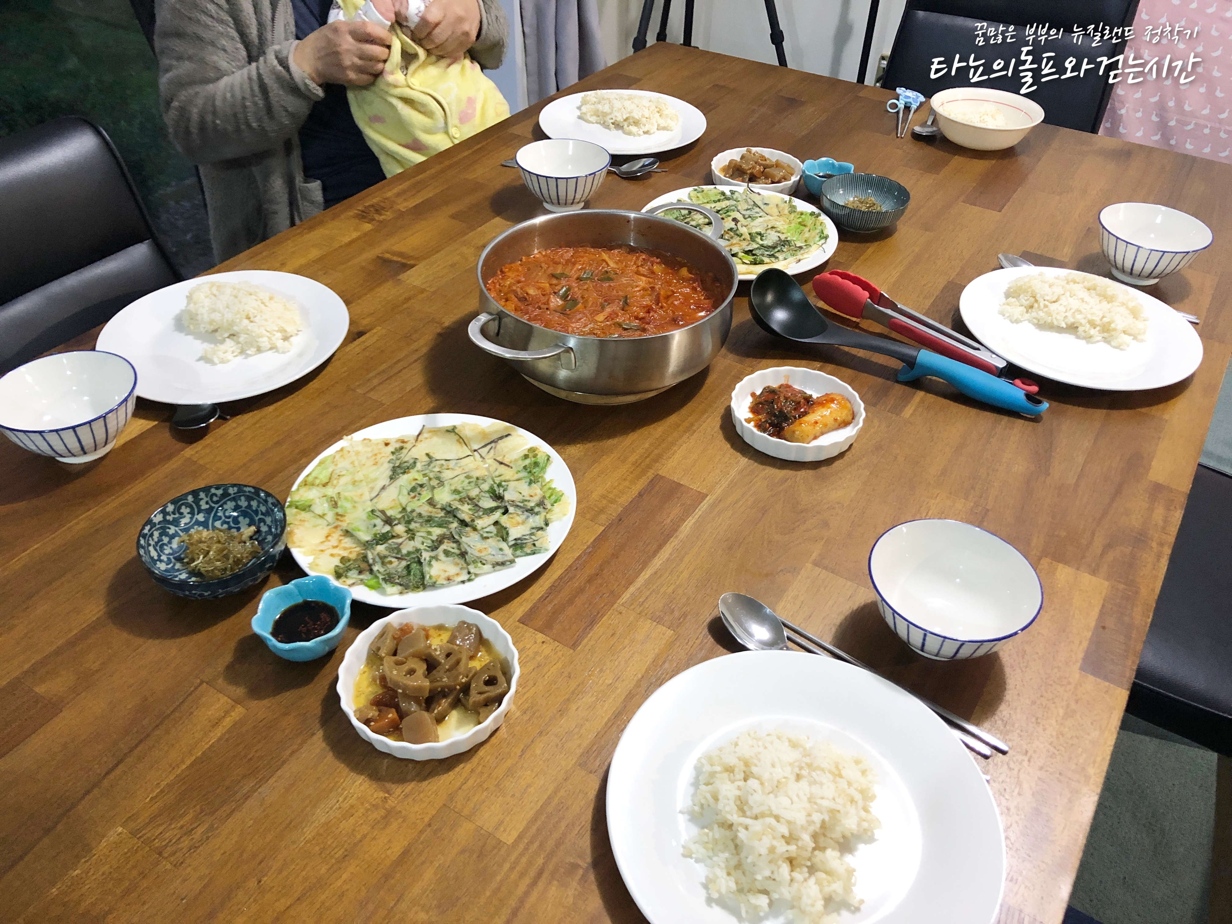 배추 겉잎 뗀 것으로 엄마가 순식간에 배추전을 만드셨어요. 텃밭에서 조금씩 자라난 미나리도 넣고 양파도 송송 썰어서 넣었더니 더 향이 좋았답니다. 엄마가 만들어 주신 김치찜에 밑반찬 곁들여서 함께 맛있는 저녁식사를 했네요.