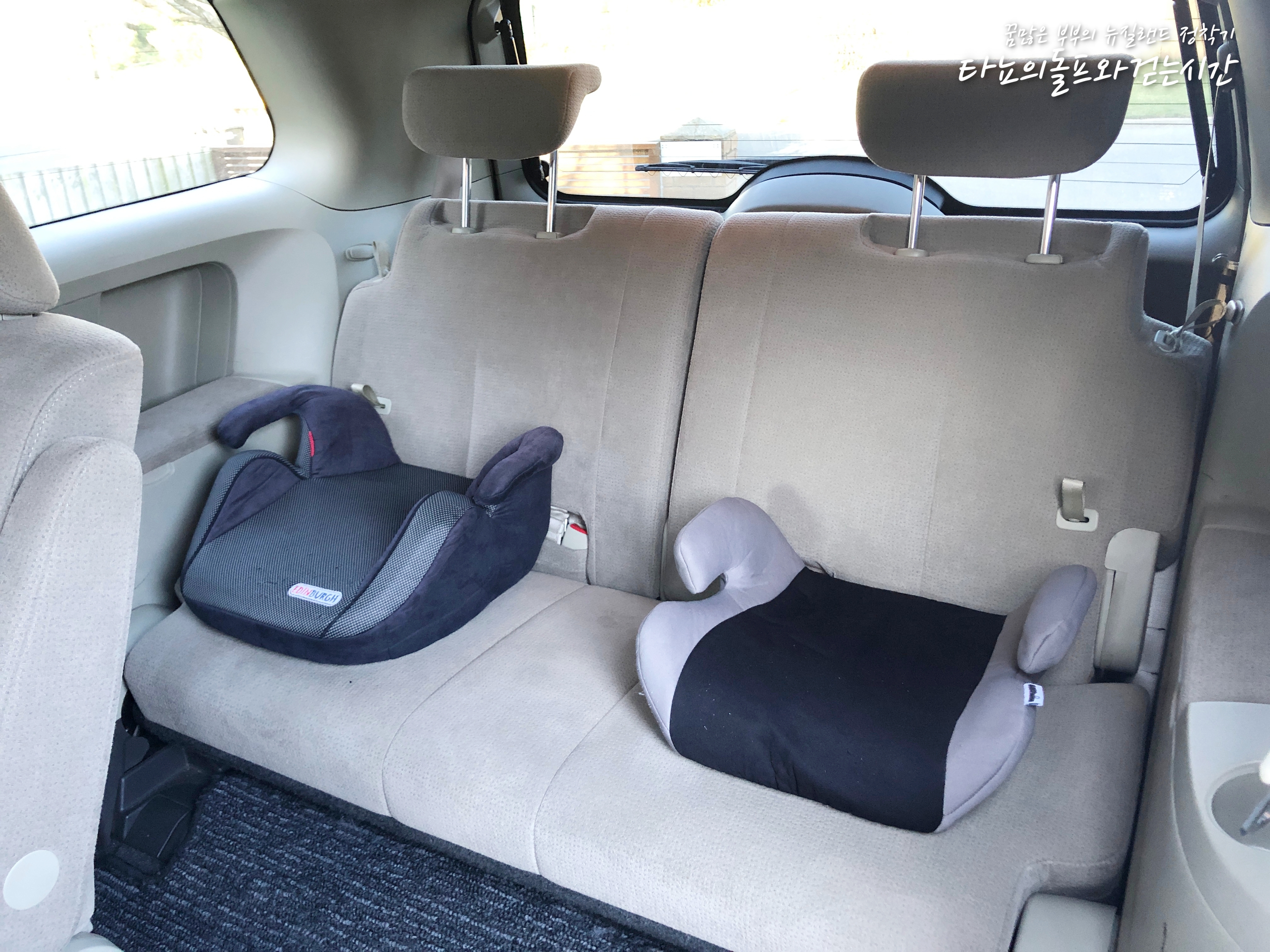 가깝게 지내는 아기엄마에게 남는 아기 카시트를 빌리고 또 다른 엄마들에게 부스터시트를 빌려서 하나씩 나란히 장착했어요. 저희 차가 그렇게 작은 차는 아닌데 카시트에 부스터까지 놓으니 생각보다 차가 많이 좁아지는 것 같아요 ^^;; 어른들이 함께 타면 아마 꽉 찰 것 같네요.