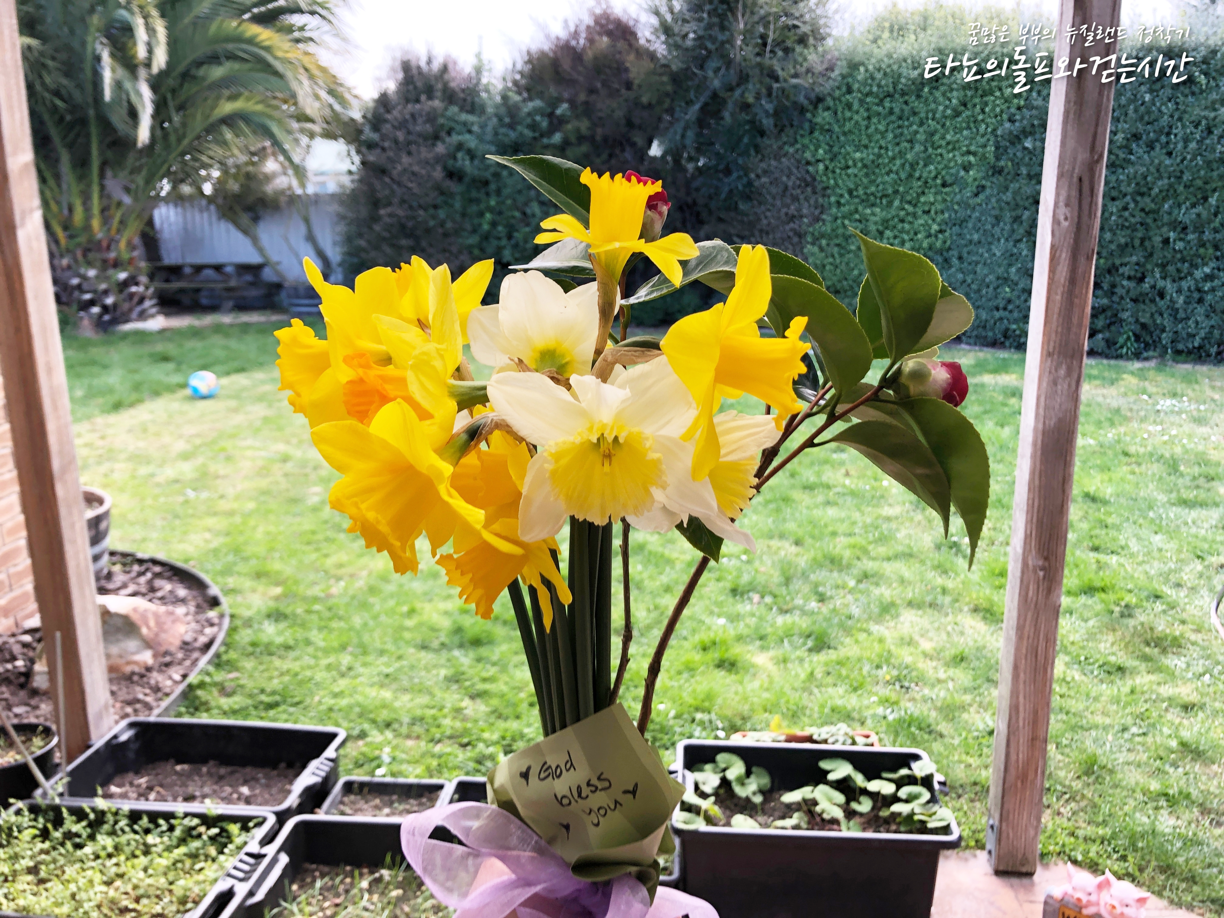 주중에는 가까운 언니에게 예쁜 수선화와 동백꽃을 받았어요. 축복의 메시지와 함께 리본을 묶어서 "이거 엄마 드려" 라고 말하며 주셨는데 얼마나 기분이 좋던지요. 엄마가 참 기뻐하셨어요.