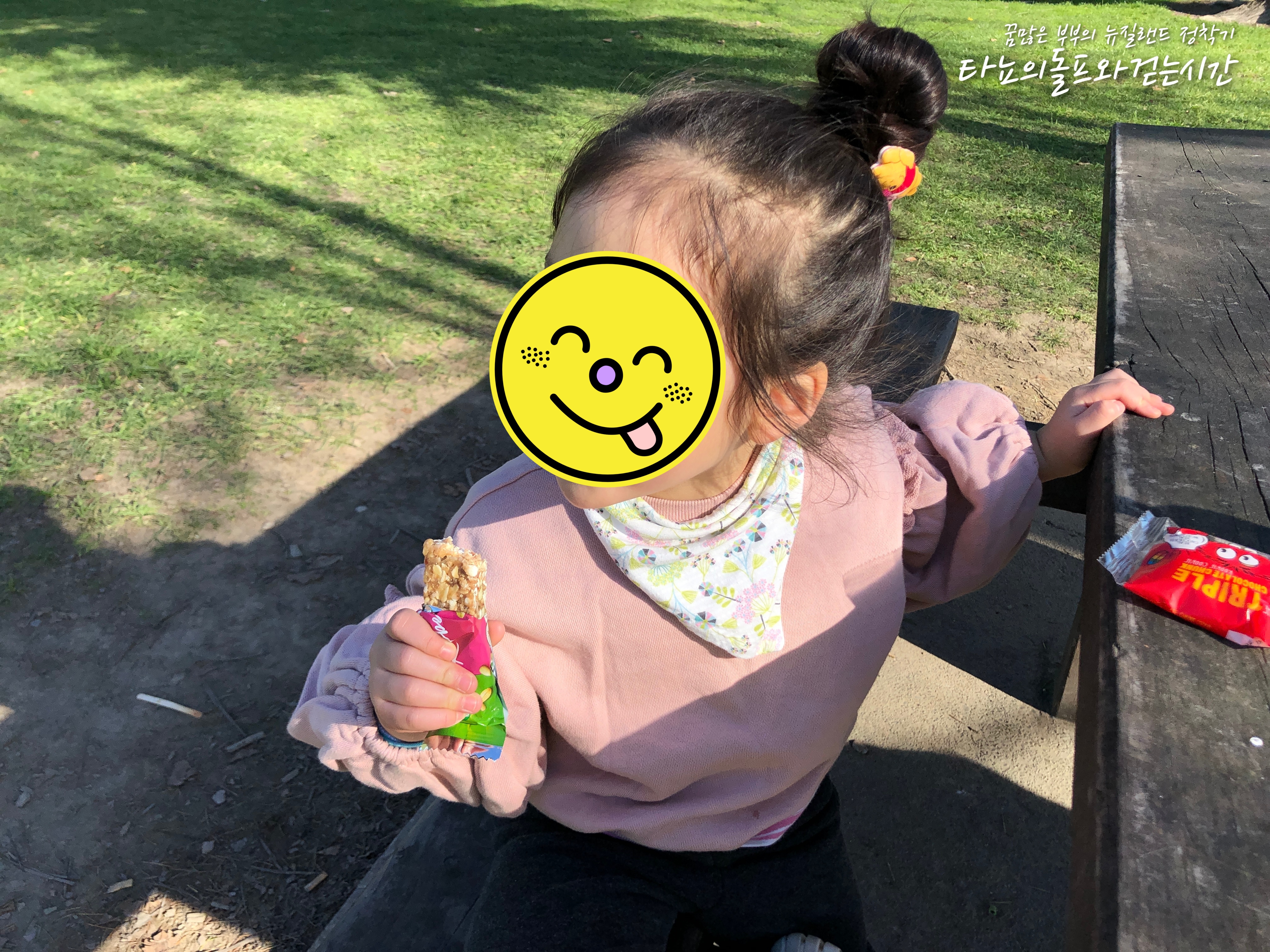 거의 2시간 가까이 신나게 뛰어 놀더니 배가 고픈지 간식을 찾더라고요. 미리 준비해온 쿠키타임이랑 뮤즐리바를 꺼내줬어요. 딸기맛 뮤즐리바가 마음에 드는지 덥썩 집어서 잘도 먹더라고요. 하지만 더 맛있는 간식이 나오자 순식간에 뮤즐리바는 엄마 몫으로 돌아갔습니다 ^^;;