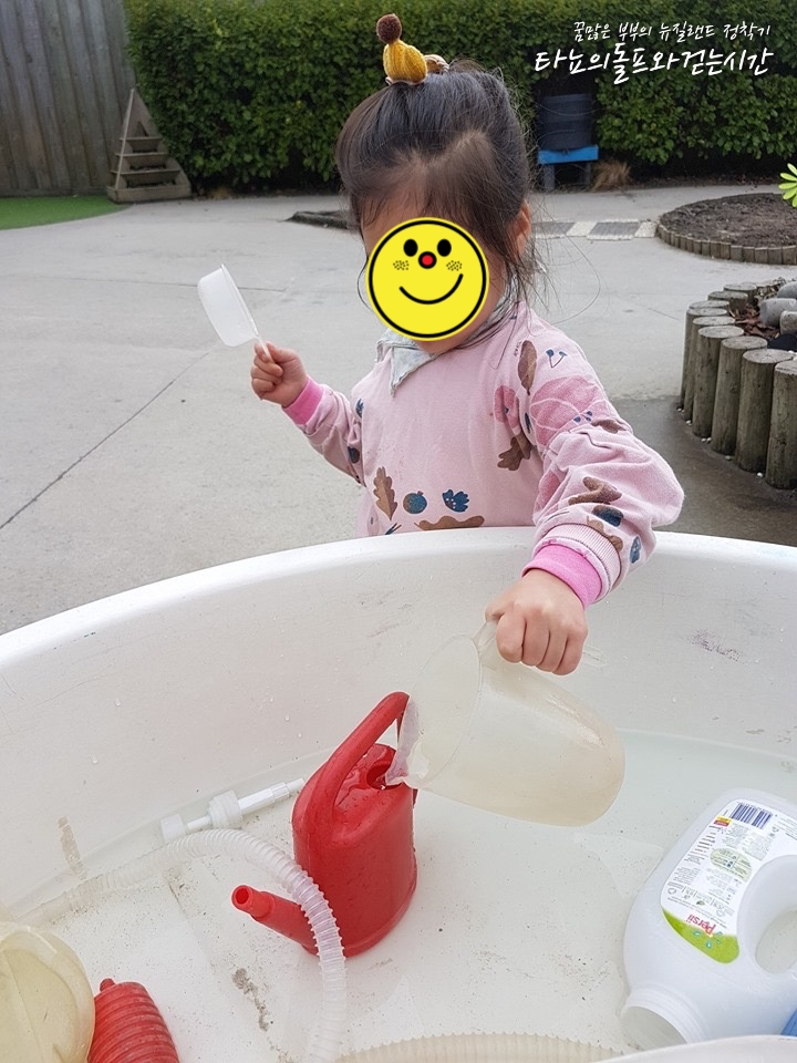 도대체 뭘 풀었는지를 알 수 없는 알록달록 색감의 물과 거품이 가득하네요. 이 곳에서 아이들은 물을 용기에 붓기도 하고 거품기를 돌리기도 합니다. 주방 놀이를 하기에 딱이었어요.