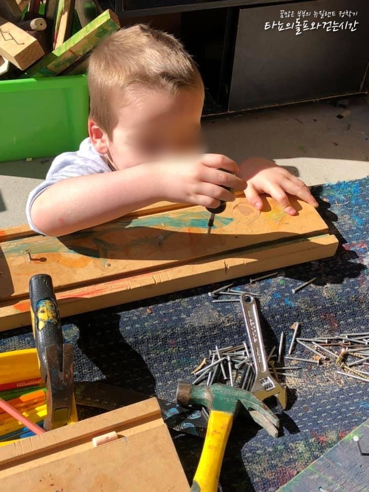 못질하는 만 3세 어린이들의 모습입니다. 처음에 아이들이 망치를 들고 못을 두드리는 모습을 봤을 때 정말 깜짝 놀랐답니다. 첫 등원했을 때 저희 첫째 조카가 못질을 해서 장난감을 만들었었거든요.