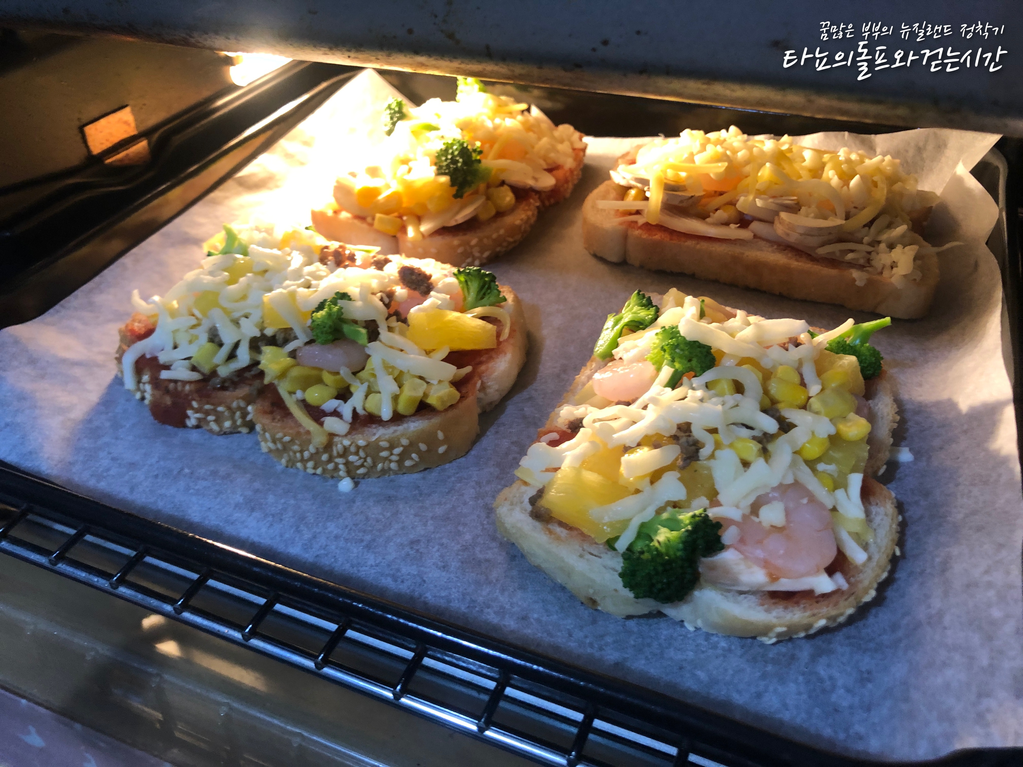 재료 : 식빵 1봉지, 토마토 페이스트, 모짜렐라 치즈, 체다치즈, 스위트콘, 통조림 파인애플, 삶은 새우, 양송이 버섯, 볶은 소고기, 브로콜리