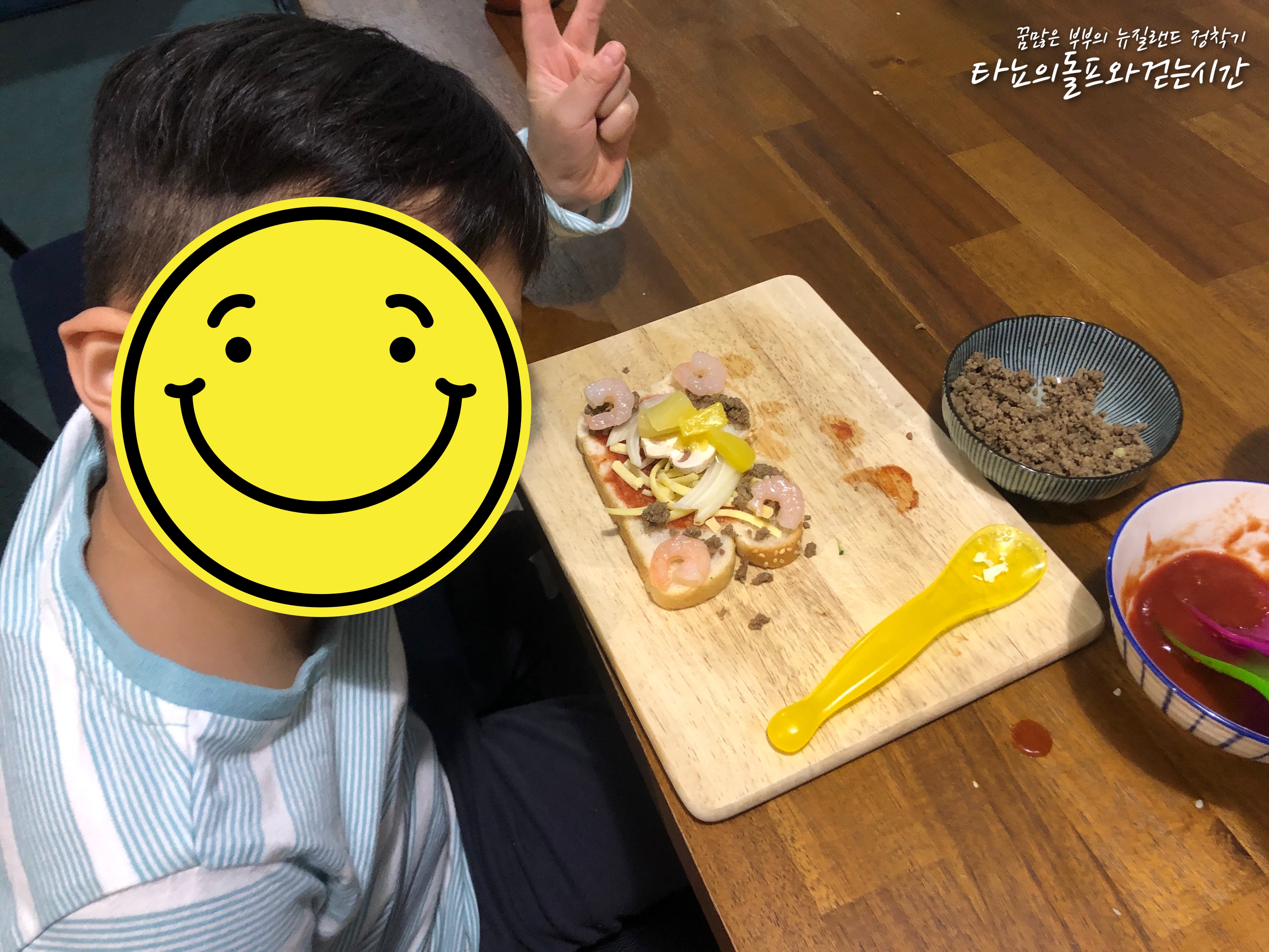 함께 도우를 만들고 싶었으나 밀가루를 깜빡하고 구입하지 못한 관계로 식빵을 사용했습니다. 아이들이 가장 하고 싶었던 것은 아마도 반죽이었을 텐데, 함께 만들지 못해서 아쉬웠어요. 식빵피자도 맛있을 것이라고 아이를 달래 가며 함께 만들기를 시작했어요.