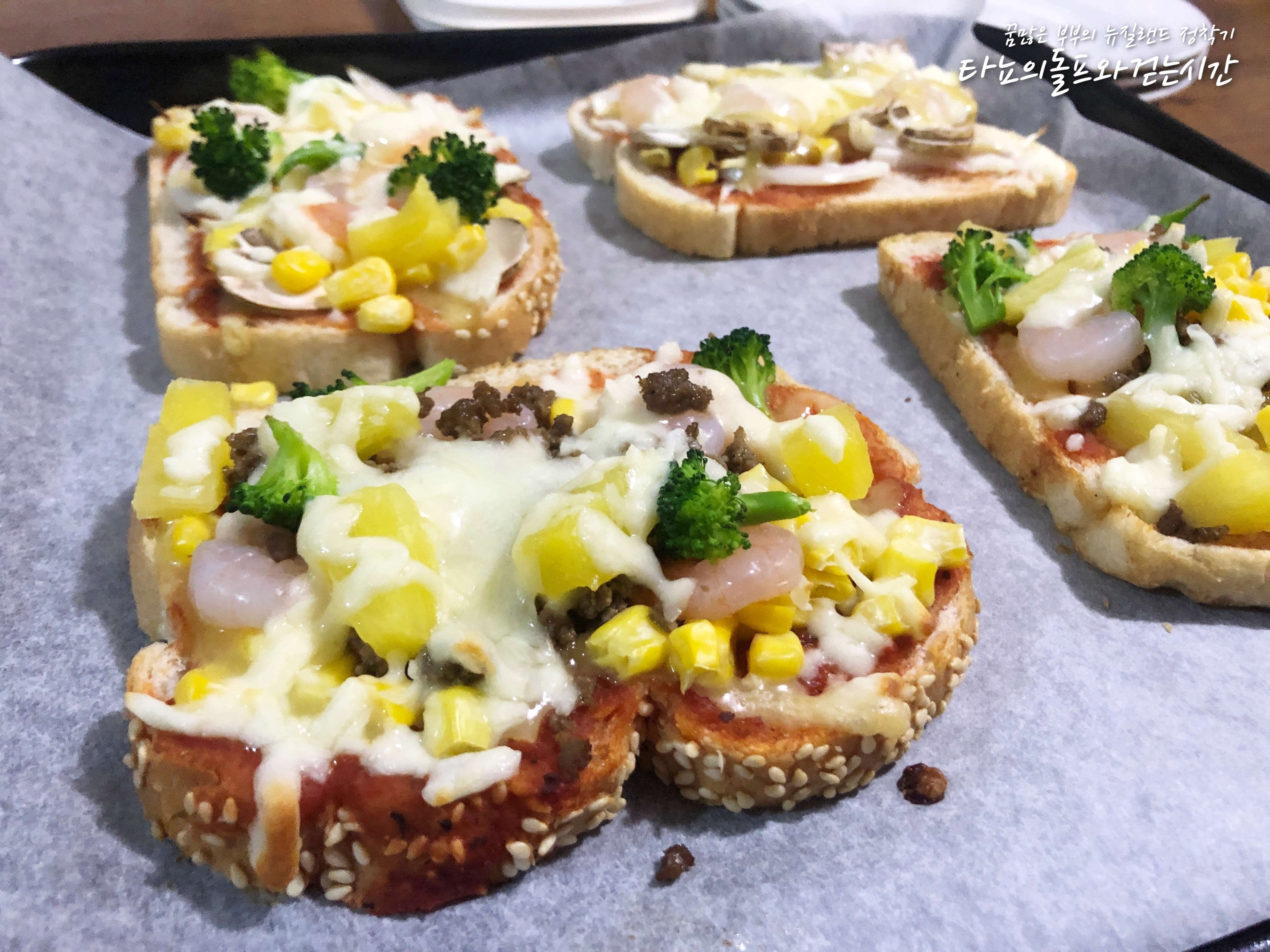 재료 : 식빵 1봉지, 토마토 페이스트, 모짜렐라 치즈, 체다치즈, 스위트콘, 통조림 파인애플, 삶은 새우, 양송이 버섯, 볶은 소고기, 브로콜리