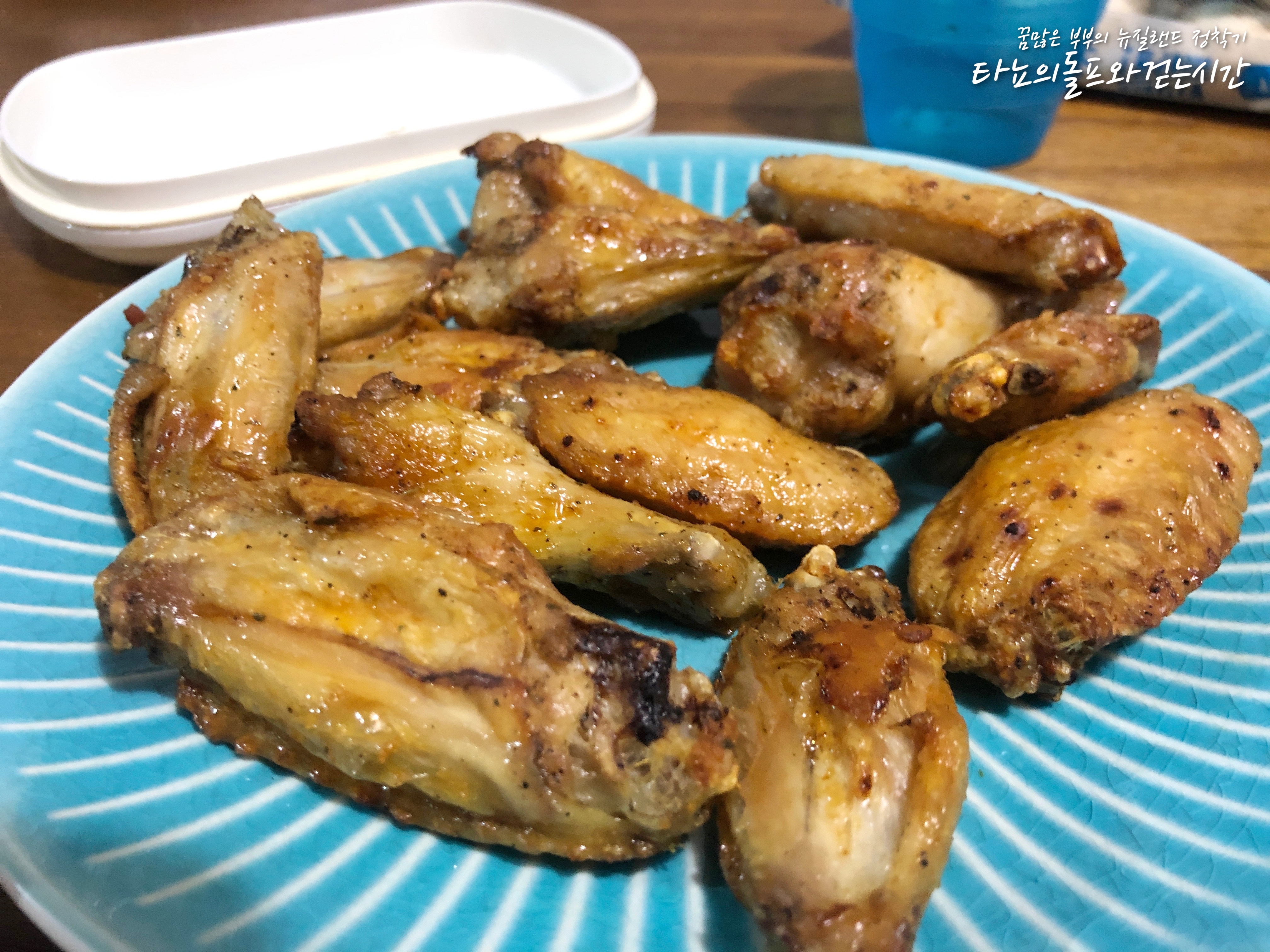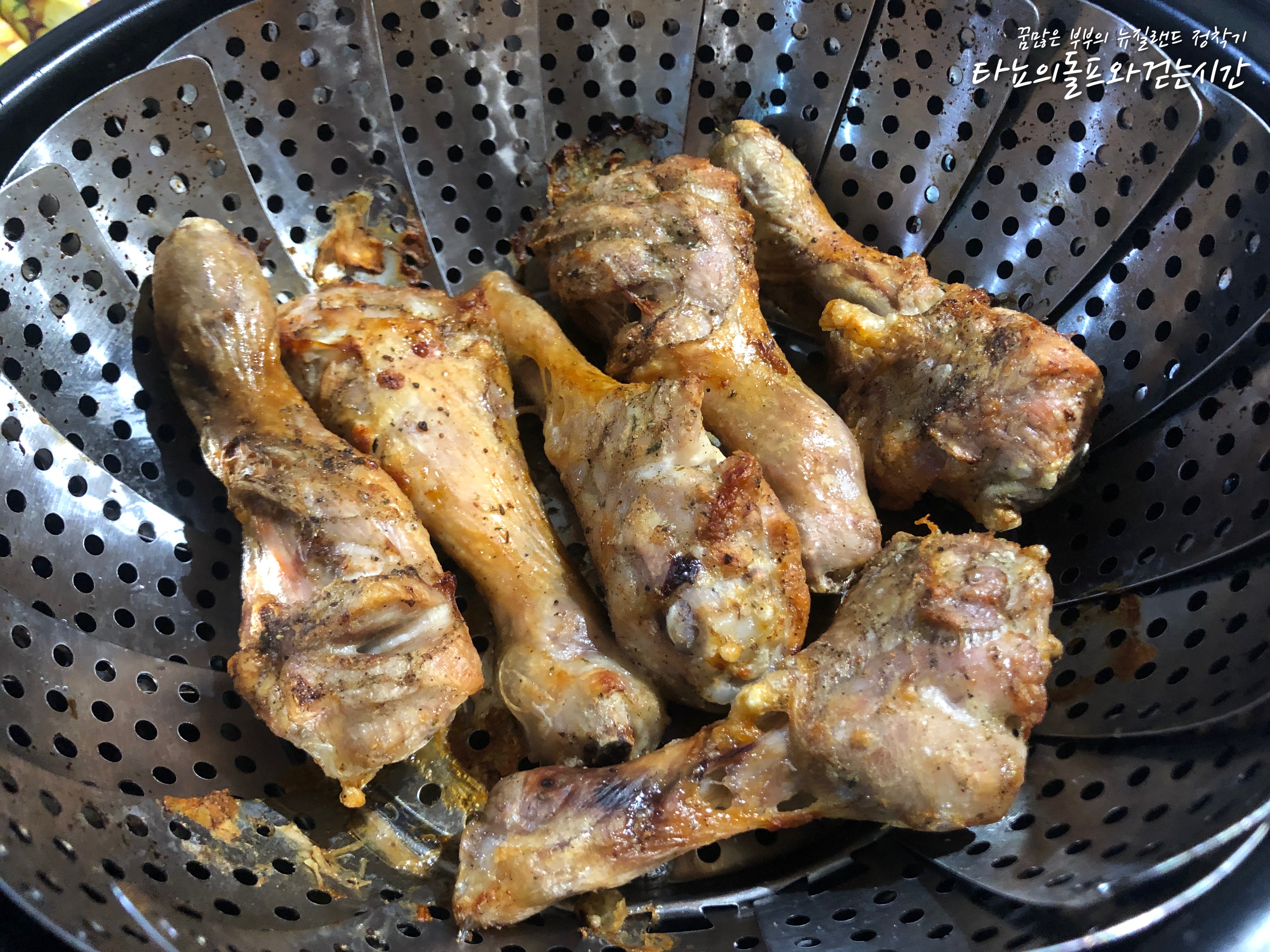 혹시나 피자가 부족하지는 않을까하는 마음에 준비했던 치킨이에요. 에어프라이어로 조리하면 이렇게 오븐치킨처럼 만들어지죠. 허브솔트와 후추로 간단하게 간을 맞춘 뒤 20분 굽고 뒤집어서 10분을 더 구우면 완성된답니다. 둘째는 피자보다는 치킨이 좋은지 치킨이 나오자 피자를 돌보듯이 보더군요. 아이들 덕분에 피자도 만들고 즐거운 시간을 보냈어요. 아이들이 떠나기 전에 제대로 된 피자 만들기를 한 번 더 해봐야겠어요.