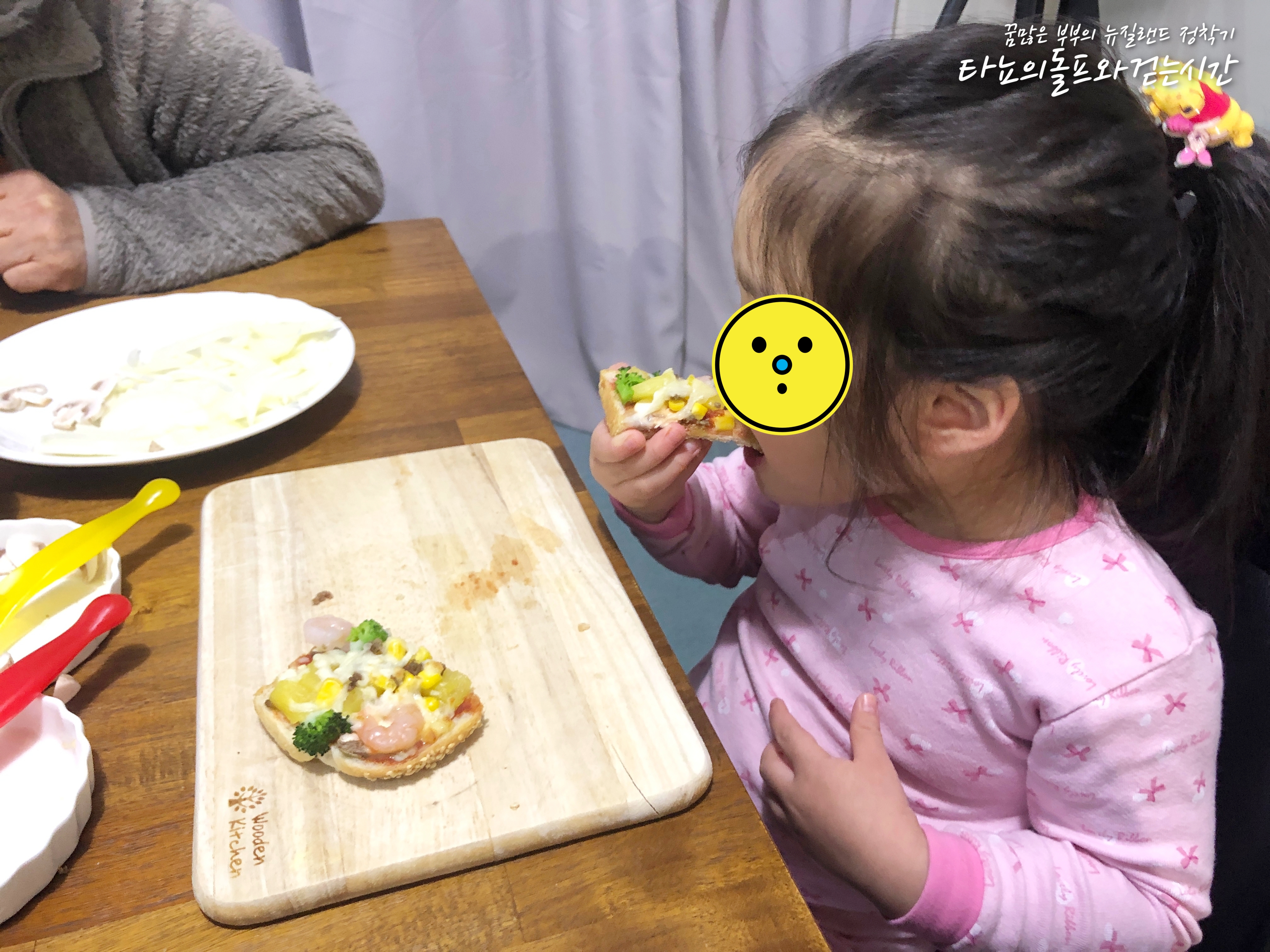 자신들의 것은 물론 어른들이 먹을 피자까지 모두 책임지고 만들어낸 조카들입니다. 만 5세, 만 3세 어린아이들이지만 얼마나 똑부러지게 잘 만들어내는지 몰라요. 먹기 싫은 야채도 모두 골고루 넣어가며 맛있는 피자를 완성했습니다.