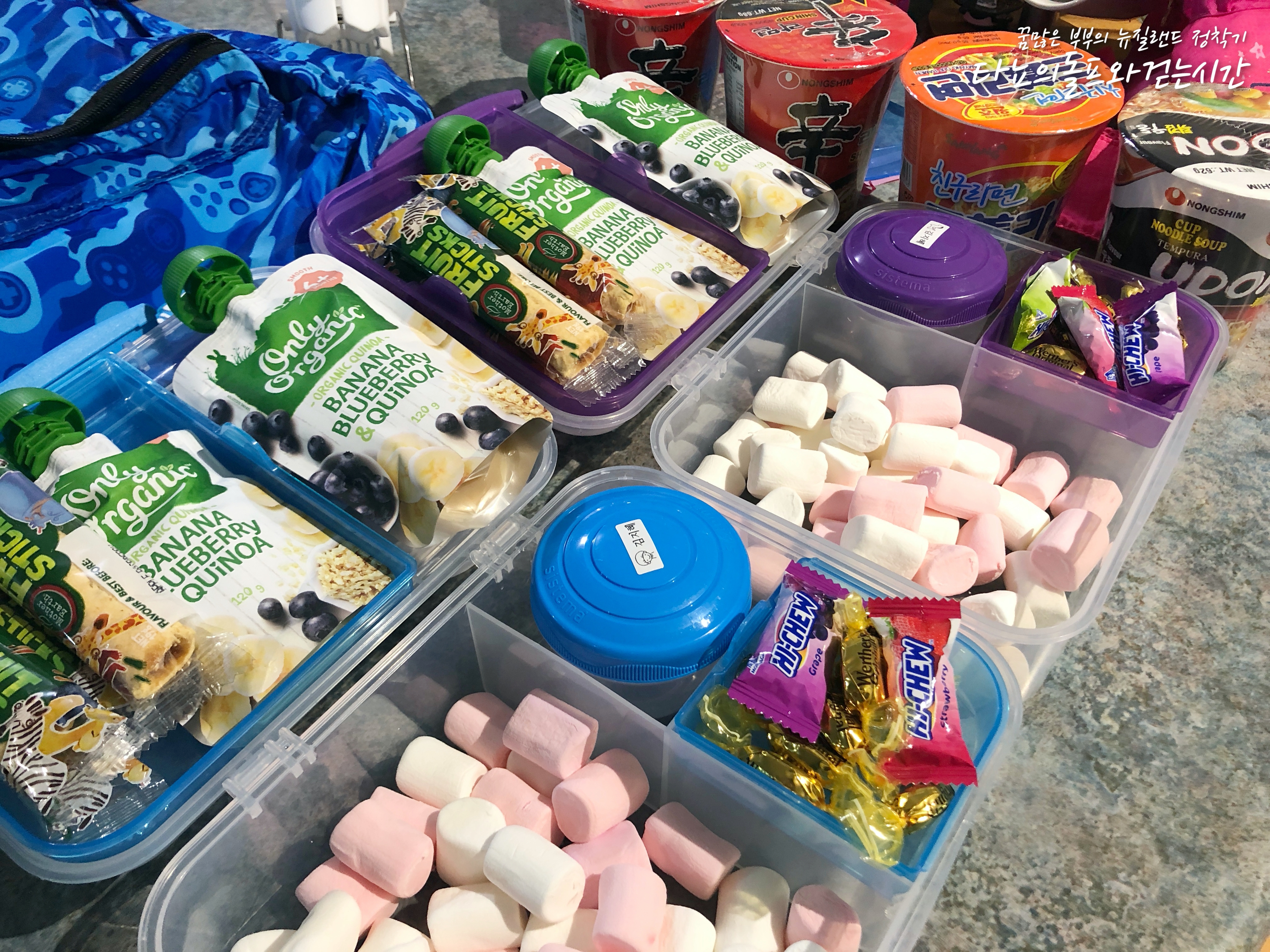 막내 이유식도 여유롭게 챙기고 아이들 간식으로 과자와 마시멜로우, 사탕 등을 넣었습니다. 치치에서 광저우까지만 12시간을 비행해야하기에 간식은 무조건 넉넉하게~ 광저우를 경유하는 가족들을 위해 컵라면도 하나씩 넣었어요. 12시간 비행을 마치면 아마도 정말 라면이 땡길 것 같아서요.
