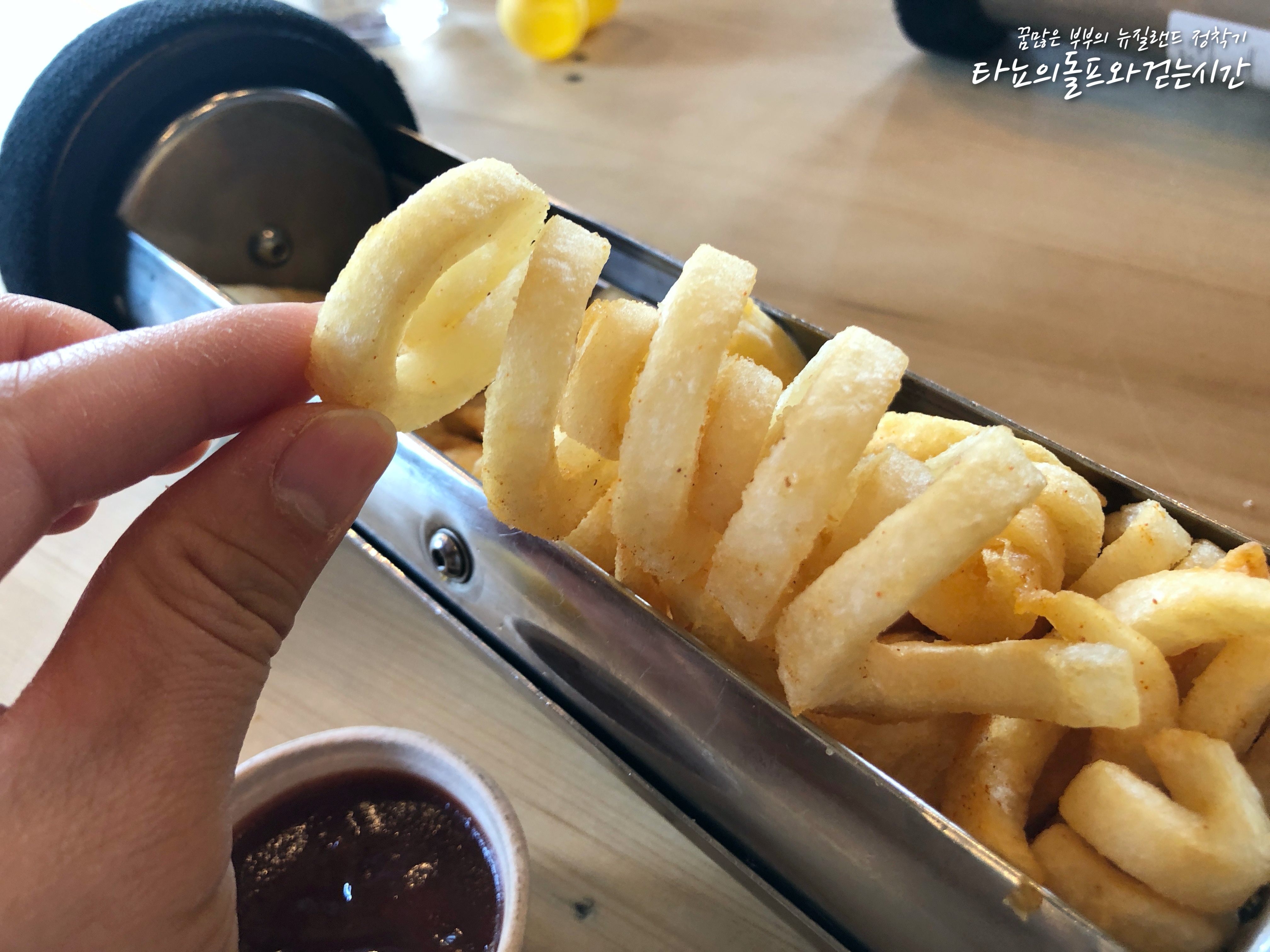 1년 반 전에 함께 들렀었던 시티의 'C1 에스프레소'에서 컬리프라이를 주문했어요. 캡슐에 담긴채로 파이프를 타고 날아오는 캡슐 칩스인데요. 첫째 조카가 4세 때 먹었던 이 칩스를 기억하더라고요. 천장에 있는 관을 통해 날아왔었던 칩스가 다시 먹고 싶다는 조카의 말에 단숨에 달려갔답니다. 컬리 프라이의 가격은 9불 50센트에요.