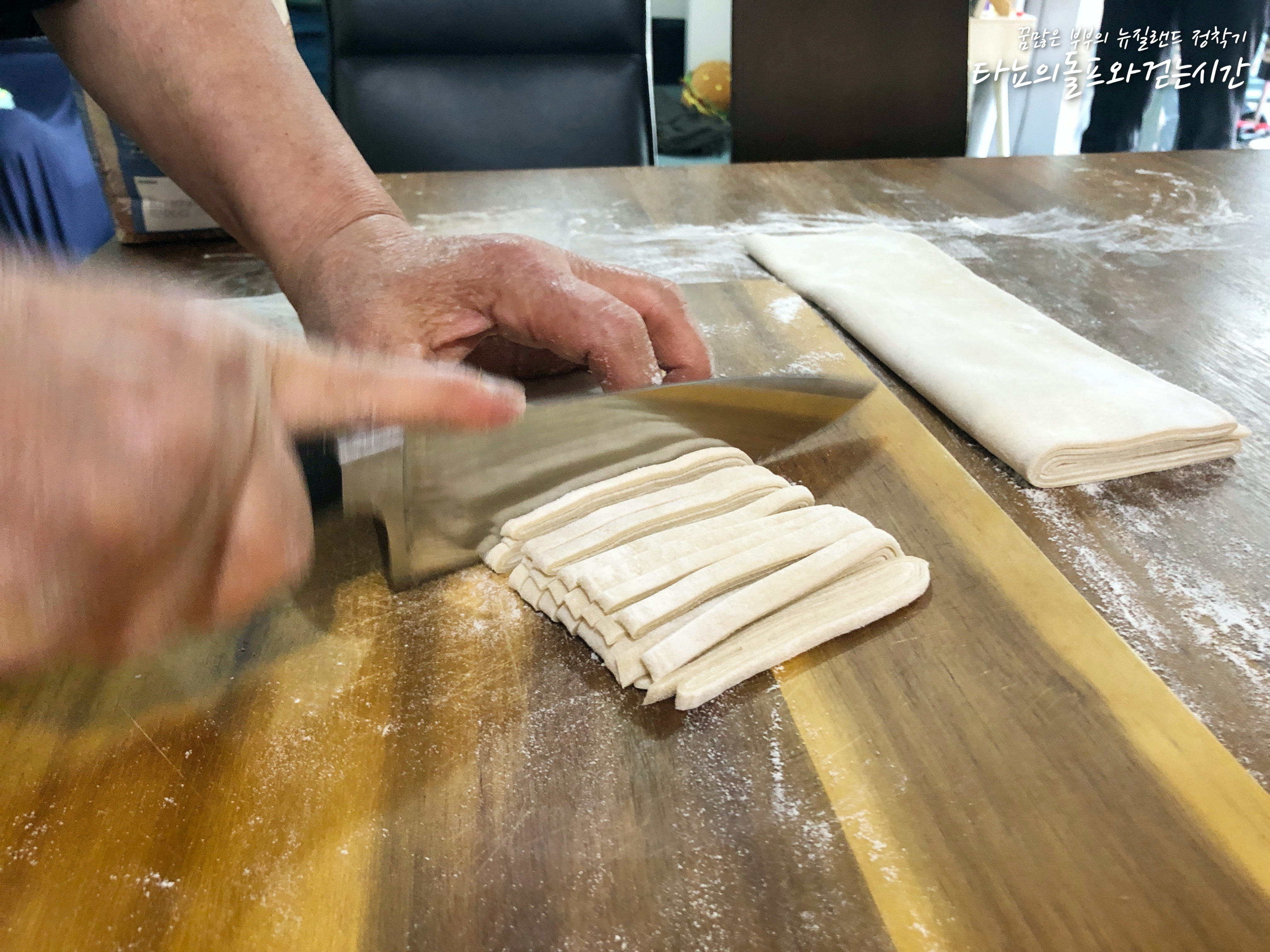 엄마가 이 곳에 오신 뒤 제가 가장 많이 먹은 것은 엄마표 수제비와 국수입니다. 국수도 잔치국수, 그냥 국수, 칼국수, 칼제비 등 다양하게 먹었던 것 같네요. 밀가루만 몇 번을 구입했는지 모르겠네요. 엄마가 만들어주시는 수제비와 국수는 정말 일품인데요. 공항으로 떠나기 2시간 전에도 이렇게 칼국수를 밀어주고 가셨답니다.