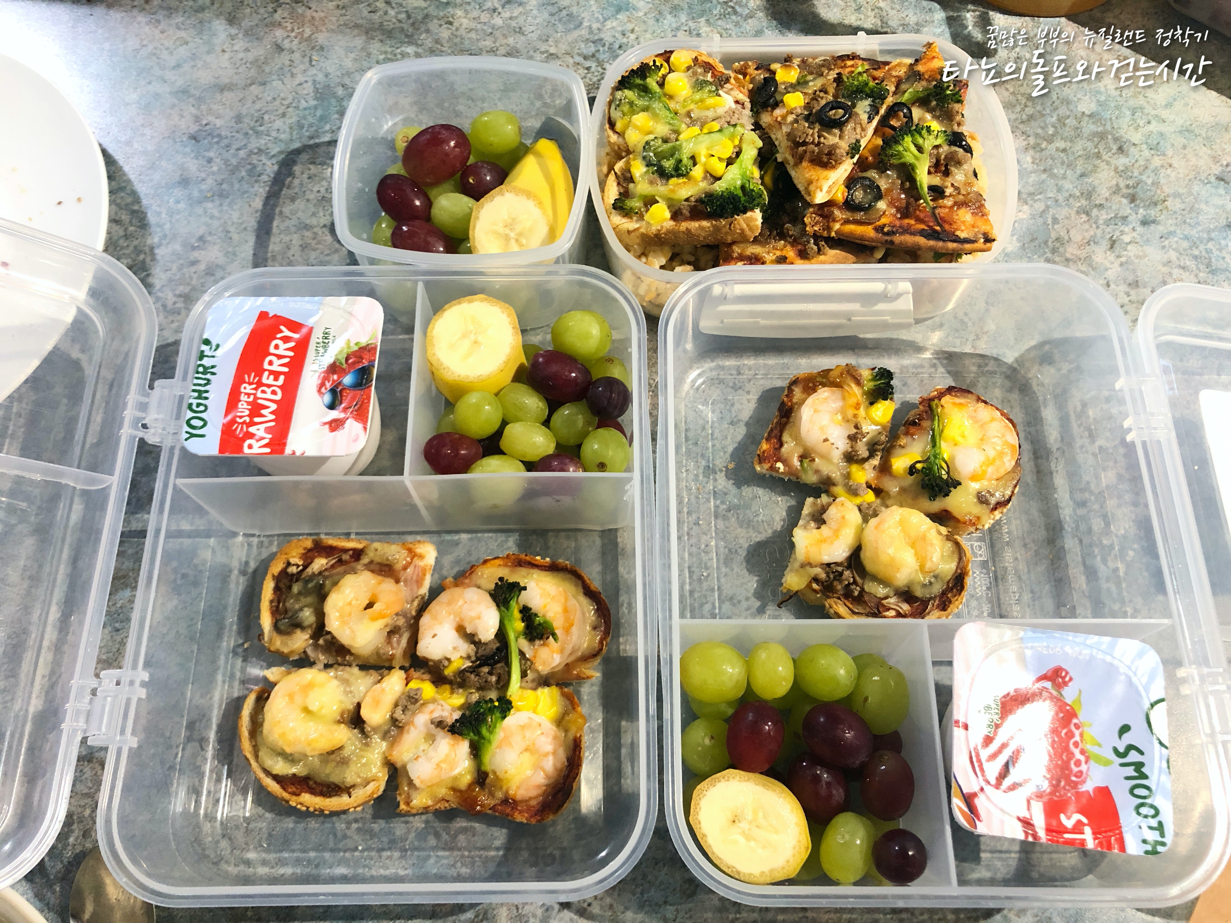 아이들과 함께 피자를 만든 다음 날, 아이들의 점심 도시락에는 피자가 들어갔습니다. 아이들이 자신의 취향대로 만들다보니 새우밖에 보이질 않네요 ^^;; 새우가 들어가지 않은 피자는 모두 저희 신랑 도시락으로 들어갔습니다. 신랑은 새우를 싫어하거든요. 피자와 바나나, 포도, 딸기 요거트 넣어서 준비했어요.