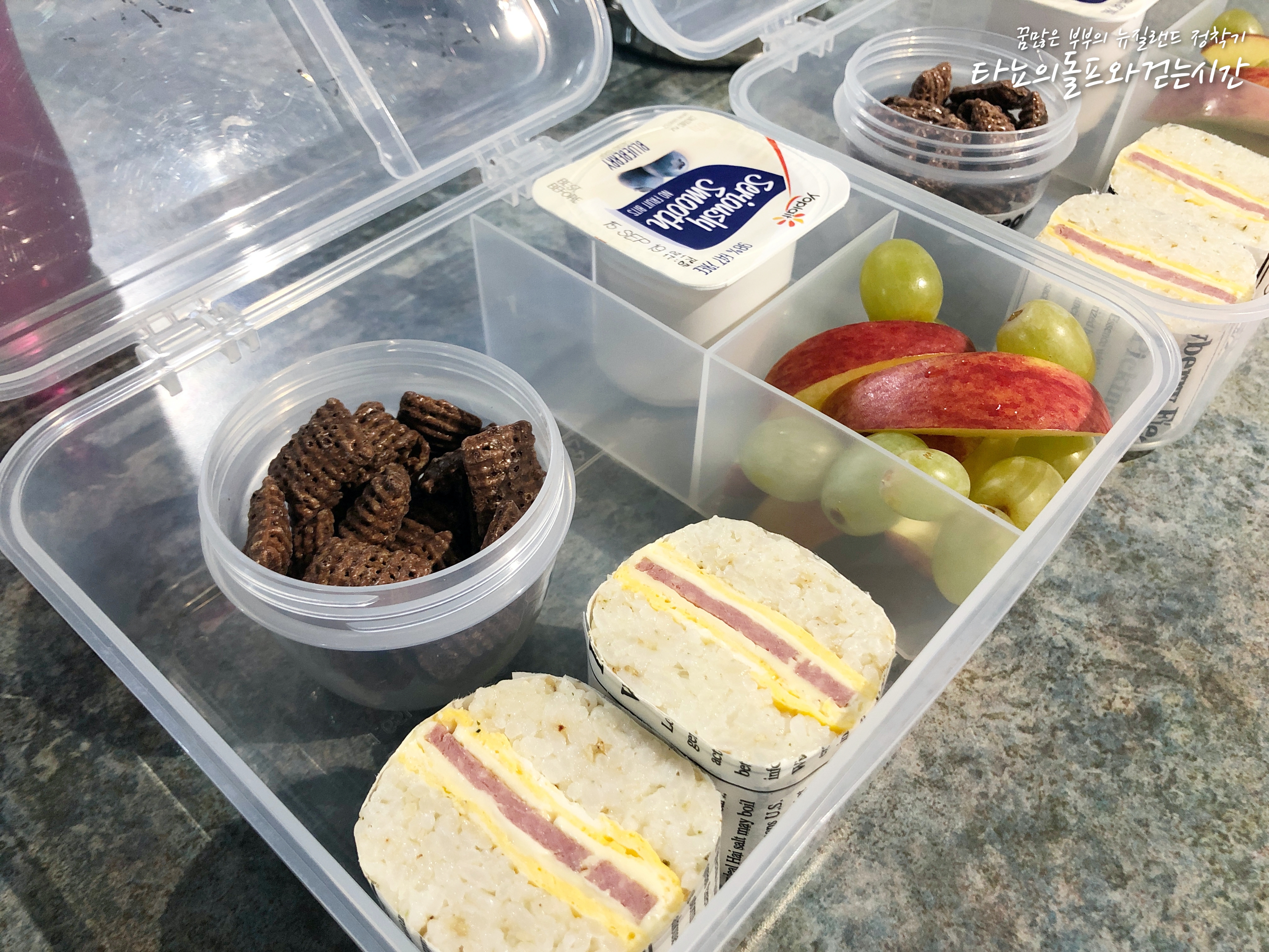 스팸과 치즈, 달걀을 넣은 스팸무스비와 초코 시리얼, 블루베리 요거트, 사과, 포도를 준비했어요.