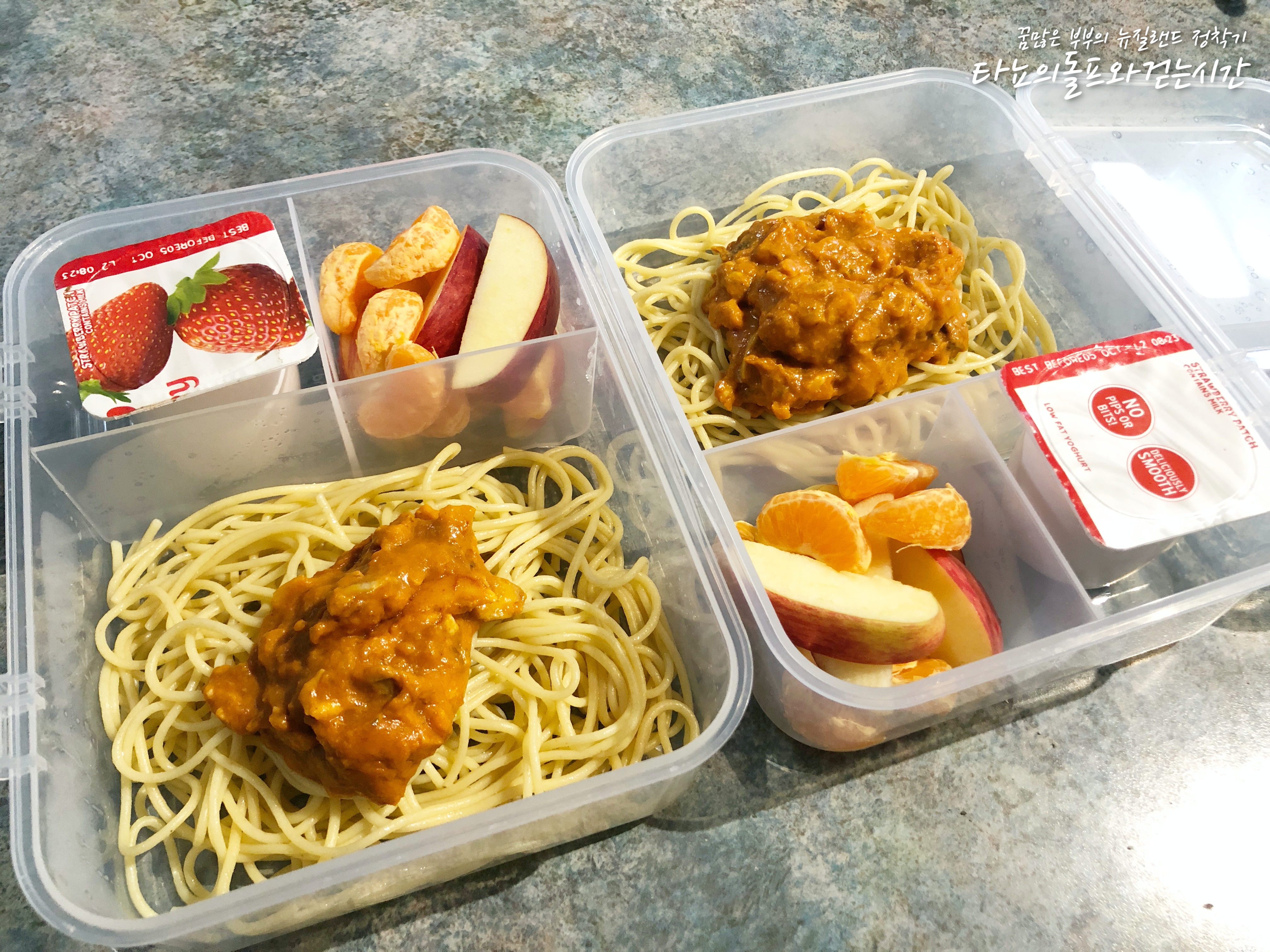 토마토 스파게티, 딸기 요거트, 사과, 귤 함께 준비했어요. 둘째가 자꾸만 [ 이모, 나도 라면 싸줘 ] 그러더라고요. 애들이 라면을 싸올리는 없는데 대체 뭘까 싶었어요. 알고보니 스파게티였답니다. 이렇게 보내면 차갑게 식은 스파게티를 점심 때 먹는데요. 차가워도 굉장히 맛납니다.