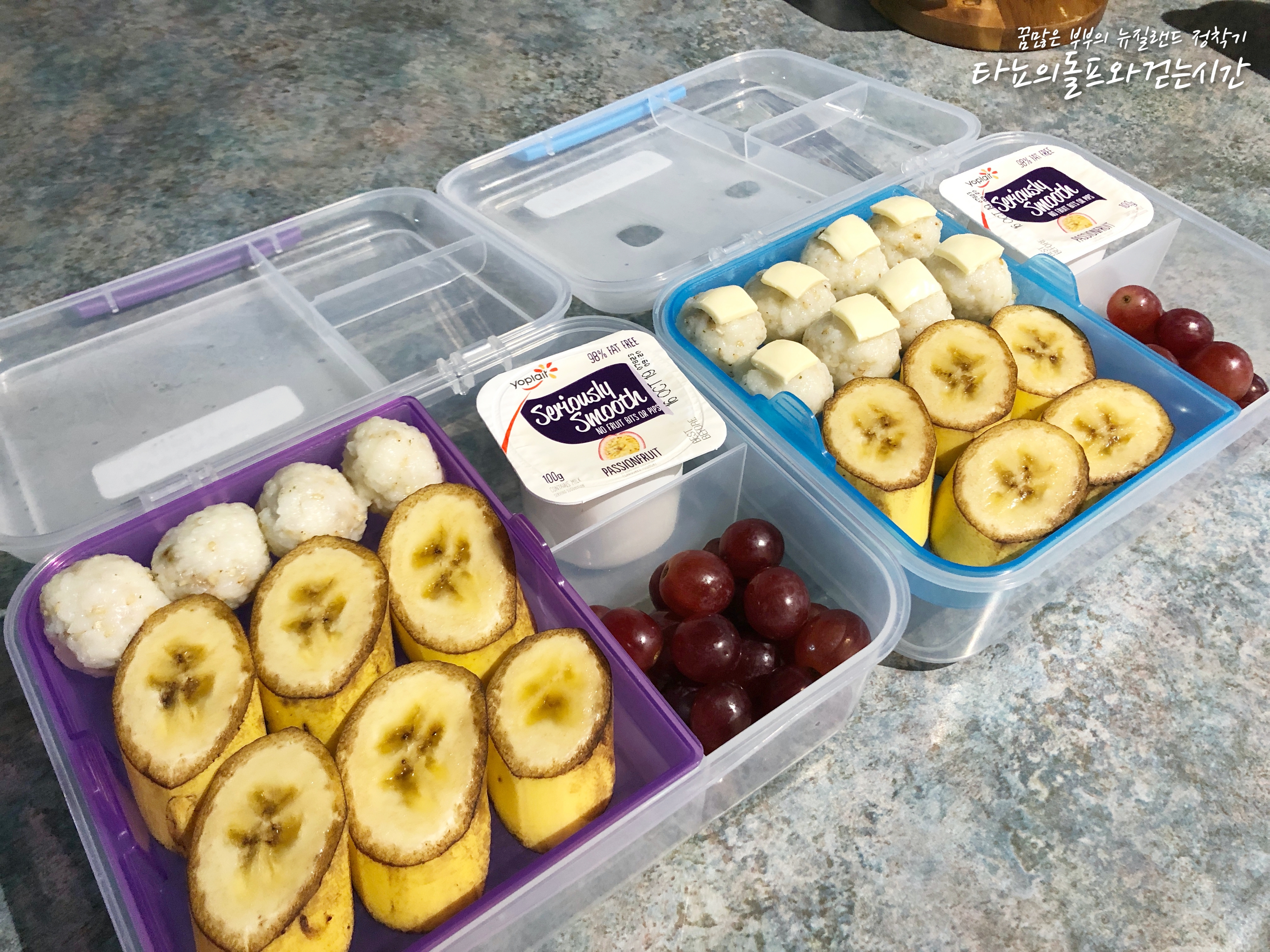 작은 주먹밥을 만들었어요. 밥 안에는 고기를 쏙쏙 박아 넣었습니다. 바나나, 포도, 패션후르츠 요거트 준비했어요.