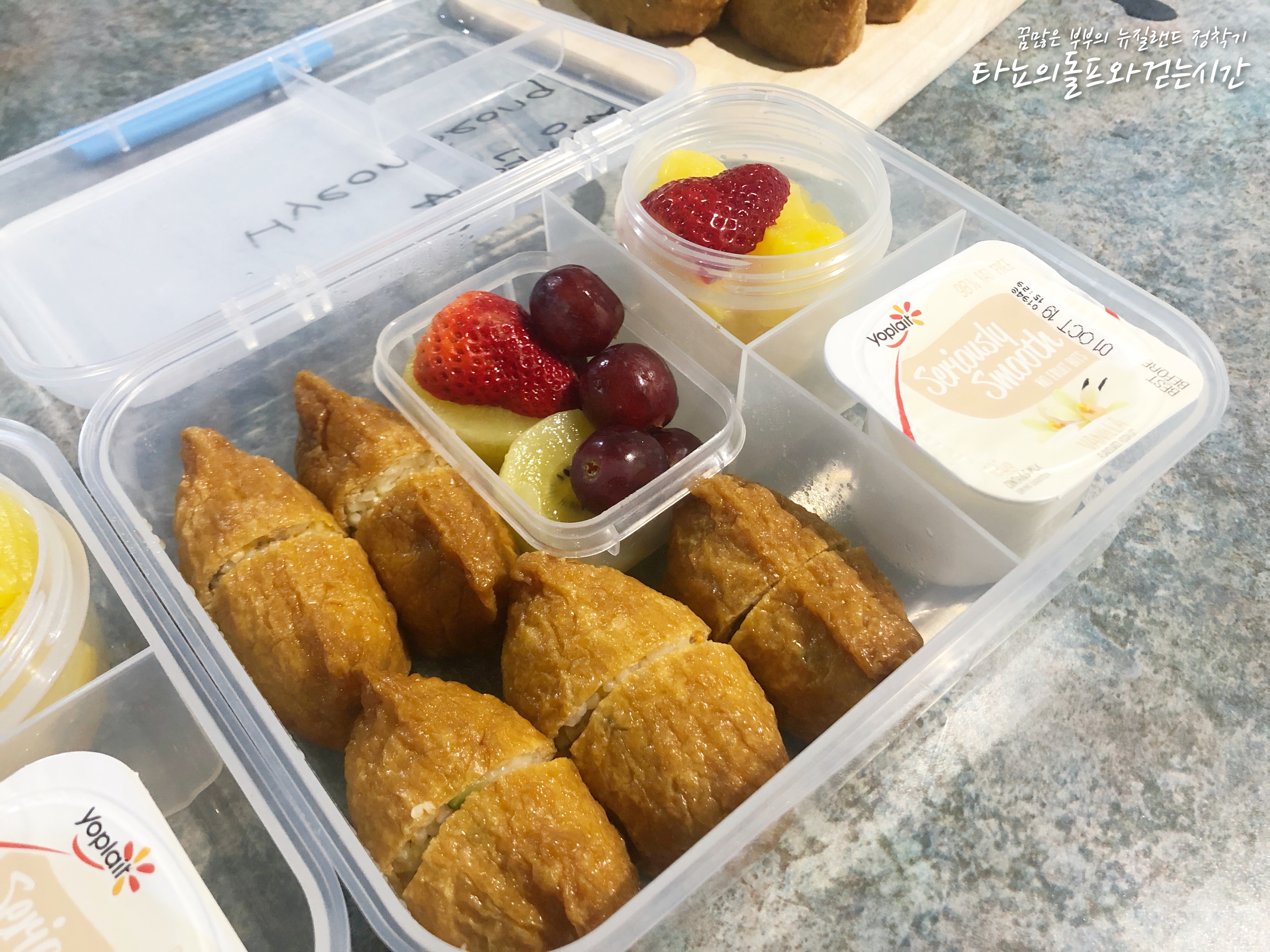 다진 소고기, 햄, 각종 야채와 단촛물을 넣어서 만든 유부초밥과 바닐라 요거트, 파인애플, 딸기, 골드키위, 씨없는 포도를 넣었어요. 입이 작아서 먹기 어려운 아이들을 위해 유부초밥은 반으로 잘라서 넣었습니다.