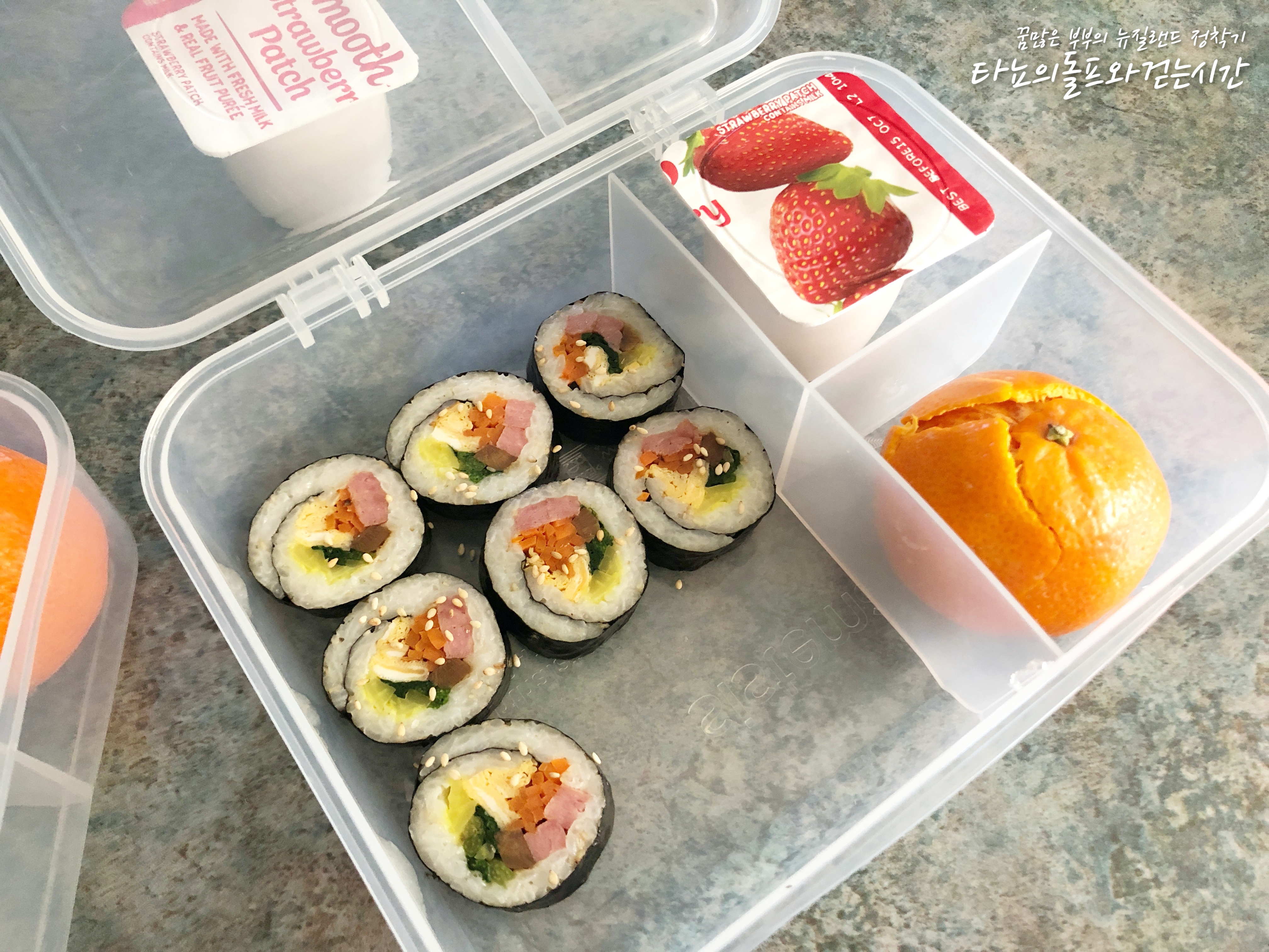 스팸, 달걀, 각종 야채를 듬뿍 넣은 김밥과 귤, 딸기 요거트 준비했어요. 오른쪽 김밥은 저희 신랑 도시락이에요.