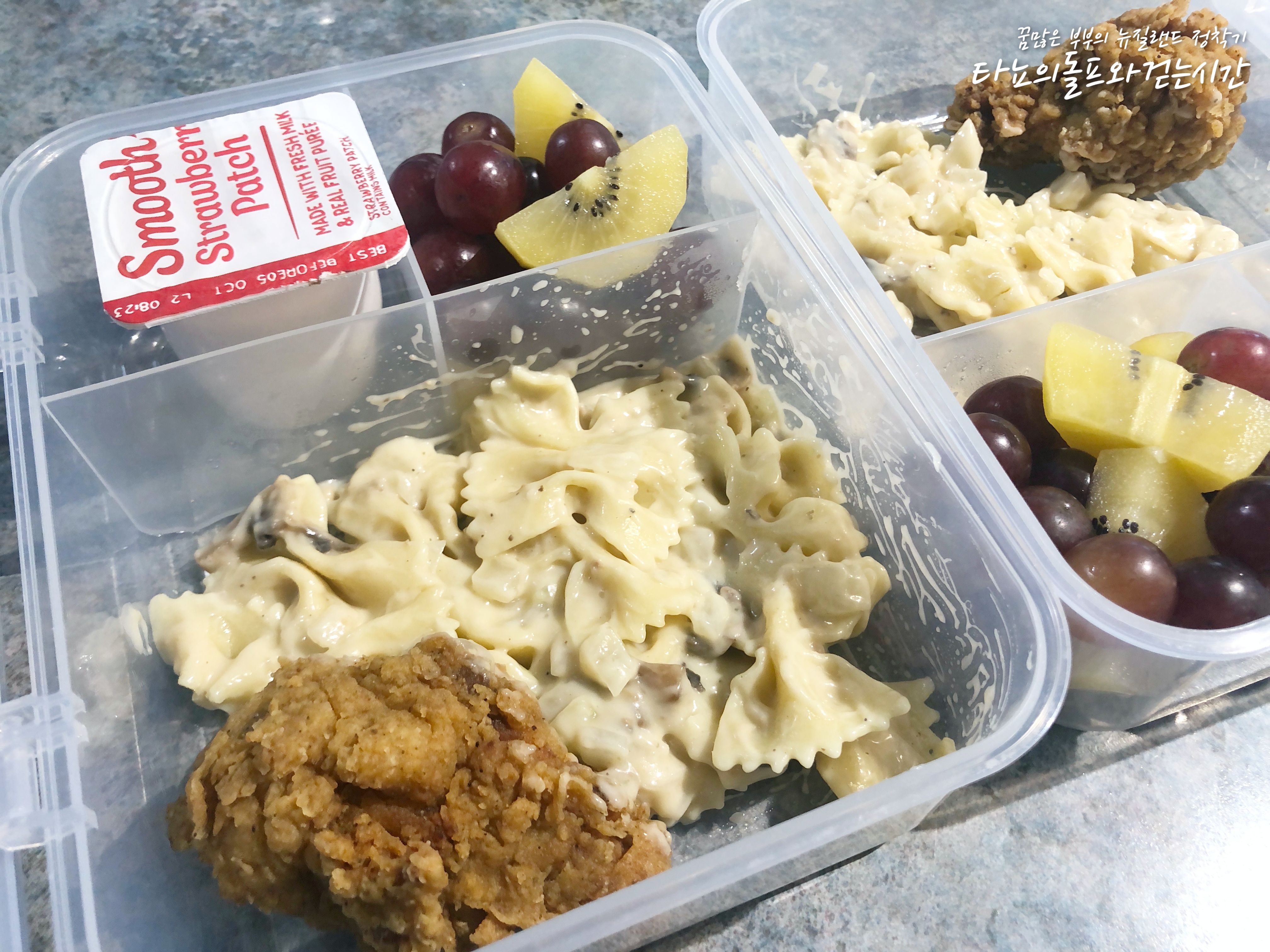 이 메뉴는 보타이 모양의 파스타를 처음 접해보는 조카들이 아주 좋아했었답니다. KFC 위키드윙 하나씩 같이 넣어줬어요. 치킨이라면 아주 좋아하는 아이들인데 크림 파스타와 함께 먹는다면 최고의 조합이죠. 딸기요거트, 포도, 골드키위 함께 넣었어요.