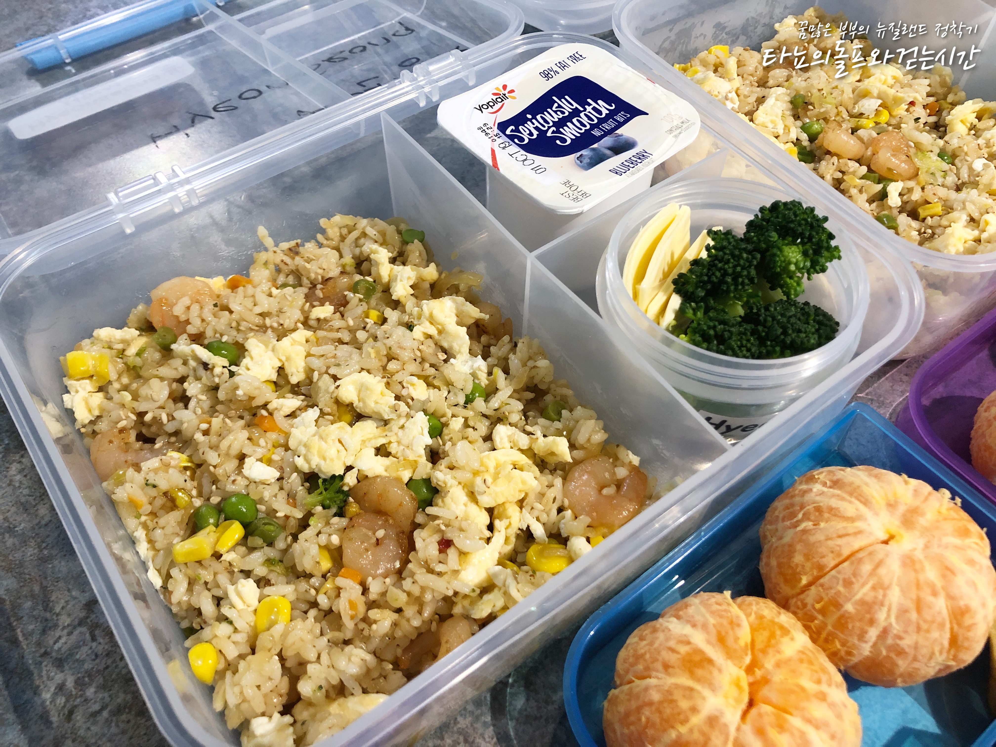 아이들이 굉장히 좋아한다는 새우볶음밥은 넉넉하게 준비했어요. 브로콜리, 치즈, 블루베리 요거트, 귤 함께 준비했습니다.