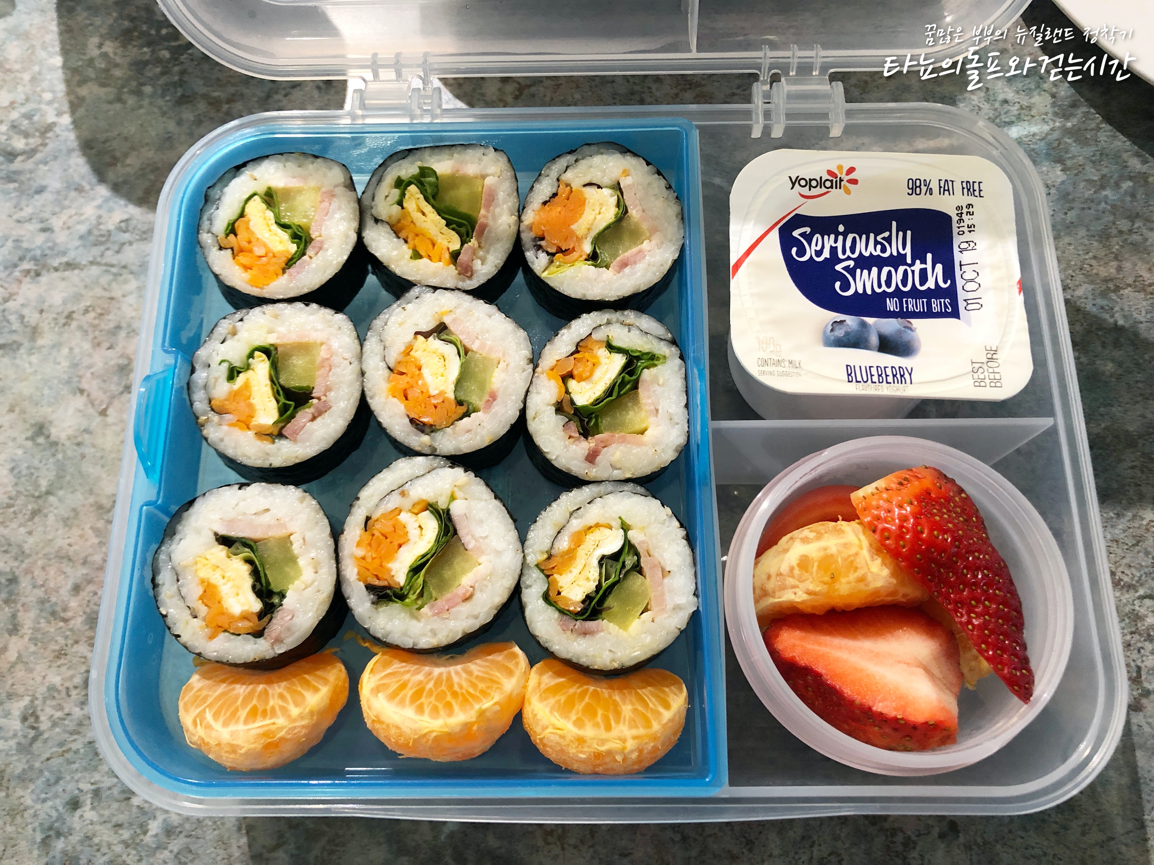 베이컨, 달걀, 각종 야채를 넣은 김밥과 귤, 딸기, 블루베리 요거트 함께 준비했어요.