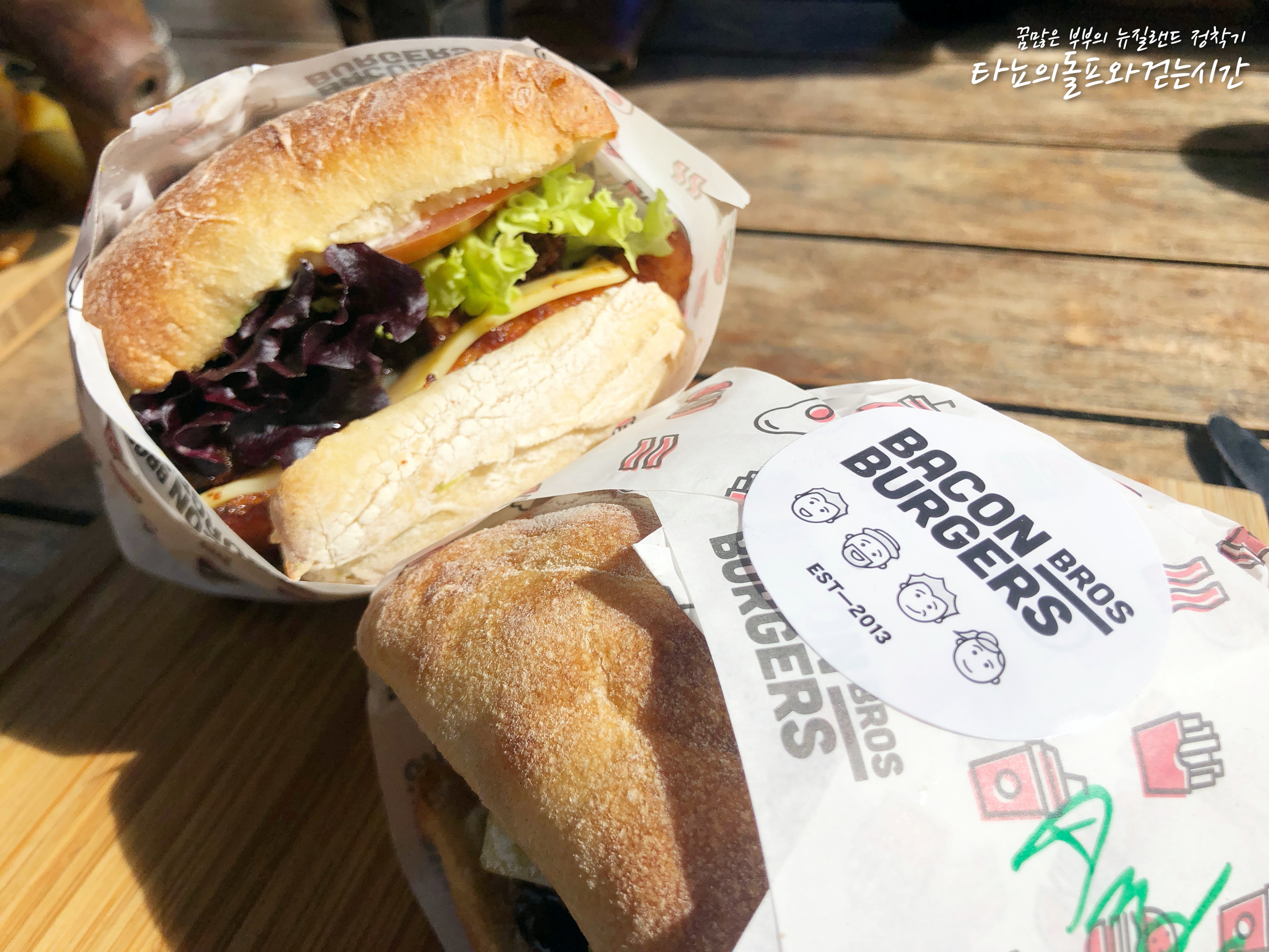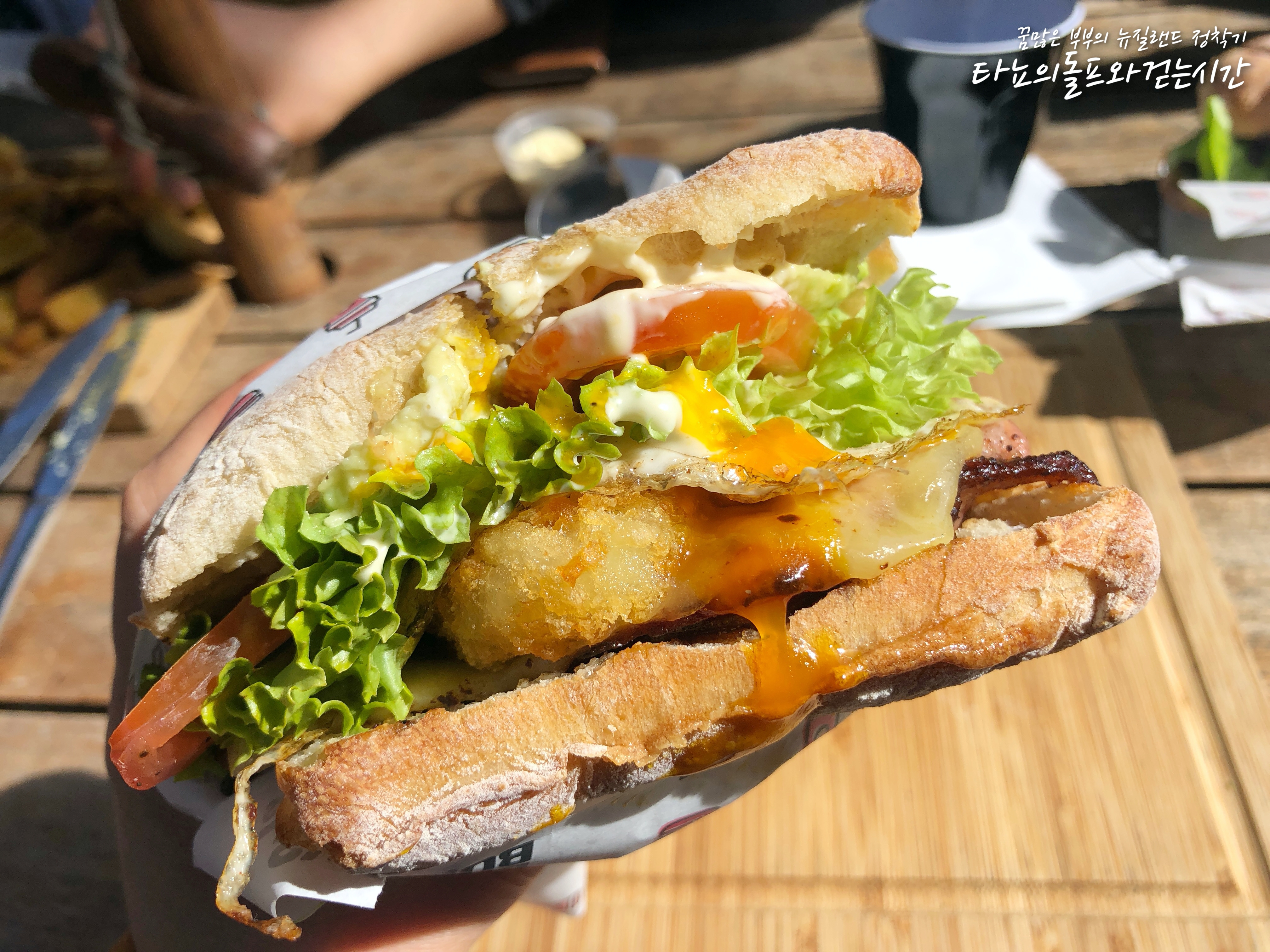 치아바타 빵으로 만든 버거인데 버거보다는 샌드위치에 가까워서 저희는 샌드위치라고 말하는 편이에요. 샌드위치인데 식빵에 비하면 빵이 꽤 딱딱한 편이라 솔직히 저는 먹을 때 턱이 좀 아팠습니다.