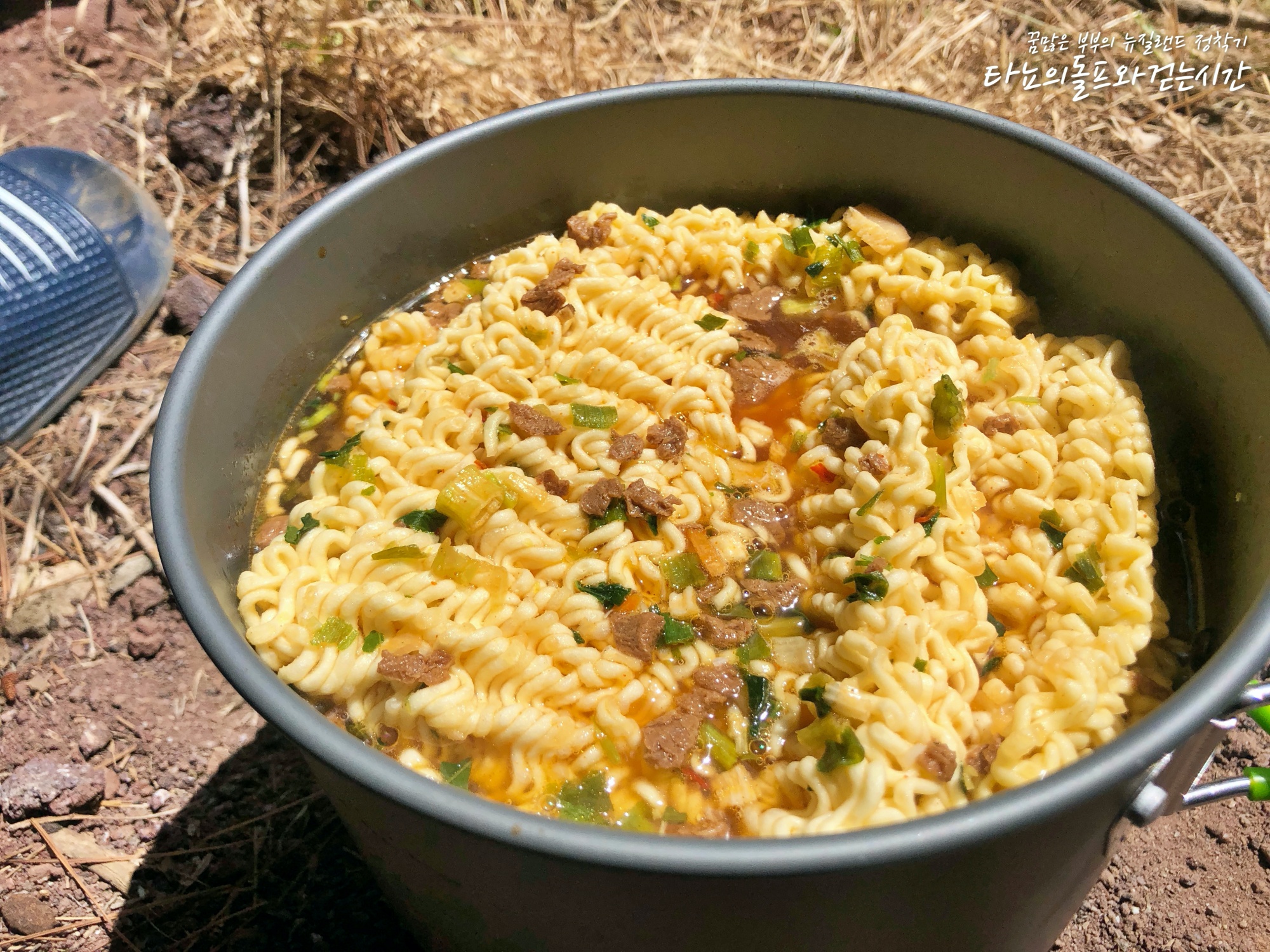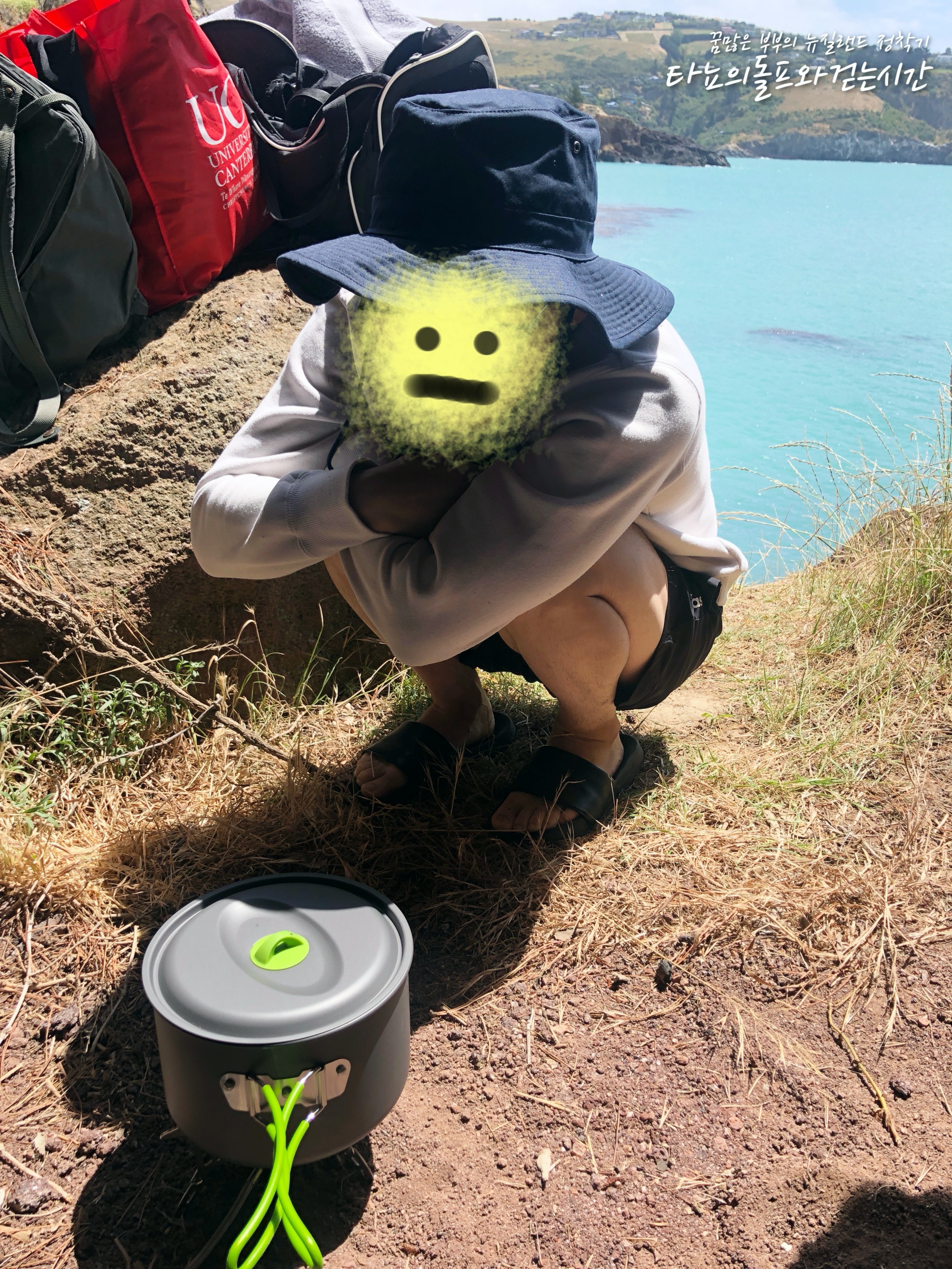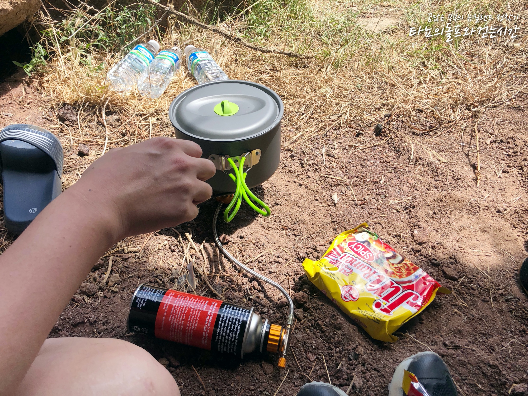 가까운 곳에 바람이 들지 않는 아주 작은 동굴 비슷한 공간이 있어서 저희는 자리를 깔고 라면 물을 올렸습니다. 라면은 역시 바닷바람 쐬며 먹는 라면이 최고지요. 캠핑용 가스불을 사용했더니 화력이 좋아서 순식간에 물이 끓기 시작했어요.