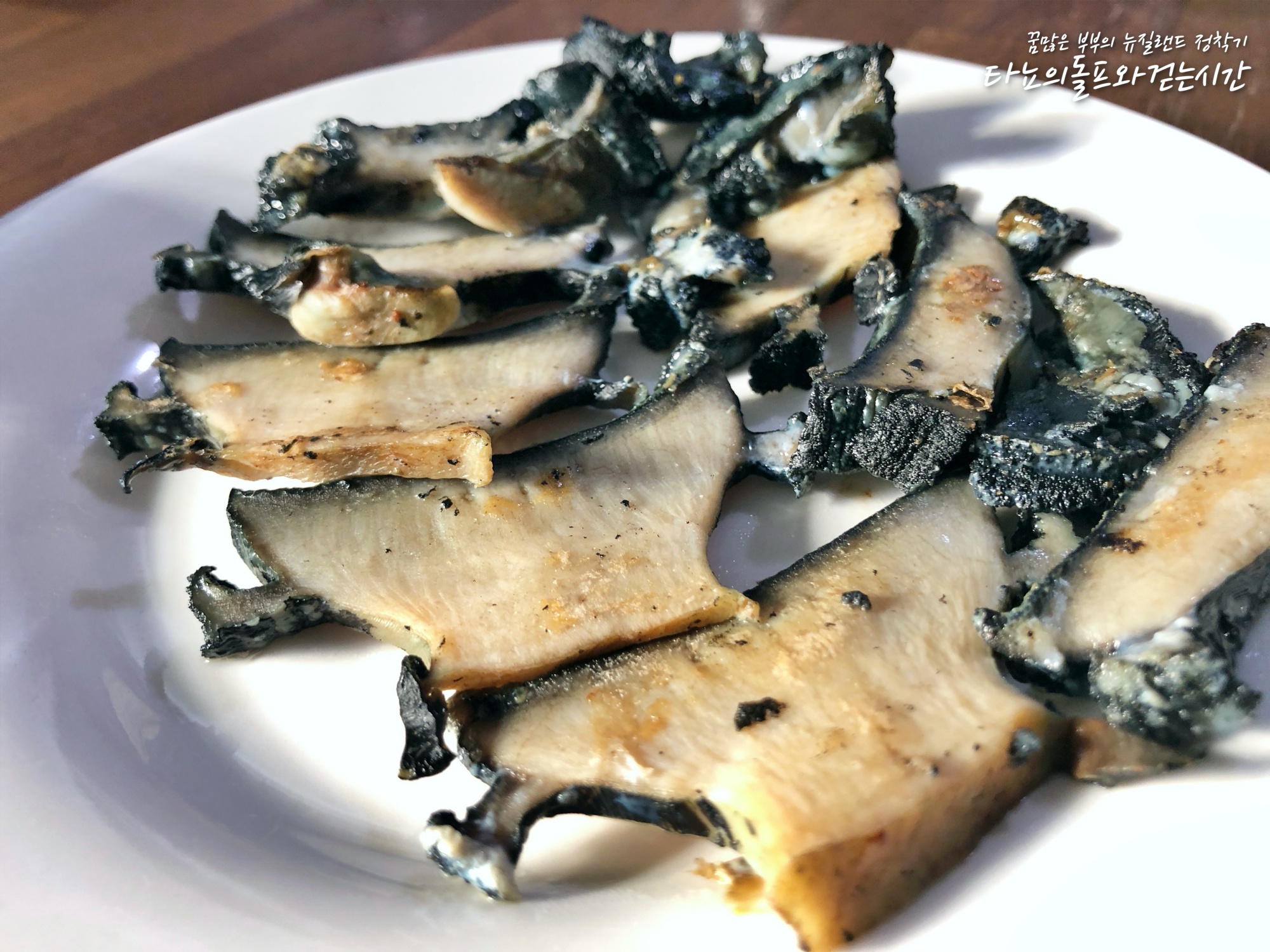 구운 흑전복 잘라서 내니 이런 모양이 되었어요. 정말 버섯 구운 모양과 비슷하지요? 아주아주 부드럽고 맛이 좋았습니다. 신랑이 이 맛있는 것을 먹지 못한다는게 마음이 아팠어요. 너무너무 맛있는데!