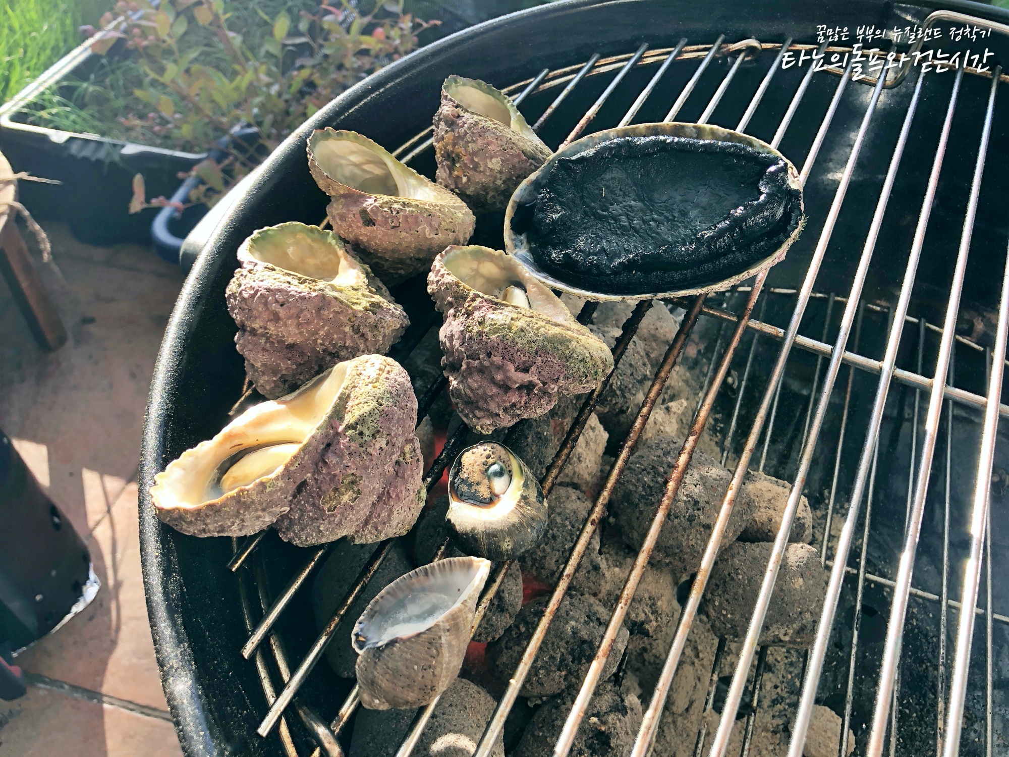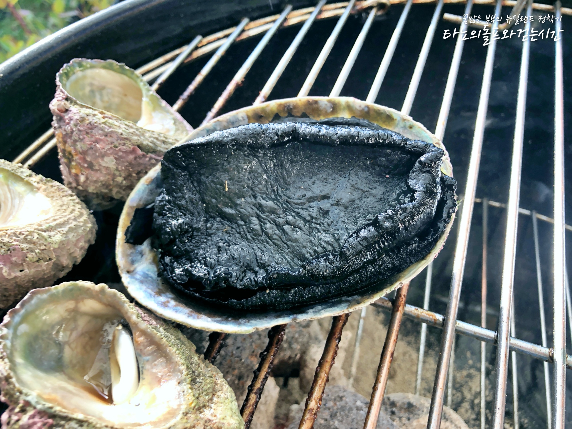 뉴질랜드의 흑전복은 날 것으로 먹어도 굉장히 오독오독하고 맛있지만, 구워서 먹어도 참말로 맛있습니다. 친구의 말에 따르면 물 속에 전복이 뿌려놓은 듯이 정말 많았지만, 대부분 10cm~ 11cm사이의 정말 아쉬운 크기라서 딸 수가 없었다고 합니다. 사진 속 저 전복은 딱 12.5cm입니다. 그 많은 전복 속에서 딱 1개 건졌답니다.