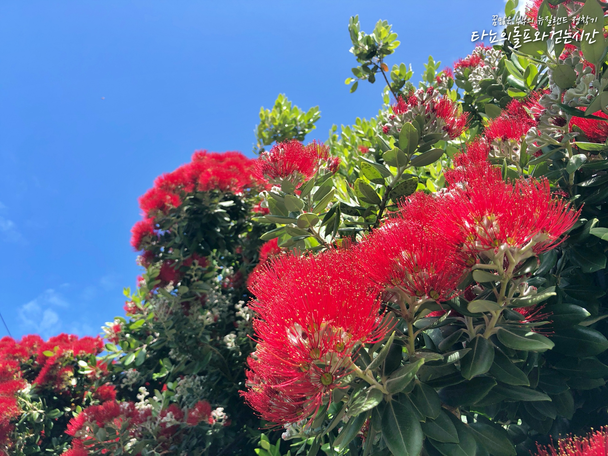 트랙이 끝나고 테일러 미쓰테이크 해변으로 이어지는 길목에 아름답게 핀 '포후투카와' 나무의 꽃이 보입니다. 사진으로 봐도 정말 아름답죠? 실제로 보면 더 아름답습니다. 이 꽃은 11월 초부터 1월 말까지 피는 꽃인데 크리스마스 시즌에 맞춰 피어나는 붉은 꽃이라해서 뉴질랜드의 '크리스마스 트리'라고 불리고 있습니다.