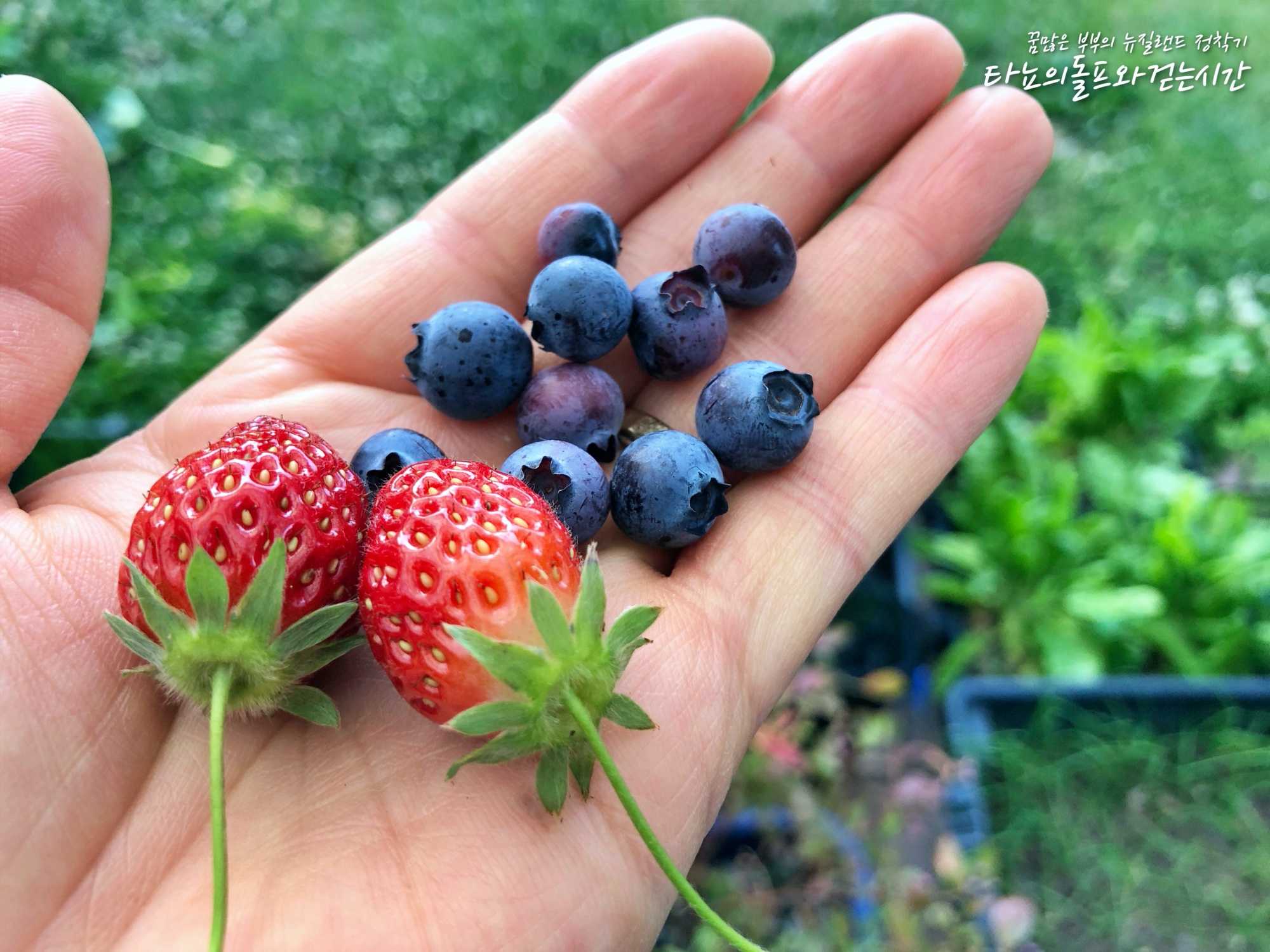 입가심으로 정원에 열린 딸기와 블루베리 따서 먹었습니다. 새들이 탐내기 전에 어서 망을 제대로 쳐야할 것 같아요.