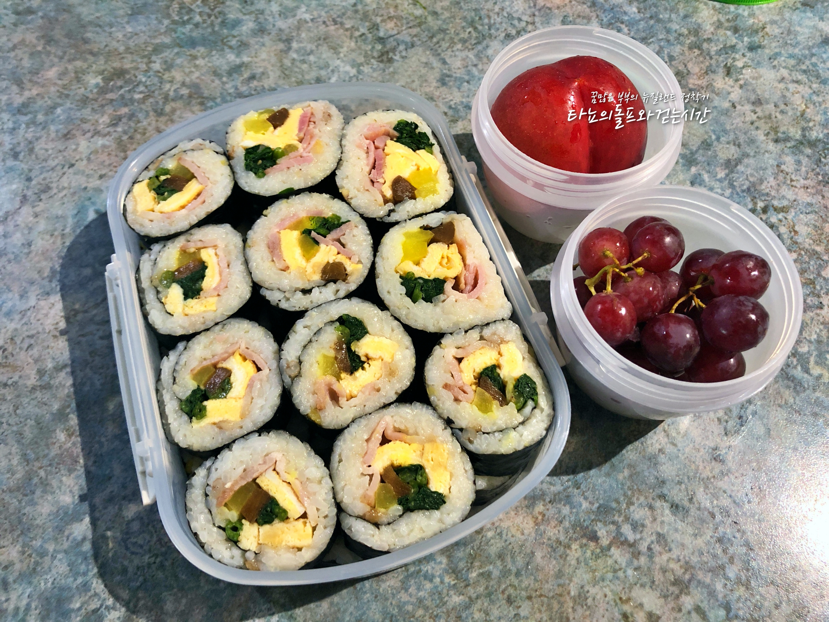 이 번주는 도시락 끝~ 목요일이 와이탕이 데이(뉴질랜드의 국공일)라서 학교도 쉬는 날입니다. 그래서 한 주의 마지막 도시락을 기념하며 김밥을 쌌습니다. 있는 재료만 쏙쏙 꺼냈더니 당근도 없고 햄도 없네요 ^^;; 베이컨이 있어서 넉넉하게 넣었습니다. 신랑은 치즈를 넣어주니 정말 좋아하더군요. 당근 없으니 색이 우중충합니다. 다음에는 꼭 넣어야겠어요.