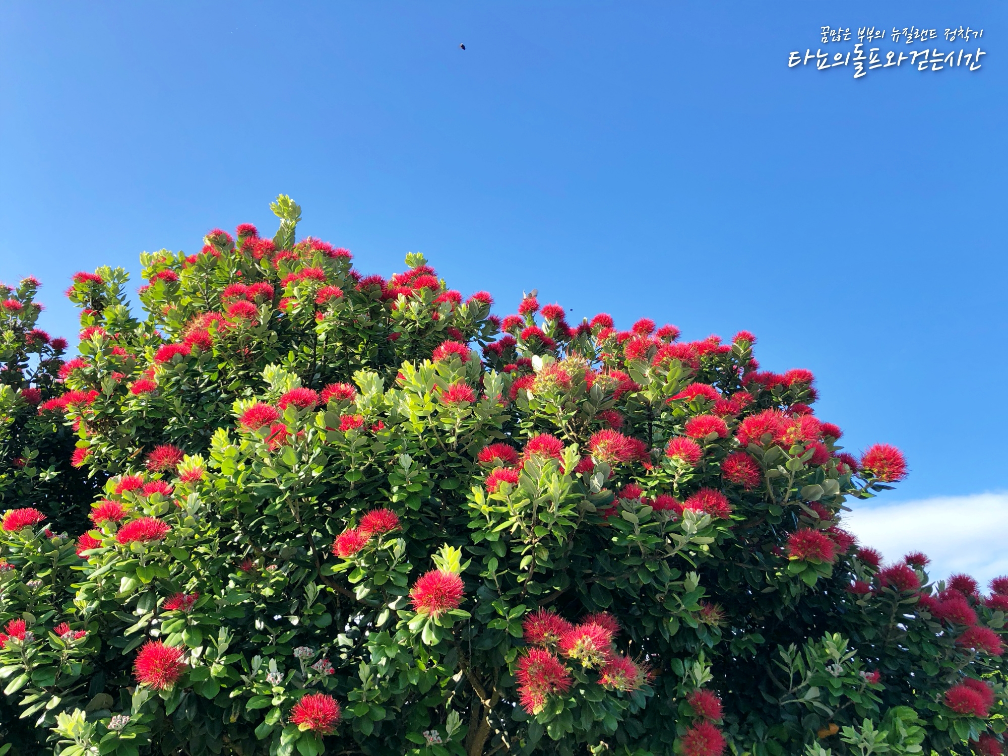 11월에서 2월, 뉴질랜드에서 흔하게 만날 수 있는 아름다운 꽃나무, '포후투카와(Pohutukawa)'입니다. 아주 붉게 핀 모습이 크리스마스 장식을 한 듯 보인다고 '크리스마스트리'라는 애칭을 가지고 있는 나무예요. 파란 하늘을 배경으로 하니 더욱 돋보이는 꽃이죠?