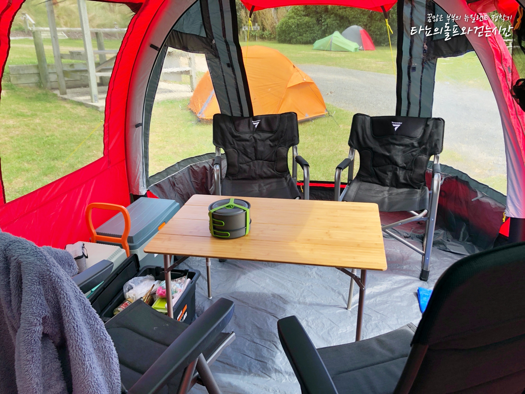 앞과 옆으로 시원하게 뚫린 공간이 많은데 이 곳으로 보이는 파란 하늘과 푸른 나무, 잔디의 모습이 참 아름다운 것 같아요. 지금 사용하고 있는 이 텐트는 잠자는 공간인 이너텐트를 제외하고도 리빙룸의 공간이 참 넓어서 시원시원하게 사용할 수 있어서 좋은 것 같습니다.