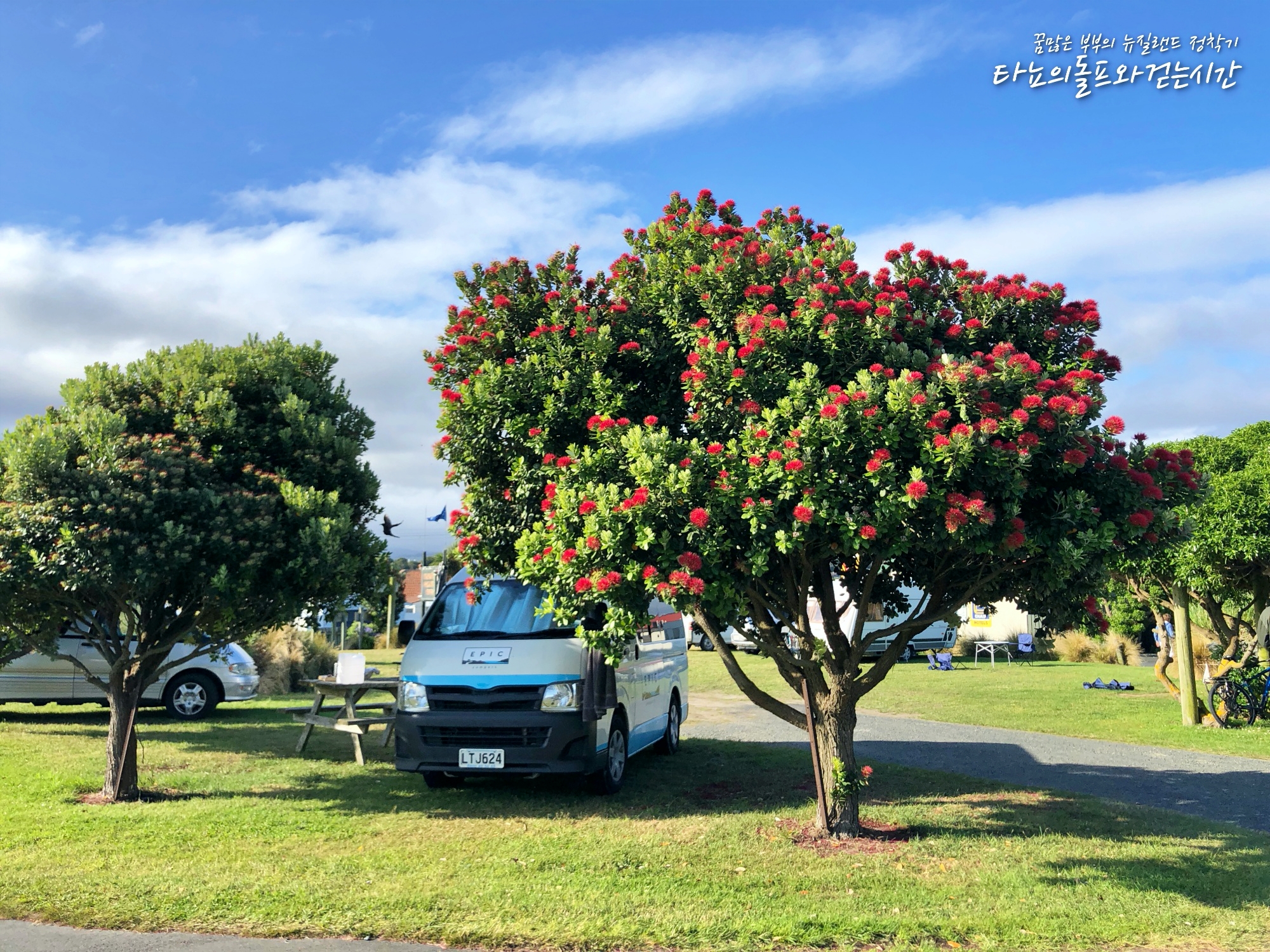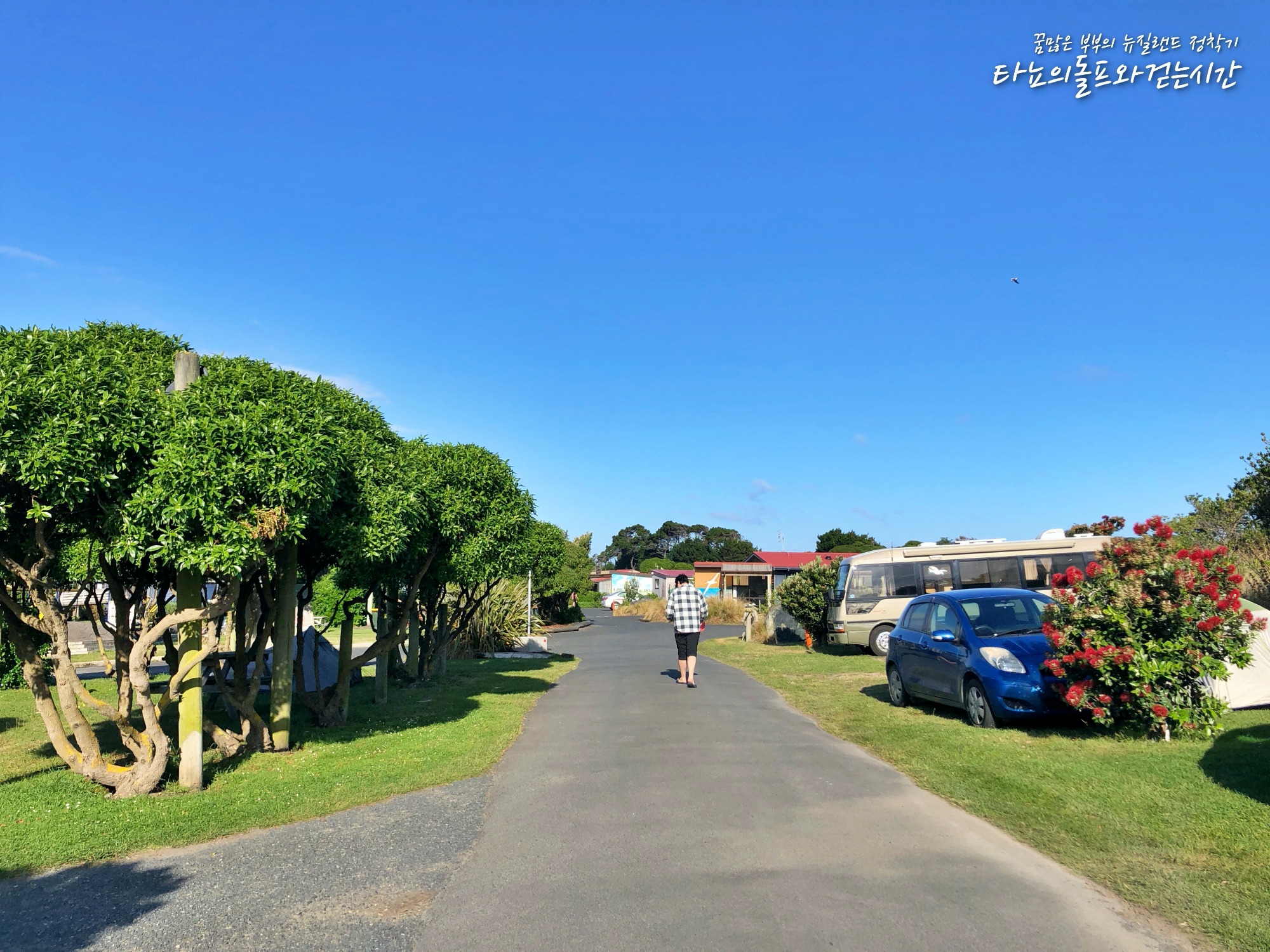더니든은 바닷가에 위치한 대도시에요. 그리고 저희가 머물렀던 홀리데이 파크는 해변가에 위치했죠. 사실 비치 싸인을 보고 사진 속 나무를 지나면 바로 바다가 펼쳐질 줄 알았는데, 생각보다 커다란 잔디공원을 걸어야하더라고요 ^^;; 약간의 배신감은 있었지만? 어쨌든 캠핑장에서 5분만 걸어가면 코 앞에 바다가 있다는거~