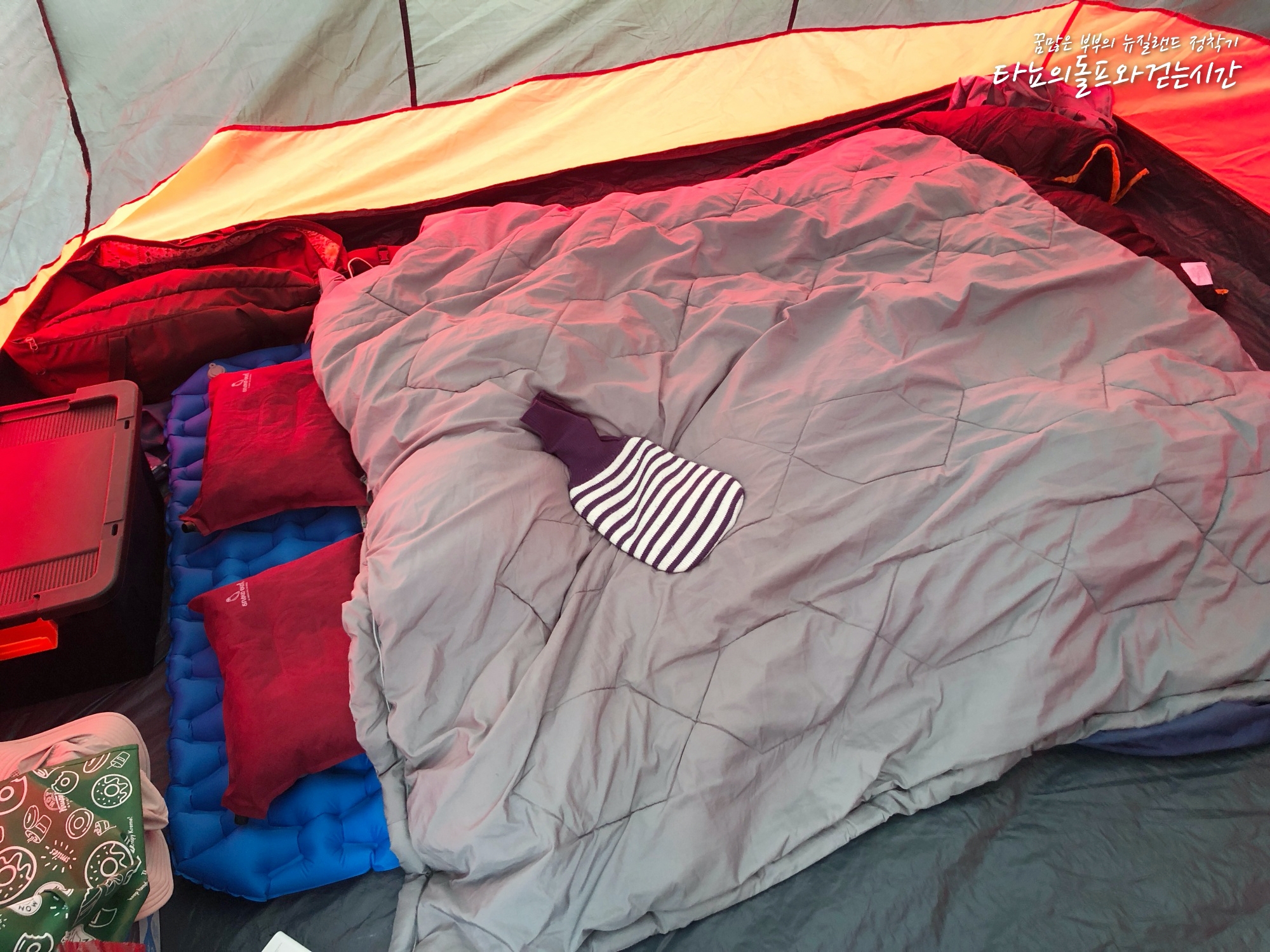 에어매트와 배게는 정말 잘 준비한 것 같아요. 바닥으로부터 올라오는 한기를 차단해주니 몸에 한기가 들어서 새벽에 깨는 일은 없었어요. 게다가 핫보틀까지 있으니 잠드는 순간부터 아침까지 따끈하게 보낼 수 있었죠. 핫보틀은 그저 고무로 만들어진 물주머니일 뿐인데 온기가 이렇게 오래간다는게 참 신기한 것 같아요.